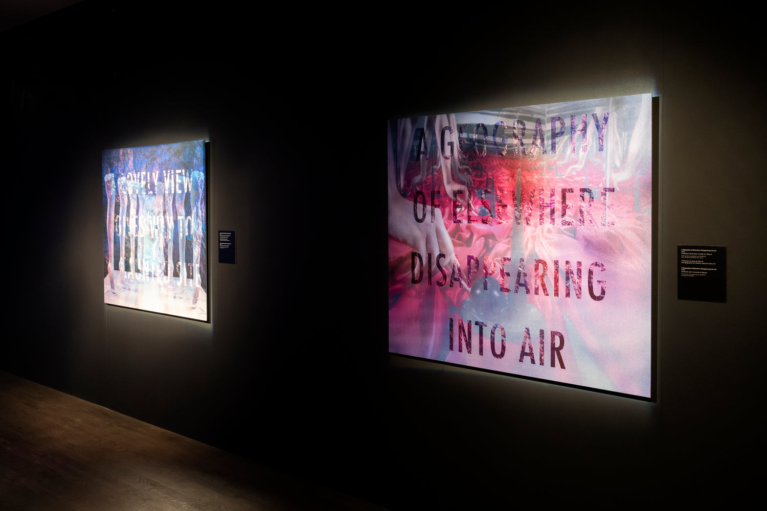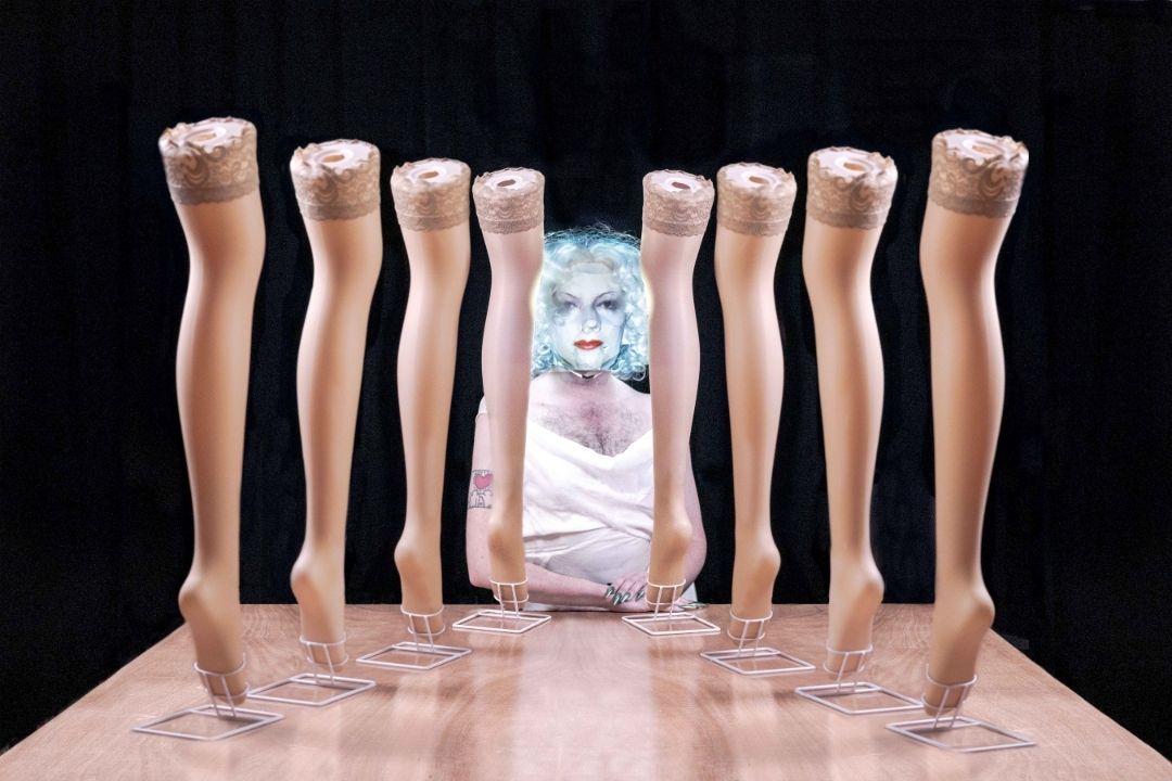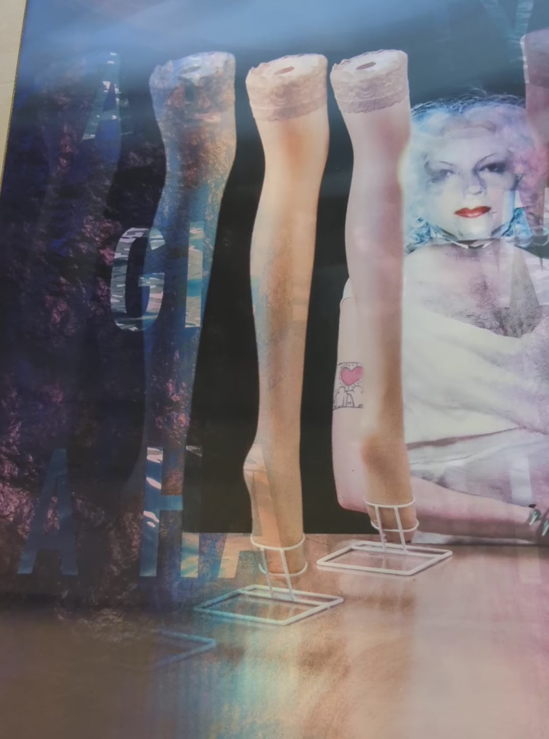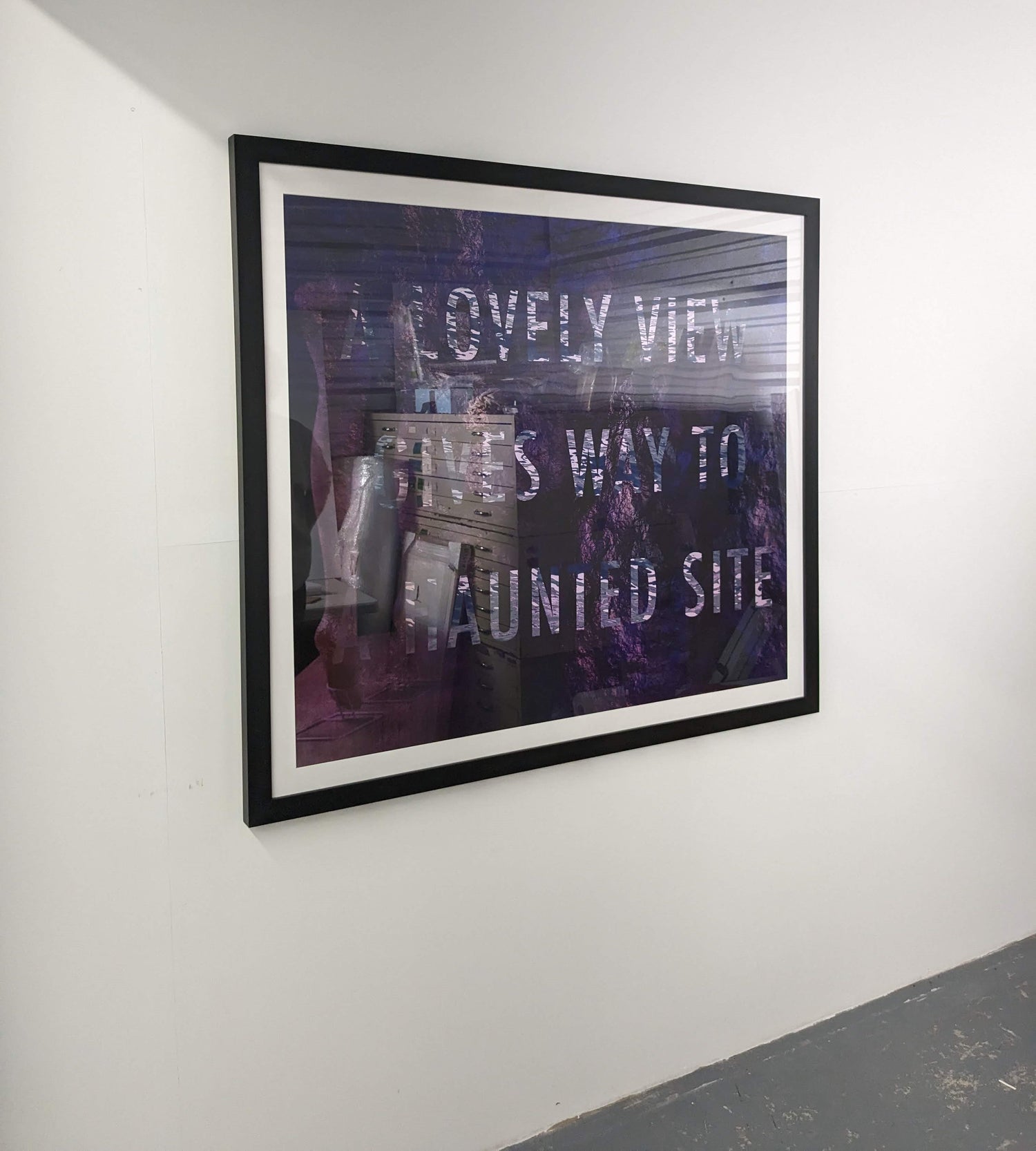 "A Lovely View Gives Way to A Haunted Site" is a lenticular print which premiered at Gallagher's solo exhibition "Mother Memory Cellophane," at MOMENTA Biennial. The exhibition is a series of photographs, and a video work featuring Gallagher performing as the ghost of Miss Chemistry, a mascot figure the Dupont corporation created to advertise their invention of nylon stockings. "A Lovely View" is a reconstruction of an old Dupont nylon advertisement, with Gallagher as the spectre of Miss Chemistry in the foreground. The image shifts from this portrait to a text pulled from the exhibition video, which reads "A Lovely View Gives Way to A Haunted Site."