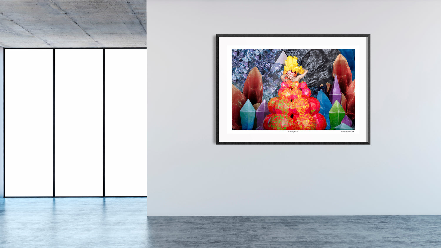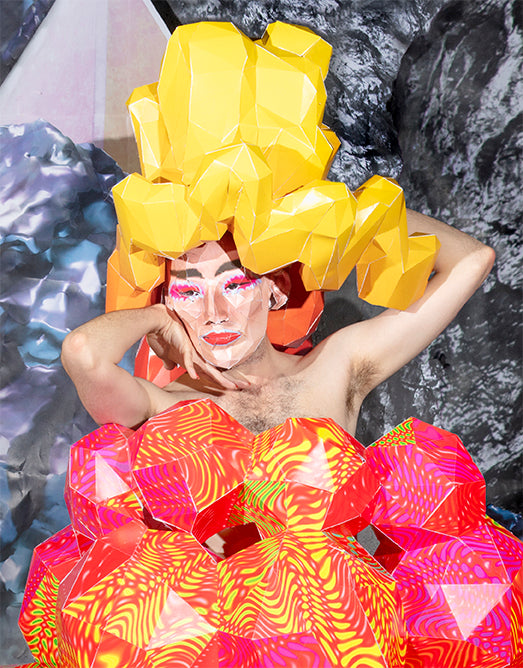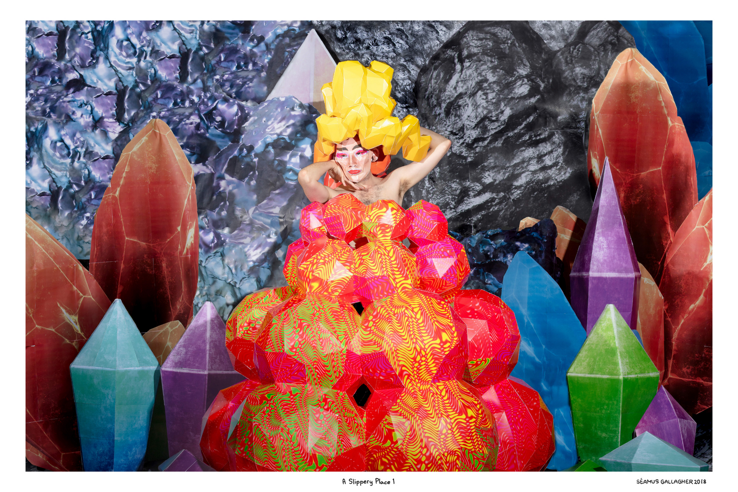 Inspired equally by drag culture and video game aesthetics, “A Slippery Place” touches on themes of identity, embodiment, and fantasy. Through a process of converting digital 3D renderings into paper models, the artist has constructed drag-influenced costumes, wigs, and masks that they wear for this series of self-portraits. By staging these photographs within sets created from images of video game environments, Gallagher is interested in the queering of virtual spaces and blurring the binary of the digital and the physical.
