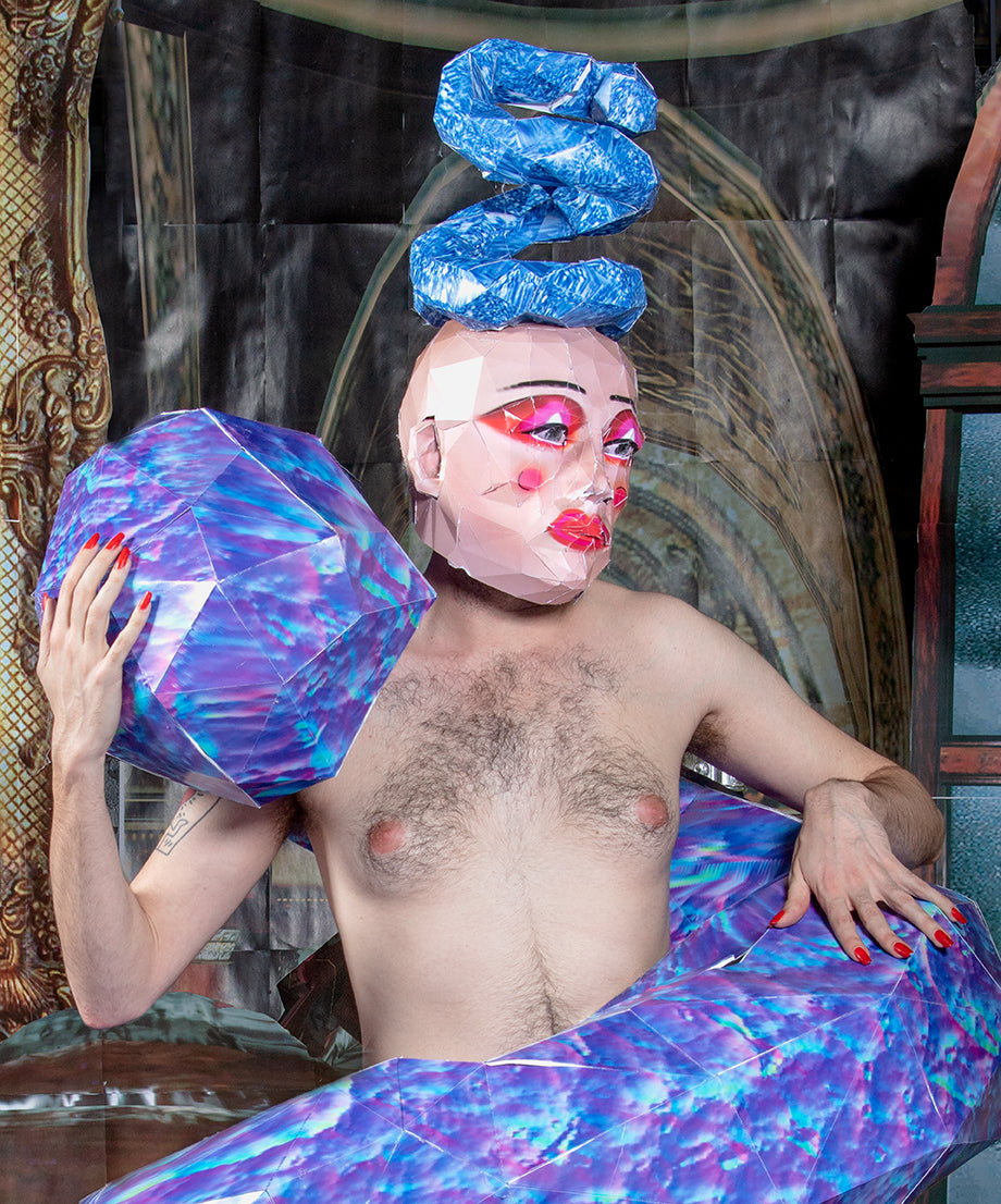 Inspired equally by drag culture and video game aesthetics, “A Slippery Place” touches on themes of identity, embodiment, and fantasy. Through a process of converting digital 3D renderings into paper models, the artist has constructed drag-influenced costumes, wigs, and masks that they wear for this series of self-portraits. By staging these photographs within sets created from images of video game environments, Gallagher is interested in the queering of virtual spaces and blurring the binary of the digital and the physical.