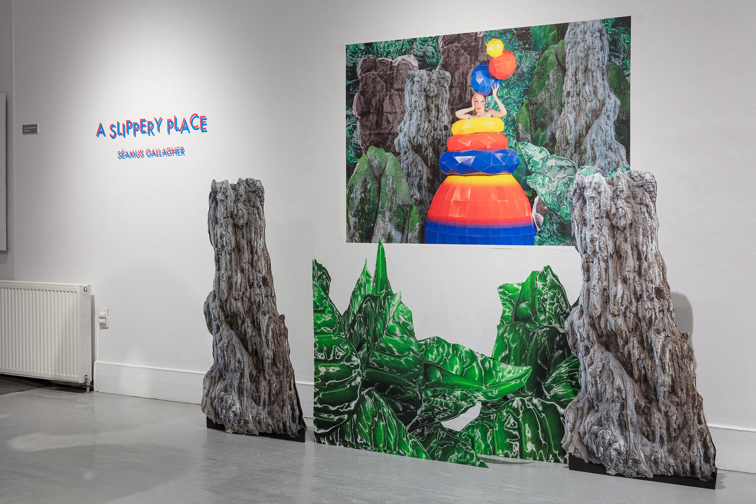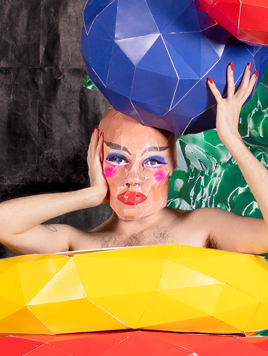 Inspired equally by drag culture and video game aesthetics, “A Slippery Place” touches on themes of identity, embodiment, and fantasy. Through a process of converting digital 3D renderings into paper models, the artist has constructed drag-influenced costumes, wigs, and masks that they wear for this series of self-portraits. By staging these photographs within sets created from images of video game environments, Gallagher is interested in the queering of virtual spaces and blurring the binary of the digital and the physical.