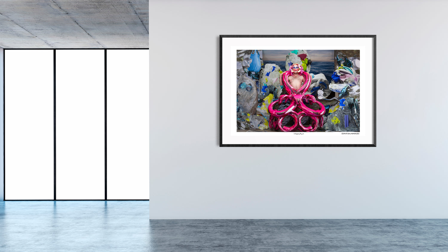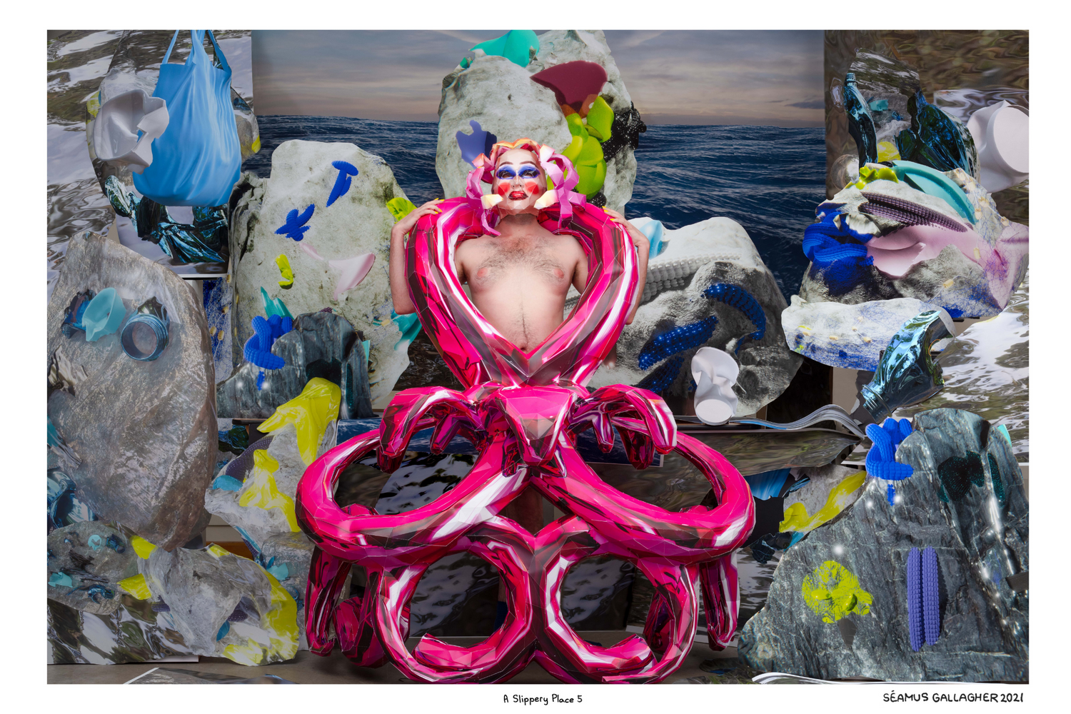 Inspired equally by drag culture and video game aesthetics, “A Slippery Place” touches on themes of identity, embodiment, and fantasy. Through a process of converting digital 3D renderings into paper models, the artist has constructed drag-influenced costumes, wigs, and masks that they wear for this series of self-portraits. By staging these photographs within sets created from images of video game environments, Gallagher is interested in the queering of virtual spaces and blurring the binary of the digital and the physical.