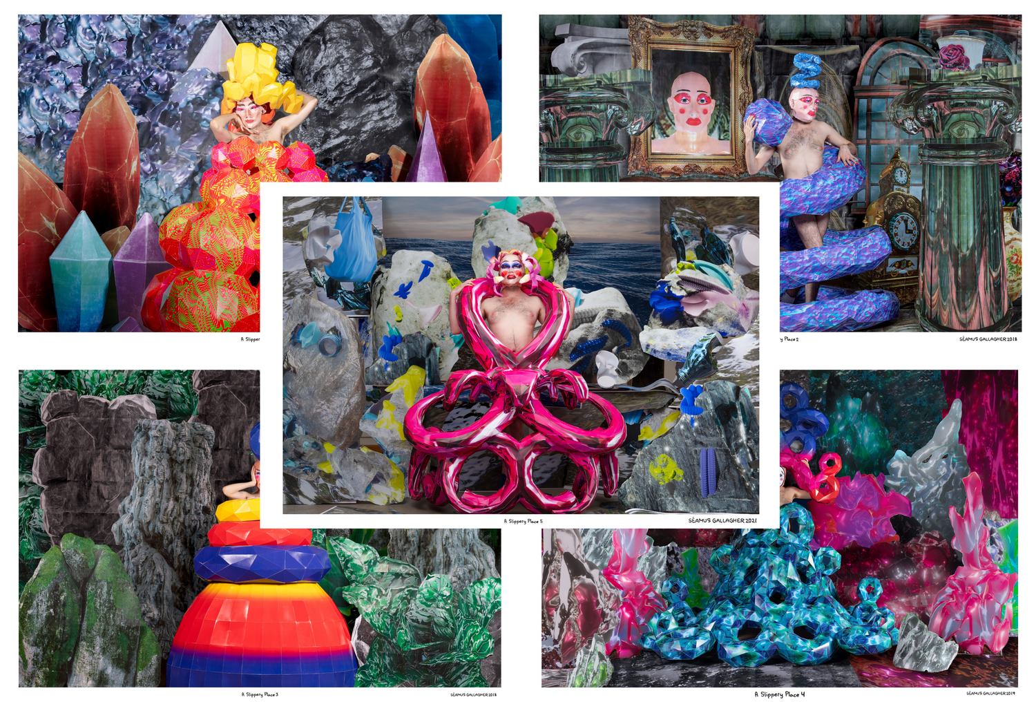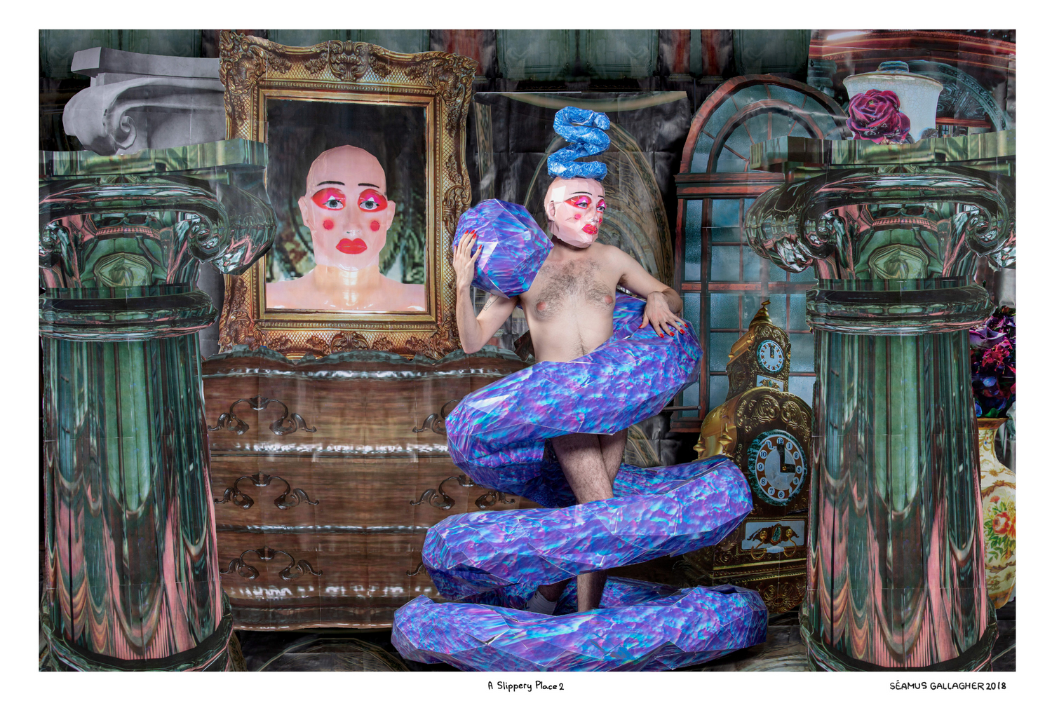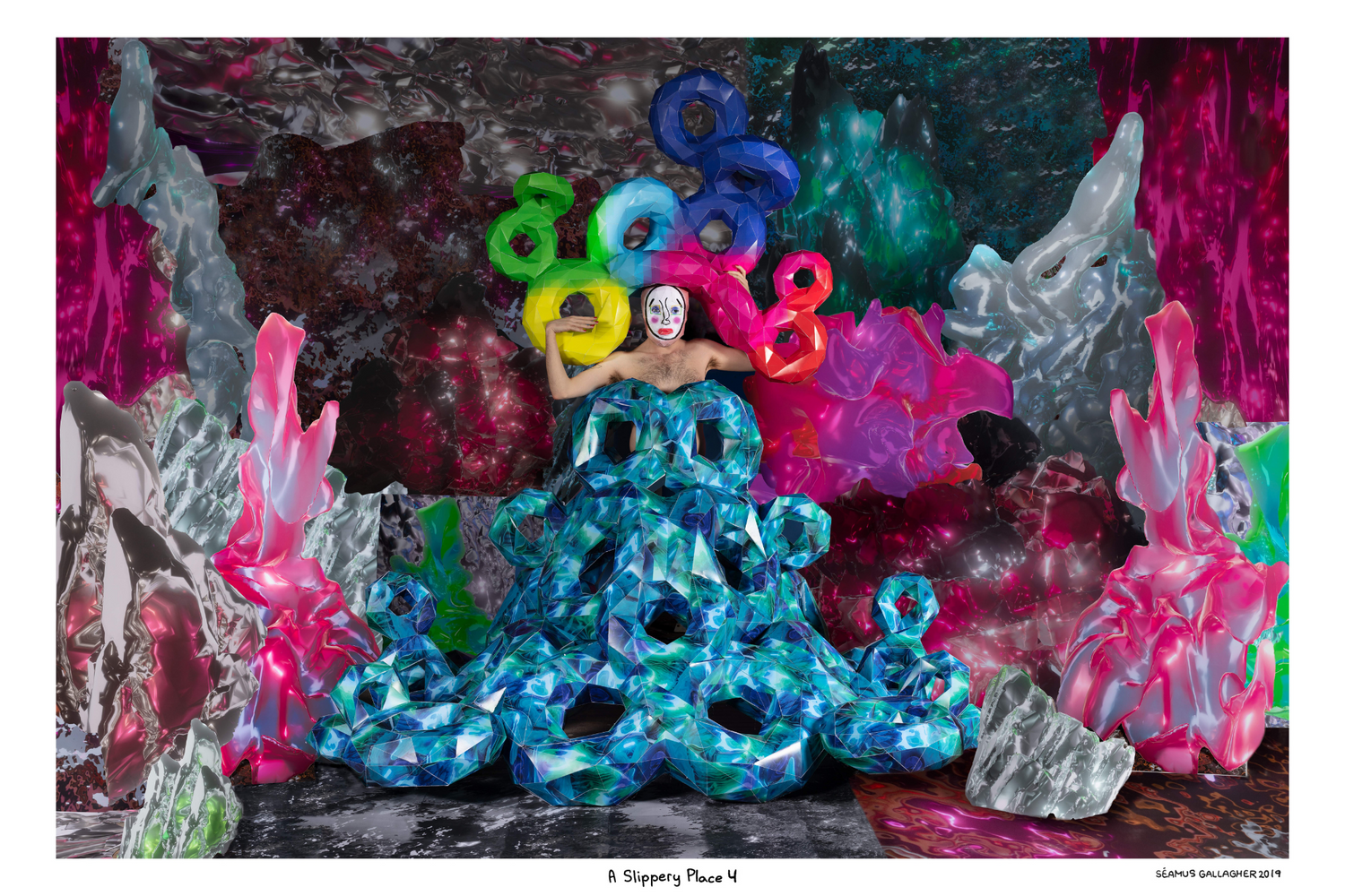 Inspired equally by drag culture and video game aesthetics, “A Slippery Place” touches on themes of identity, embodiment, and fantasy. Through a process of converting digital 3D renderings into paper models, the artist has constructed drag-influenced costumes, wigs, and masks that they wear for this series of self-portraits. By staging these photographs within sets created from images of video game environments, Gallagher is interested in the queering of virtual spaces and blurring the binary of the digital and the physical.