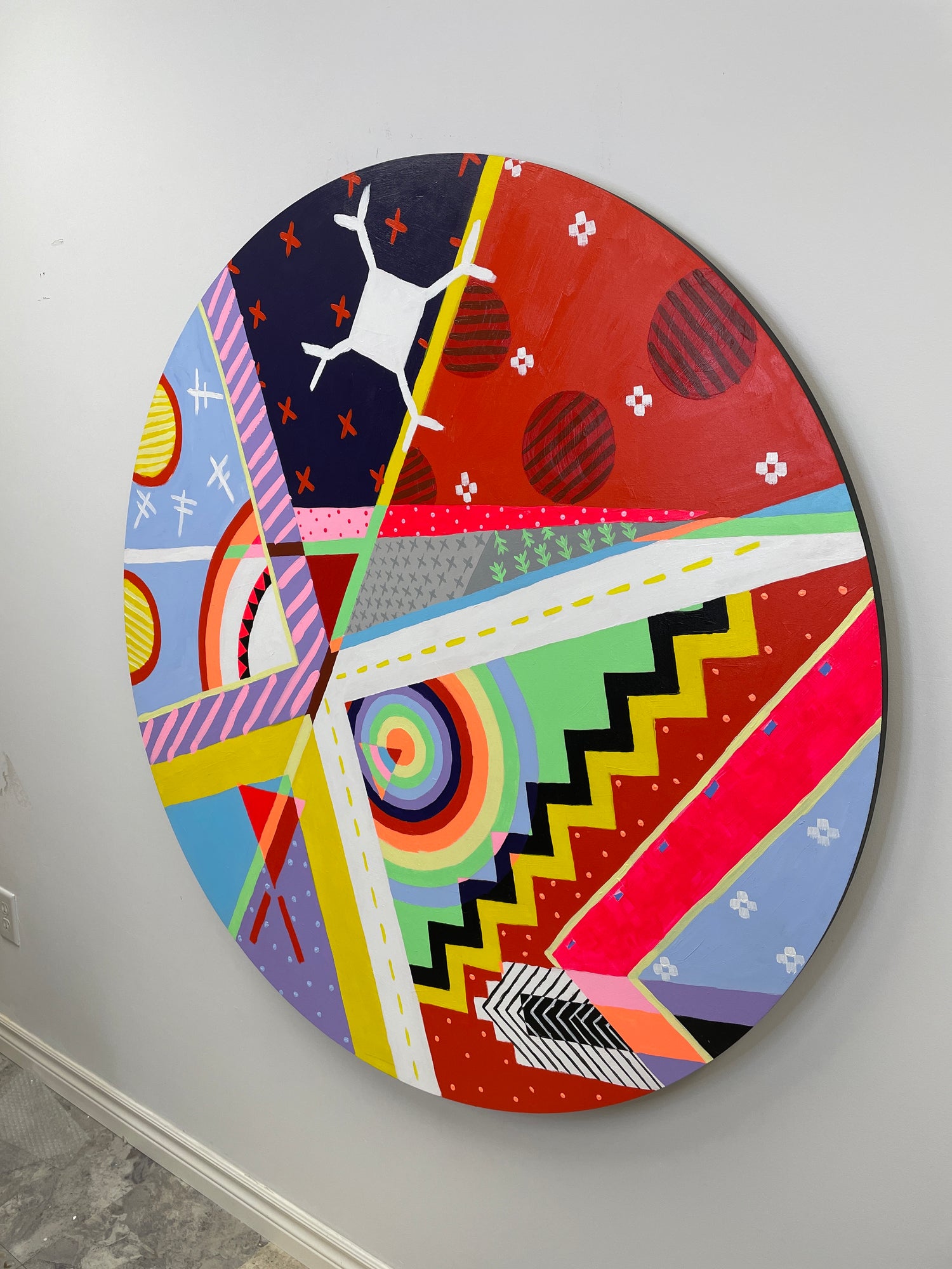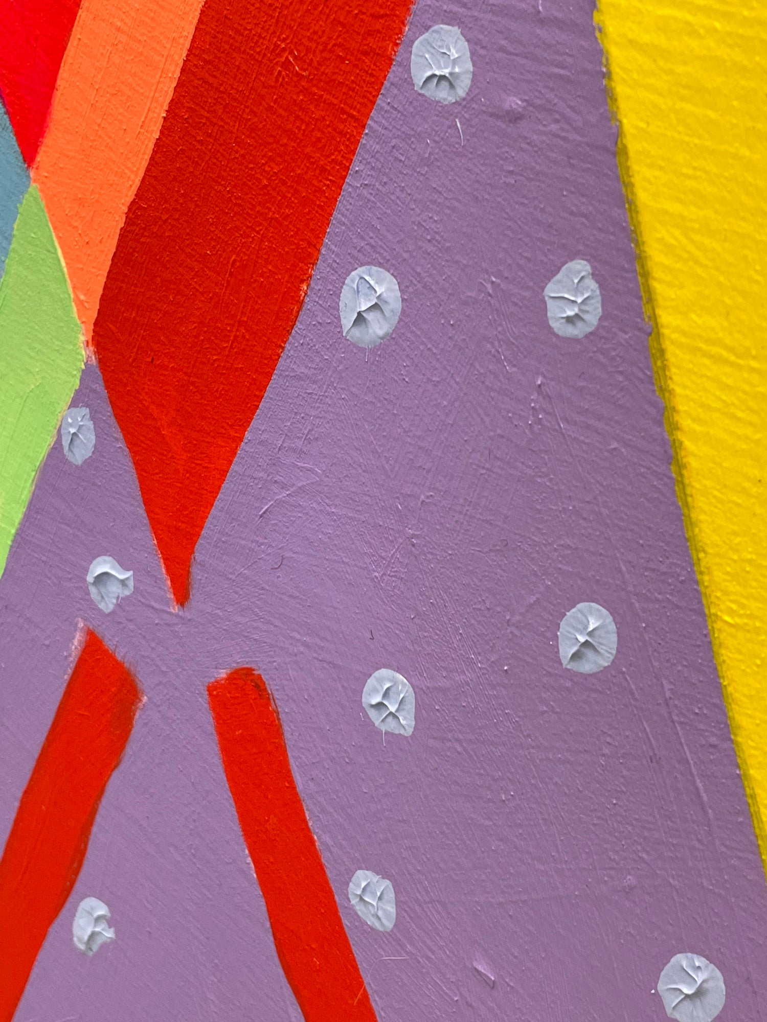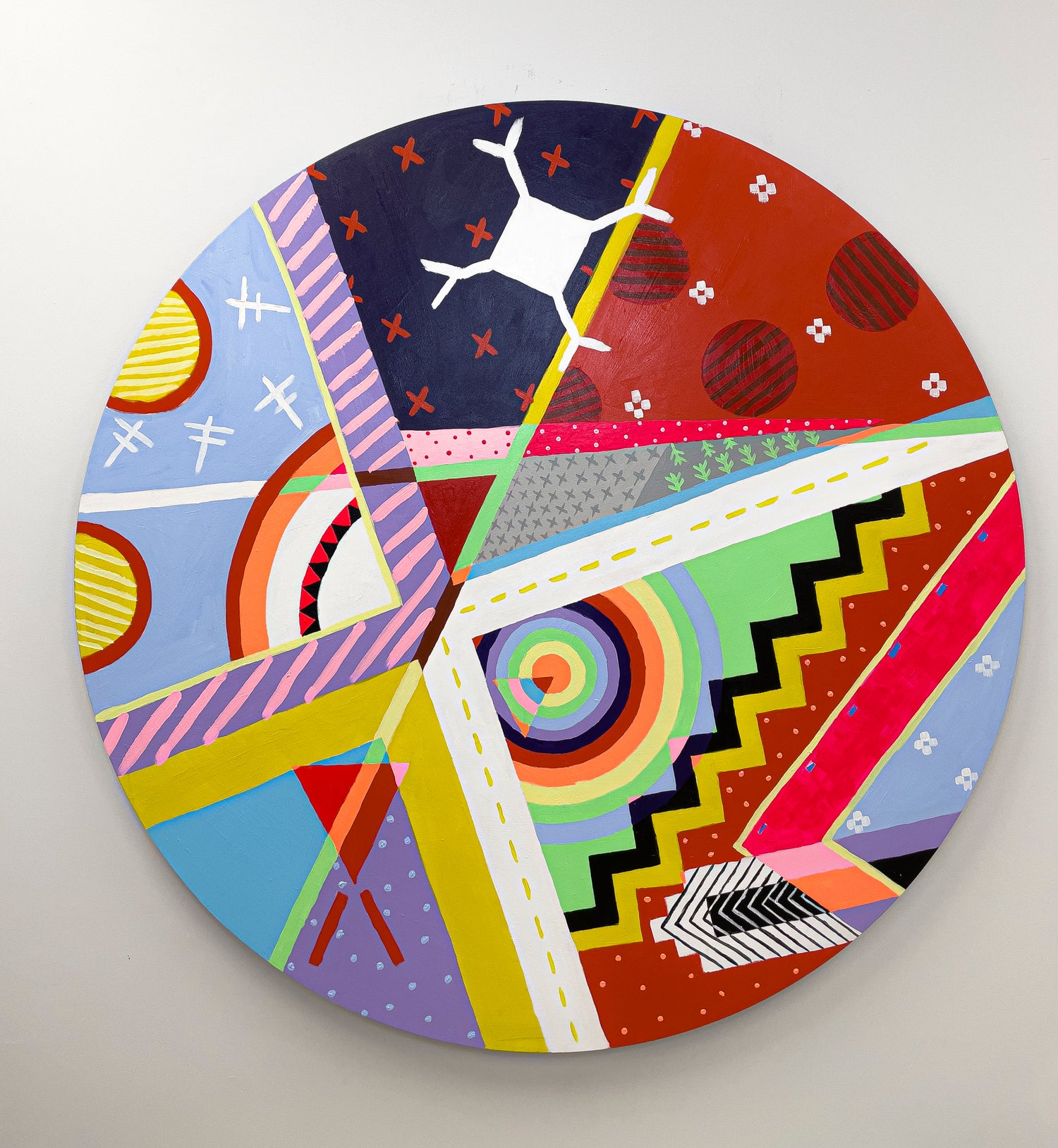Jordan Bennett’s new series marks an experimental departure, where he explores new painting techniques that expand beyond solid blocks of flat colour and sharp lines reminiscent of his ongoing body of work. He explores softer lines, stenciled forms, and new textures, and reflects the ways that ancestor artists have used vivid colours to express various states of time, place and season.