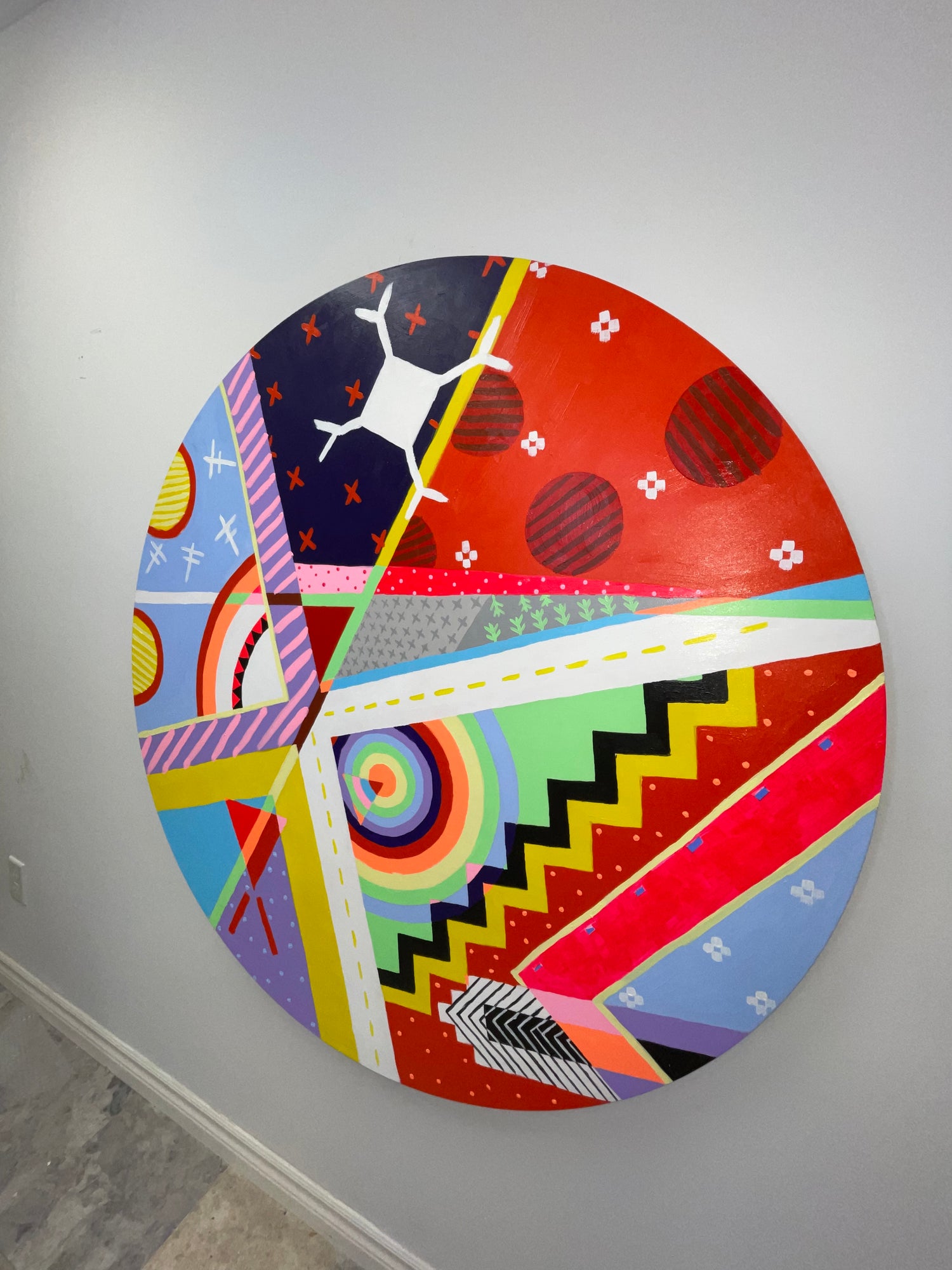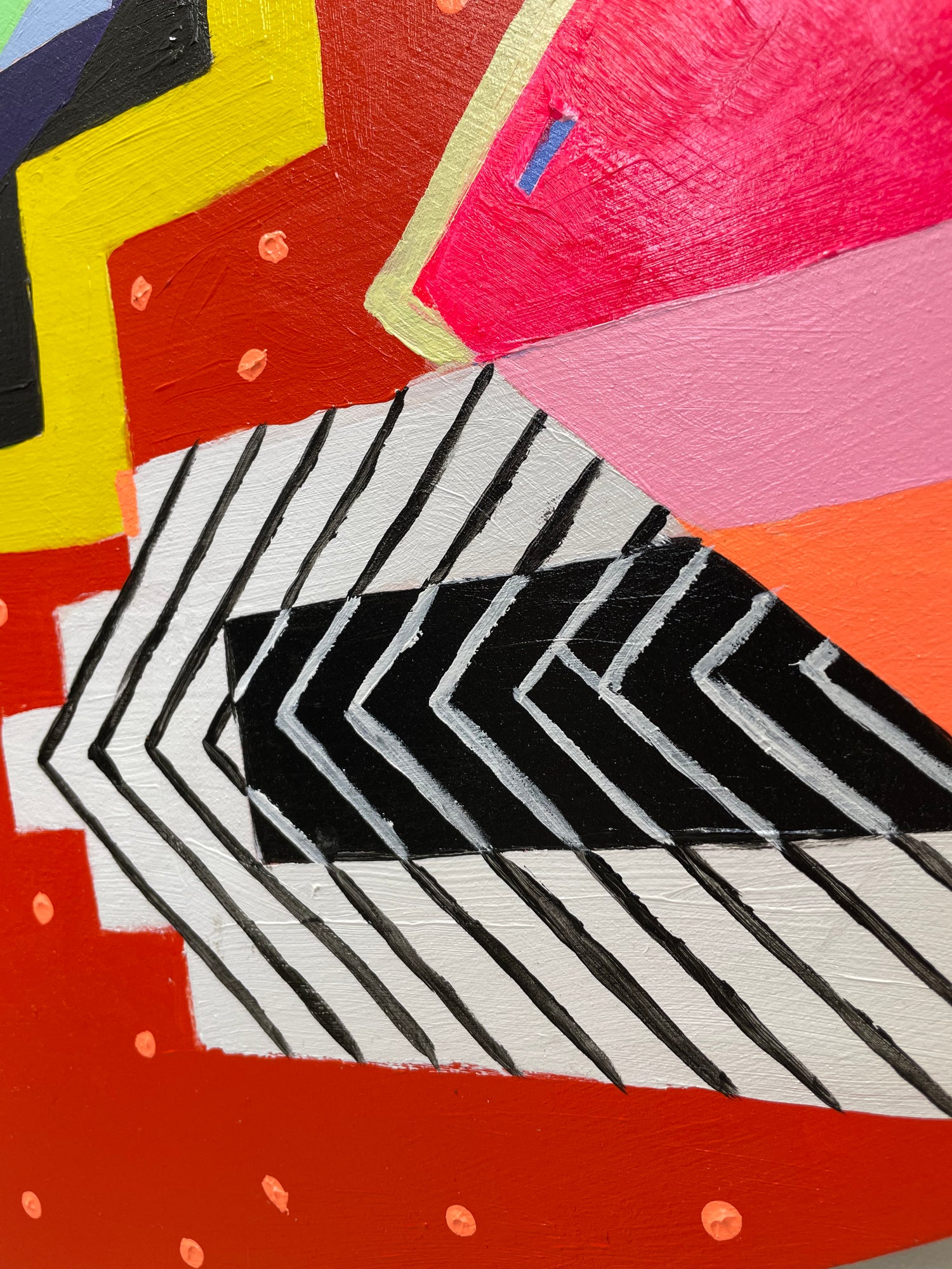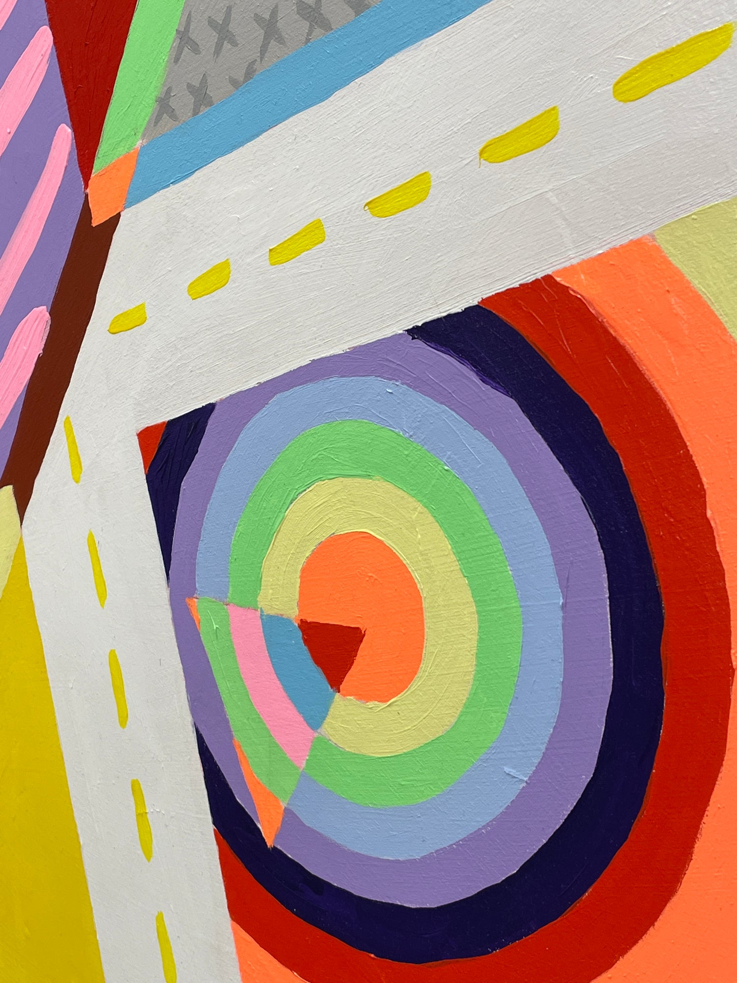 Jordan Bennett’s new series marks an experimental departure, where he explores new painting techniques that expand beyond solid blocks of flat colour and sharp lines reminiscent of his ongoing body of work. He explores softer lines, stenciled forms, and new textures, and reflects the ways that ancestor artists have used vivid colours to express various states of time, place and season.