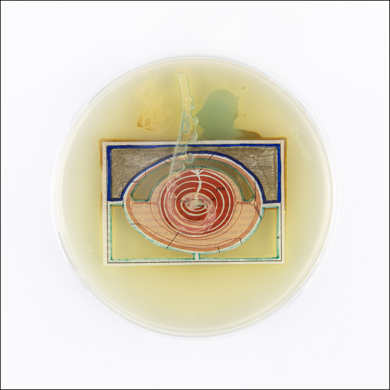 Baroque Biology (Paper Theatre) is a series of LB Agar petri dishes containing imaginary biological vignettes where non-human organisms teach humans complex biotechnological processes. Reminiscent of William Hogarth’s serial engravings combined with fairy tales from a biotech future, each allegory focuses on a non-human organism who tries to communicate with humans in a helpful manner about the biological processes they employ for survival, for reproduction, and/or aesthetic pleasure. Sometimes the human characters are open to receiving the communicated information, and sometimes they are hostile, or ignorant to the messages they are receiving across species. This work is inspired by Lynn Margalius and Dorion Sagan who argue that humans learned genetic engineering from microorganisms, and Bruno Latour who argues that Pasteur collaborated with microorganisms in the discovery of penicillin. These perspectives upset the more common biotech narrative of human ingenuity and discovery as the central force in advancing biotechnological research.Each vignette is staged within the context of a paper theatre collage. Petri dishes growing GMO bacteria also contain paper cut outs, gold leaf, and 3D sculptural agar forms. The dished are incubated and photographed after the bacteria have time to interact with the print components.
