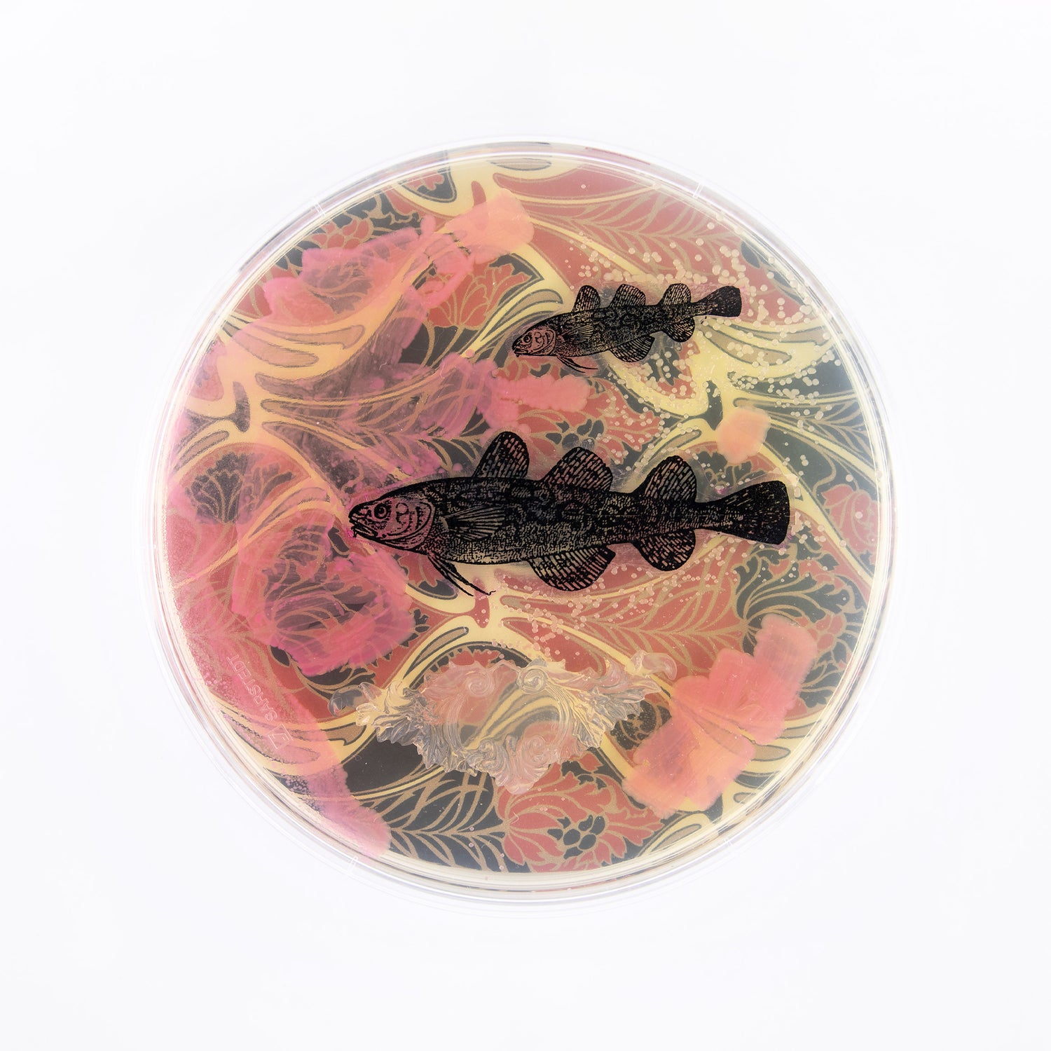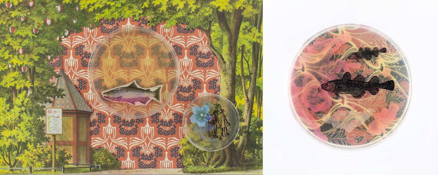 Baroque Biology (Paper Theatre) is a series of LB Agar petri dishes containing imaginary biological vignettes where non-human organisms teach humans complex biotechnological processes. Reminiscent of William Hogarth’s serial engravings combined with fairy tales from a biotech future, each allegory focuses on a non-human organism who tries to communicate with humans in a helpful manner about the biological processes they employ for survival, for reproduction, and/or aesthetic pleasure. Sometimes the human characters are open to receiving the communicated information, and sometimes they are hostile, or ignorant to the messages they are receiving across species. This work is inspired by Lynn Margalius and Dorion Sagan who argue that humans learned genetic engineering from microorganisms, and Bruno Latour who argues that Pasteur collaborated with microorganisms in the discovery of penicillin. These perspectives upset the more common biotech narrative of human ingenuity and discovery as the central force in advancing biotechnological research.Each vignette is staged within the context of a paper theatre collage. Petri dishes growing GMO bacteria also contain paper cut outs, gold leaf, and 3D sculptural agar forms. The dished are incubated and photographed after the bacteria have time to interact with the print components.