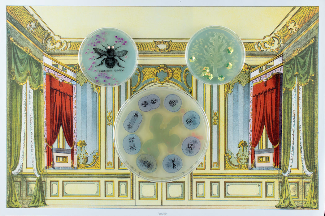 Baroque Biology (Paper Theatre) is a series of LB Agar petri dishes containing imaginary biological vignettes where non-human organisms teach humans complex biotechnological processes. Reminiscent of William Hogarth’s serial engravings combined with fairy tales from a biotech future, each allegory focuses on a non-human organism who tries to communicate with humans in a helpful manner about the biological processes they employ for survival, for reproduction, and/or aesthetic pleasure. Sometimes the human characters are open to receiving the communicated information, and sometimes they are hostile, or ignorant to the messages they are receiving across species. This work is inspired by Lynn Margalius and Dorion Sagan who argue that humans learned genetic engineering from microorganisms, and Bruno Latour who argues that Pasteur collaborated with microorganisms in the discovery of penicillin. These perspectives upset the more common biotech narrative of human ingenuity and discovery as the central force in advancing biotechnological research.Each vignette is staged within the context of a paper theatre collage. Petri dishes growing GMO bacteria also contain paper cut outs, gold leaf, and 3D sculptural agar forms. The dished are incubated and photographed after the bacteria have time to interact with the print components.