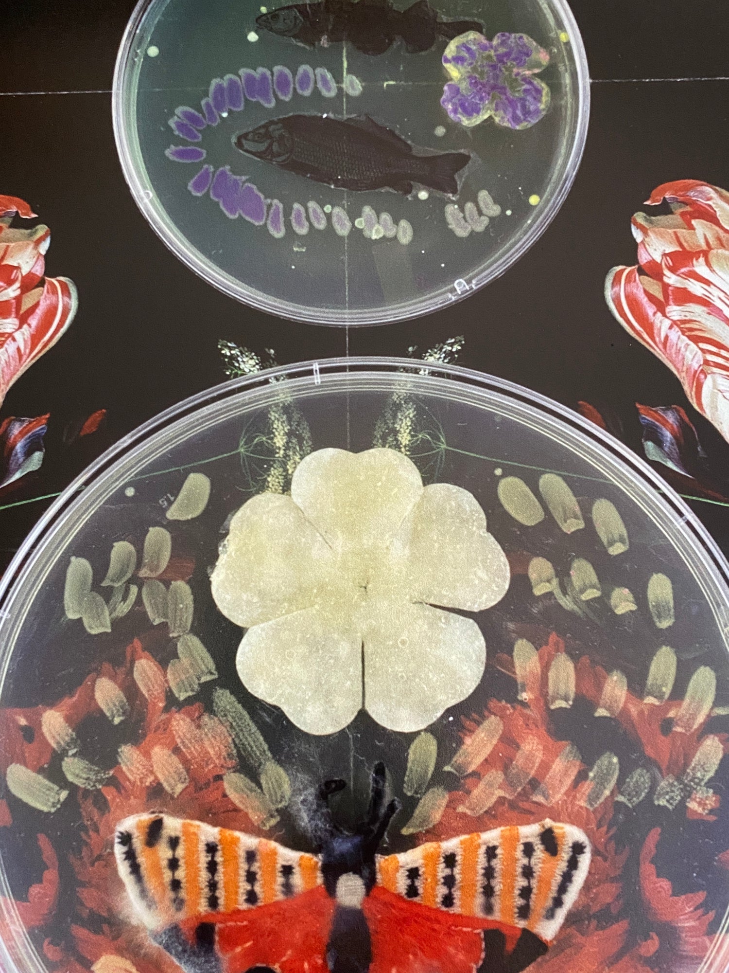 Baroque Biology (Paper Theatre) is a series of LB Agar petri dishes containing imaginary biological vignettes where non-human organisms teach humans complex biotechnological processes. Reminiscent of William Hogarth’s serial engravings combined with fairy tales from a biotech future, each allegory focuses on a non-human organism who tries to communicate with humans in a helpful manner about the biological processes they employ for survival, for reproduction, and/or aesthetic pleasure. Sometimes the human characters are open to receiving the communicated information, and sometimes they are hostile, or ignorant to the messages they are receiving across species. This work is inspired by Lynn Margalius and Dorion Sagan who argue that humans learned genetic engineering from microorganisms, and Bruno Latour who argues that Pasteur collaborated with microorganisms in the discovery of penicillin. These perspectives upset the more common biotech narrative of human ingenuity and discovery as the central force in advancing biotechnological research.Each vignette is staged within the context of a paper theatre collage. Petri dishes growing GMO bacteria also contain paper cut outs, gold leaf, and 3D sculptural agar forms. The dished are incubated and photographed after the bacteria have time to interact with the print components.