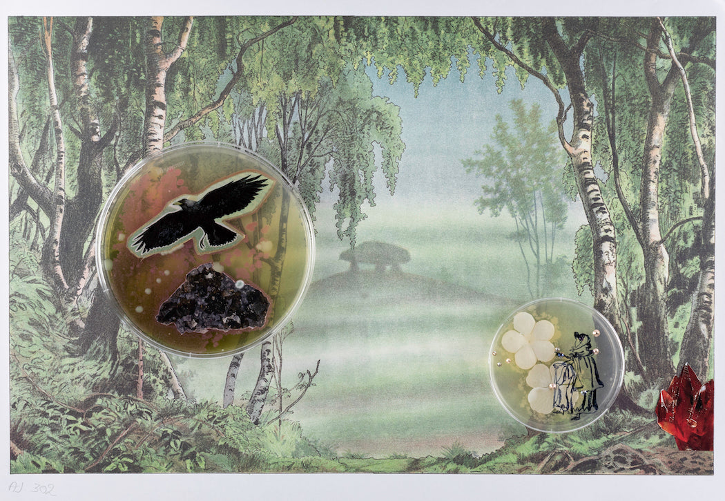 Baroque Biology (Paper Theatre) is a series of LB Agar petri dishes containing imaginary biological vignettes where non-human organisms teach humans complex biotechnological processes. Reminiscent of William Hogarth’s serial engravings combined with fairy tales from a biotech future, each allegory focuses on a non-human organism who tries to communicate with humans in a helpful manner about the biological processes they employ for survival, for reproduction, and/or aesthetic pleasure. Sometimes the human characters are open to receiving the communicated information, and sometimes they are hostile, or ignorant to the messages they are receiving across species. This work is inspired by Lynn Margalius and Dorion Sagan who argue that humans learned genetic engineering from microorganisms, and Bruno Latour who argues that Pasteur collaborated with microorganisms in the discovery of penicillin. These perspectives upset the more common biotech narrative of human ingenuity and discovery as the central force in advancing biotechnological research.Each vignette is staged within the context of a paper theatre collage. Petri dishes growing GMO bacteria also contain paper cut outs, gold leaf, and 3D sculptural agar forms. The dished are incubated and photographed after the bacteria have time to interact with the print components.