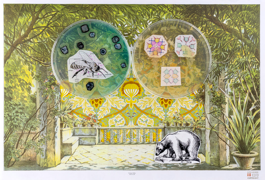 Baroque Biology (Paper Theatre) is a series of LB Agar petri dishes containing imaginary biological vignettes where non-human organisms teach humans complex biotechnological processes. Reminiscent of William Hogarth’s serial engravings combined with fairy tales from a biotech future, each allegory focuses on a non-human organism who tries to communicate with humans in a helpful manner about the biological processes they employ for survival, for reproduction, and/or aesthetic pleasure. Sometimes the human characters are open to receiving the communicated information, and sometimes they are hostile, or ignorant to the messages they are receiving across species. This work is inspired by Lynn Margalius and Dorion Sagan who argue that humans learned genetic engineering from microorganisms, and Bruno Latour who argues that Pasteur collaborated with microorganisms in the discovery of penicillin. These perspectives upset the more common biotech narrative of human ingenuity and discovery as the central force in advancing biotechnological research.Each vignette is staged within the context of a paper theatre collage. Petri dishes growing GMO bacteria also contain paper cut outs, gold leaf, and 3D sculptural agar forms. The dished are incubated and photographed after the bacteria have time to interact with the print components.