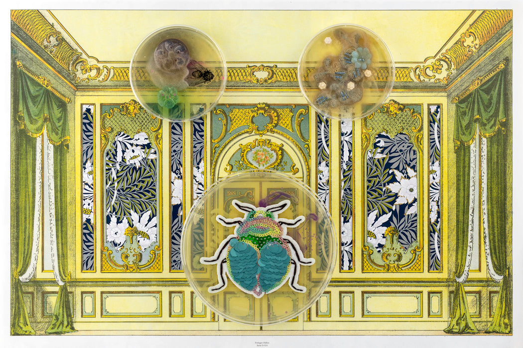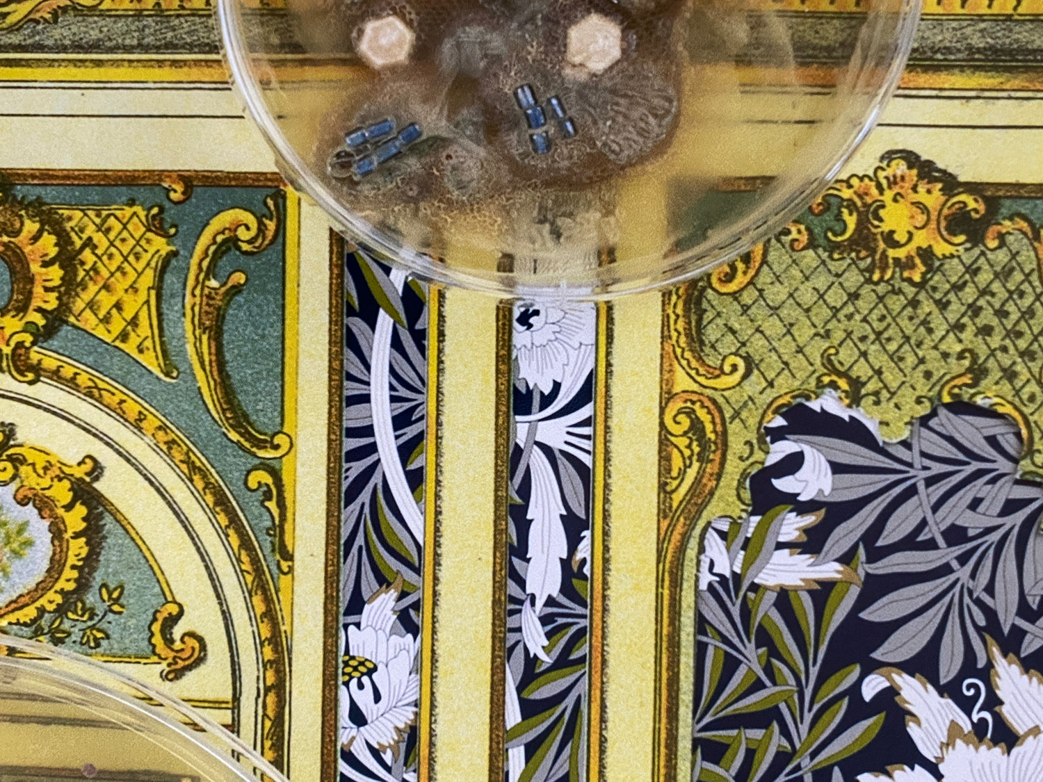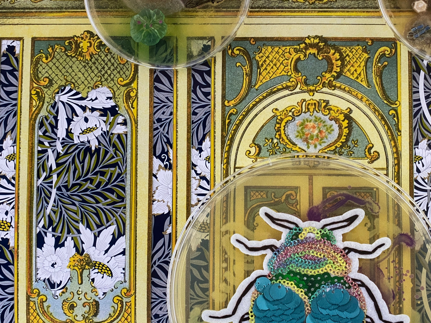 Baroque Biology (Paper Theatre) is a series of LB Agar petri dishes containing imaginary biological vignettes where non-human organisms teach humans complex biotechnological processes. Reminiscent of William Hogarth’s serial engravings combined with fairy tales from a biotech future, each allegory focuses on a non-human organism who tries to communicate with humans in a helpful manner about the biological processes they employ for survival, for reproduction, and/or aesthetic pleasure. Sometimes the human characters are open to receiving the communicated information, and sometimes they are hostile, or ignorant to the messages they are receiving across species. This work is inspired by Lynn Margalius and Dorion Sagan who argue that humans learned genetic engineering from microorganisms, and Bruno Latour who argues that Pasteur collaborated with microorganisms in the discovery of penicillin. These perspectives upset the more common biotech narrative of human ingenuity and discovery as the central force in advancing biotechnological research.Each vignette is staged within the context of a paper theatre collage. Petri dishes growing GMO bacteria also contain paper cut outs, gold leaf, and 3D sculptural agar forms. The dished are incubated and photographed after the bacteria have time to interact with the print components.