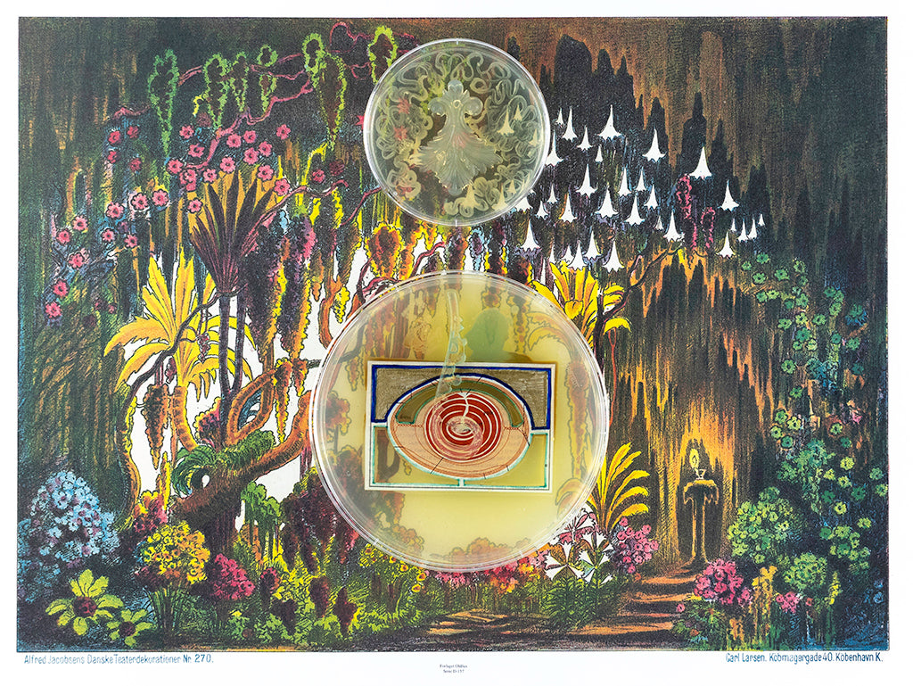 Baroque Biology (Paper Theatre) is a series of LB Agar petri dishes containing imaginary biological vignettes where non-human organisms teach humans complex biotechnological processes. Reminiscent of William Hogarth’s serial engravings combined with fairy tales from a biotech future, each allegory focuses on a non-human organism who tries to communicate with humans in a helpful manner about the biological processes they employ for survival, for reproduction, and/or aesthetic pleasure. Sometimes the human characters are open to receiving the communicated information, and sometimes they are hostile, or ignorant to the messages they are receiving across species. This work is inspired by Lynn Margalius and Dorion Sagan who argue that humans learned genetic engineering from microorganisms, and Bruno Latour who argues that Pasteur collaborated with microorganisms in the discovery of penicillin. These perspectives upset the more common biotech narrative of human ingenuity and discovery as the central force in advancing biotechnological research.Each vignette is staged within the context of a paper theatre collage. Petri dishes growing GMO bacteria also contain paper cut outs, gold leaf, and 3D sculptural agar forms. The dished are incubated and photographed after the bacteria have time to interact with the print components.