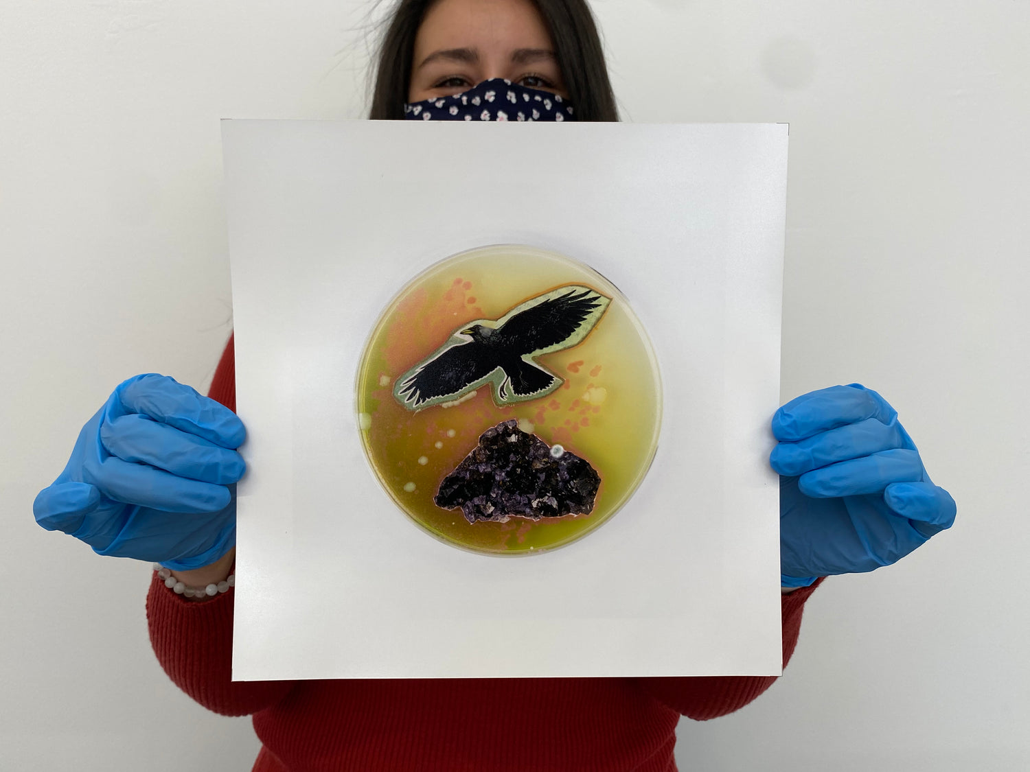 Baroque Biology (Paper Theatre) is a series of LB Agar petri dishes containing imaginary biological vignettes where non-human organisms teach humans complex biotechnological processes. Reminiscent of William Hogarth’s serial engravings combined with fairy tales from a biotech future, each allegory focuses on a non-human organism who tries to communicate with humans in a helpful manner about the biological processes they employ for survival, for reproduction, and/or aesthetic pleasure. Sometimes the human characters are open to receiving the communicated information, and sometimes they are hostile, or ignorant to the messages they are receiving across species. This work is inspired by Lynn Margalius and Dorion Sagan who argue that humans learned genetic engineering from microorganisms, and Bruno Latour who argues that Pasteur collaborated with microorganisms in the discovery of penicillin. These perspectives upset the more common biotech narrative of human ingenuity and discovery as the central force in advancing biotechnological research.Each vignette is staged within the context of a paper theatre collage. Petri dishes growing GMO bacteria also contain paper cut outs, gold leaf, and 3D sculptural agar forms. The dished are incubated and photographed after the bacteria have time to interact with the print components.