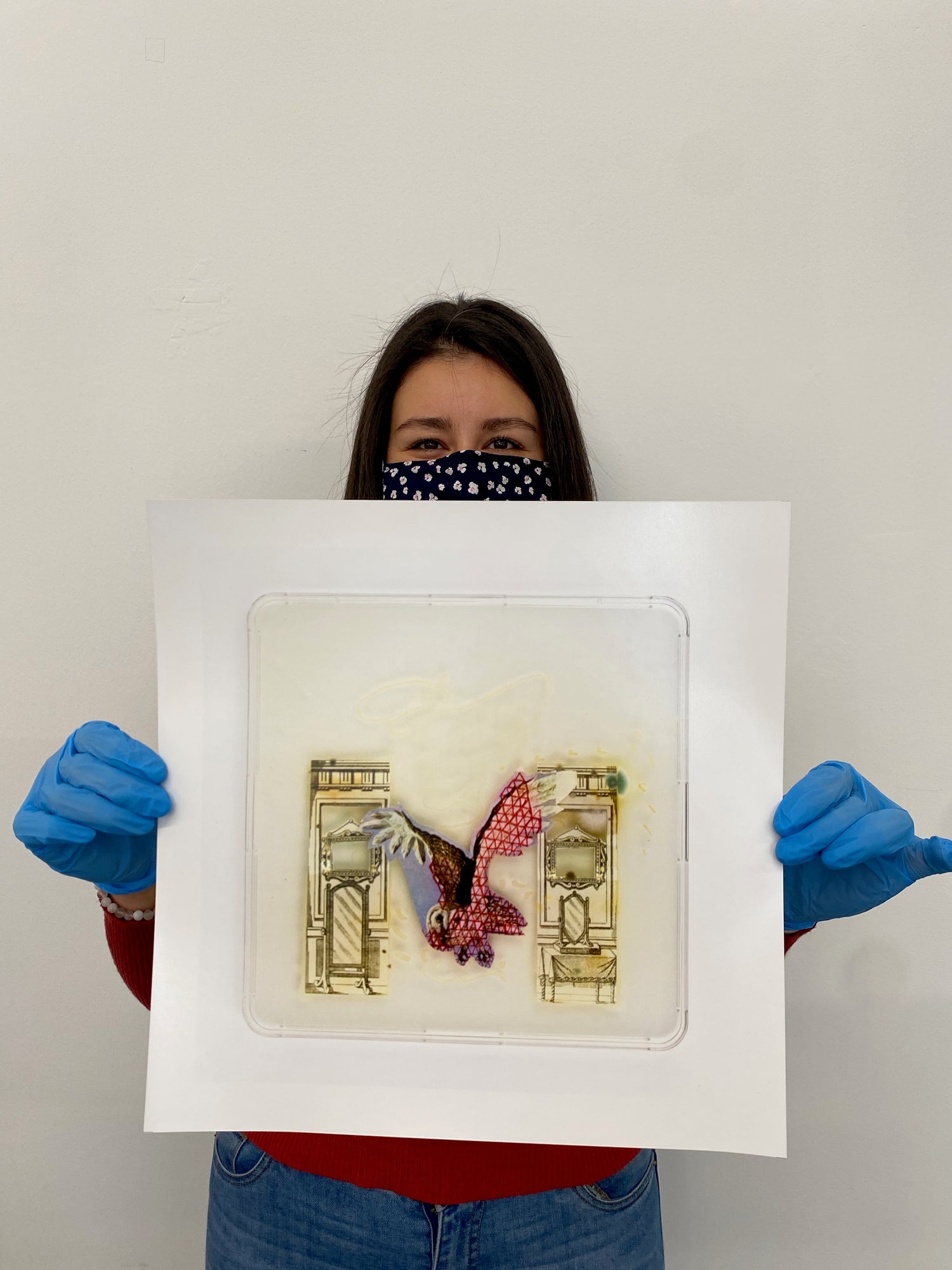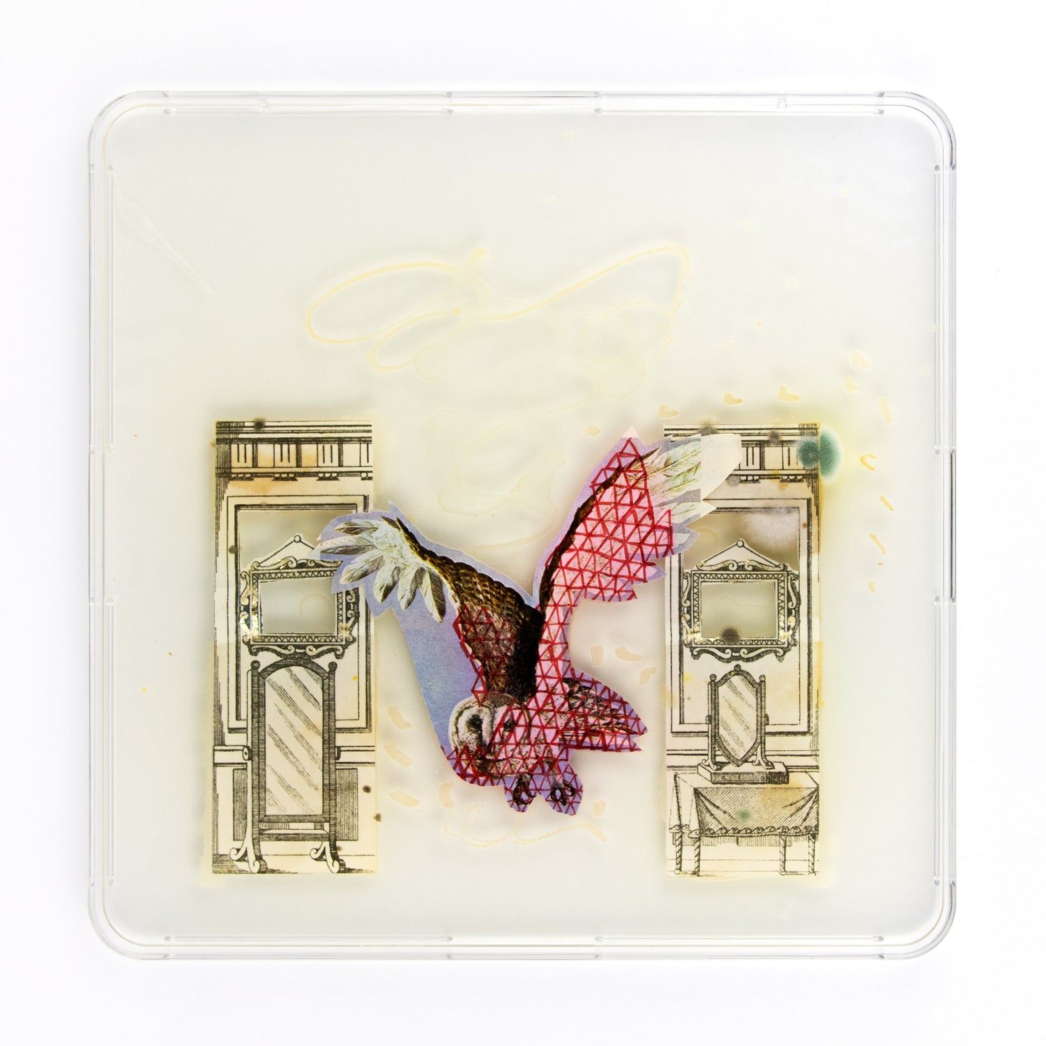 Baroque Biology (Paper Theatre) is a series of LB Agar petri dishes containing imaginary biological vignettes where non-human organisms teach humans complex biotechnological processes. Reminiscent of William Hogarth’s serial engravings combined with fairy tales from a biotech future, each allegory focuses on a non-human organism who tries to communicate with humans in a helpful manner about the biological processes they employ for survival, for reproduction, and/or aesthetic pleasure. Sometimes the human characters are open to receiving the communicated information, and sometimes they are hostile, or ignorant to the messages they are receiving across species. This work is inspired by Lynn Margalius and Dorion Sagan who argue that humans learned genetic engineering from microorganisms, and Bruno Latour who argues that Pasteur collaborated with microorganisms in the discovery of penicillin. These perspectives upset the more common biotech narrative of human ingenuity and discovery as the central force in advancing biotechnological research.Each vignette is staged within the context of a paper theatre collage. Petri dishes growing GMO bacteria also contain paper cut outs, gold leaf, and 3D sculptural agar forms. The dished are incubated and photographed after the bacteria have time to interact with the print components.