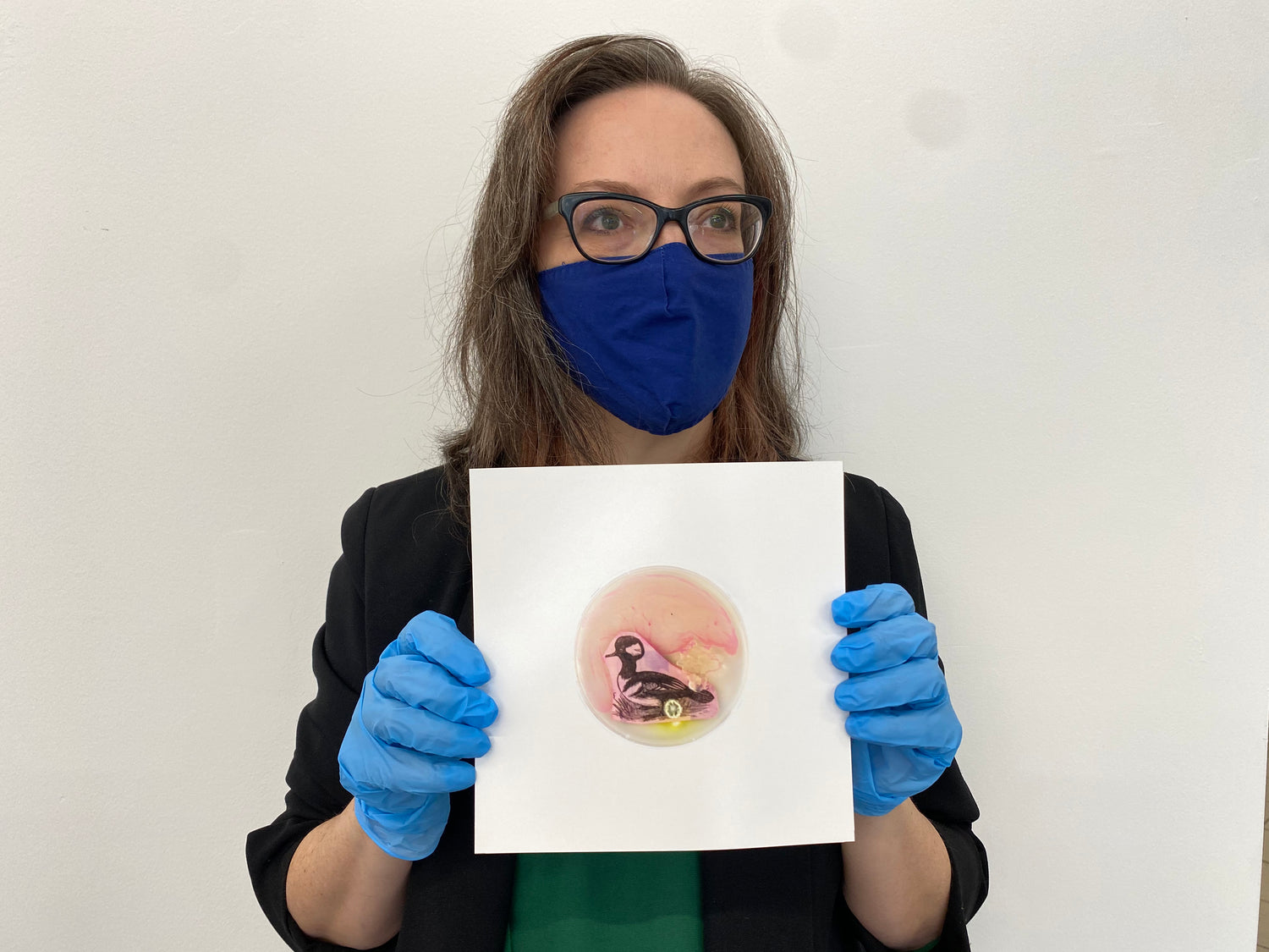 Baroque Biology (Paper Theatre) is a series of LB Agar petri dishes containing imaginary biological vignettes where non-human organisms teach humans complex biotechnological processes. Reminiscent of William Hogarth’s serial engravings combined with fairy tales from a biotech future, each allegory focuses on a non-human organism who tries to communicate with humans in a helpful manner about the biological processes they employ for survival, for reproduction, and/or aesthetic pleasure. Sometimes the human characters are open to receiving the communicated information, and sometimes they are hostile, or ignorant to the messages they are receiving across species. This work is inspired by Lynn Margalius and Dorion Sagan who argue that humans learned genetic engineering from microorganisms, and Bruno Latour who argues that Pasteur collaborated with microorganisms in the discovery of penicillin. These perspectives upset the more common biotech narrative of human ingenuity and discovery as the central force in advancing biotechnological research.Each vignette is staged within the context of a paper theatre collage. Petri dishes growing GMO bacteria also contain paper cut outs, gold leaf, and 3D sculptural agar forms. The dished are incubated and photographed after the bacteria have time to interact with the print components.