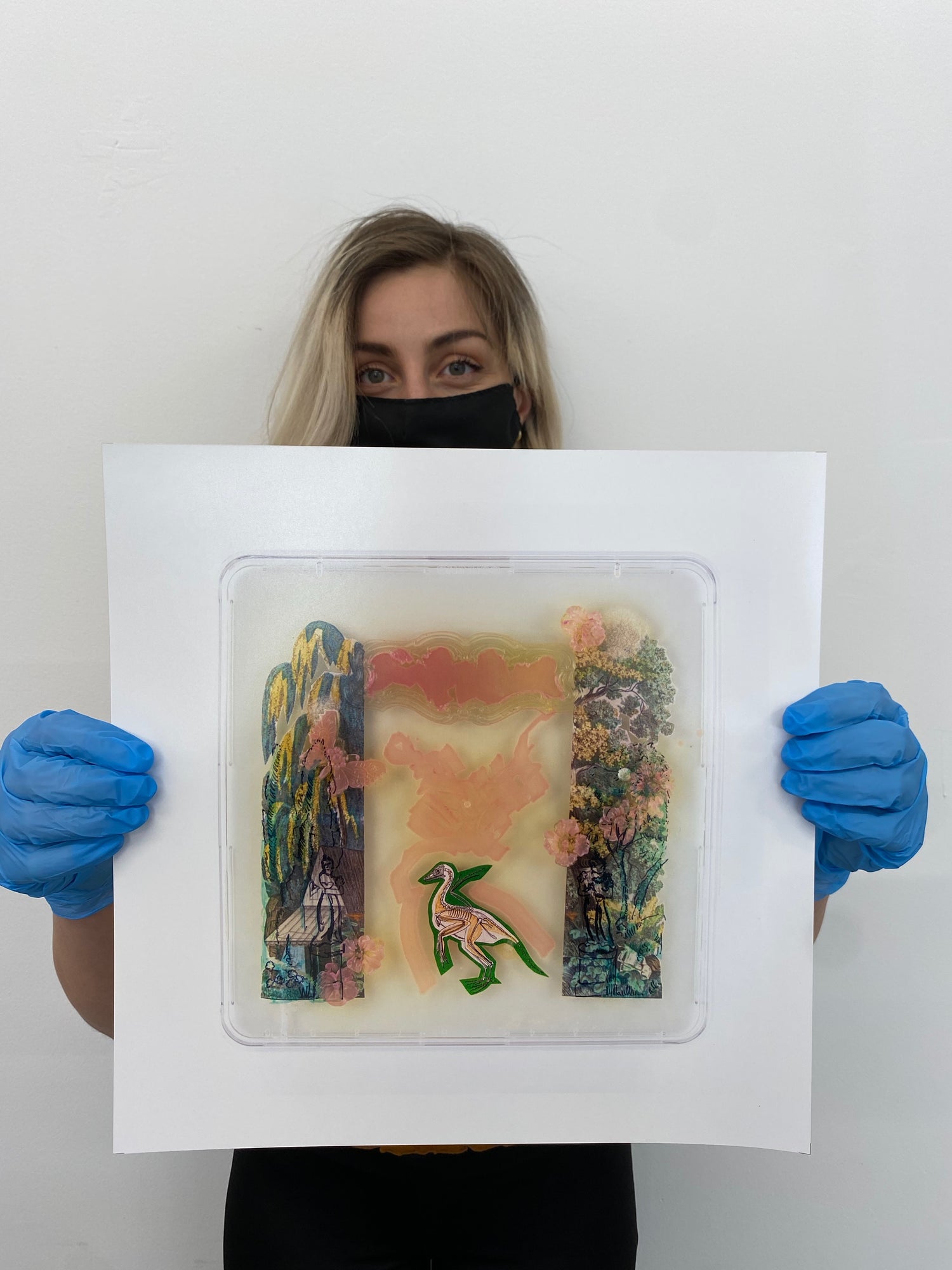 Baroque Biology (Paper Theatre) is a series of LB Agar petri dishes containing imaginary biological vignettes where non-human organisms teach humans complex biotechnological processes. Reminiscent of William Hogarth’s serial engravings combined with fairy tales from a biotech future, each allegory focuses on a non-human organism who tries to communicate with humans in a helpful manner about the biological processes they employ for survival, for reproduction, and/or aesthetic pleasure. Sometimes the human characters are open to receiving the communicated information, and sometimes they are hostile, or ignorant to the messages they are receiving across species. This work is inspired by Lynn Margalius and Dorion Sagan who argue that humans learned genetic engineering from microorganisms, and Bruno Latour who argues that Pasteur collaborated with microorganisms in the discovery of penicillin. These perspectives upset the more common biotech narrative of human ingenuity and discovery as the central force in advancing biotechnological research.Each vignette is staged within the context of a paper theatre collage. Petri dishes growing GMO bacteria also contain paper cut outs, gold leaf, and 3D sculptural agar forms. The dished are incubated and photographed after the bacteria have time to interact with the print components.