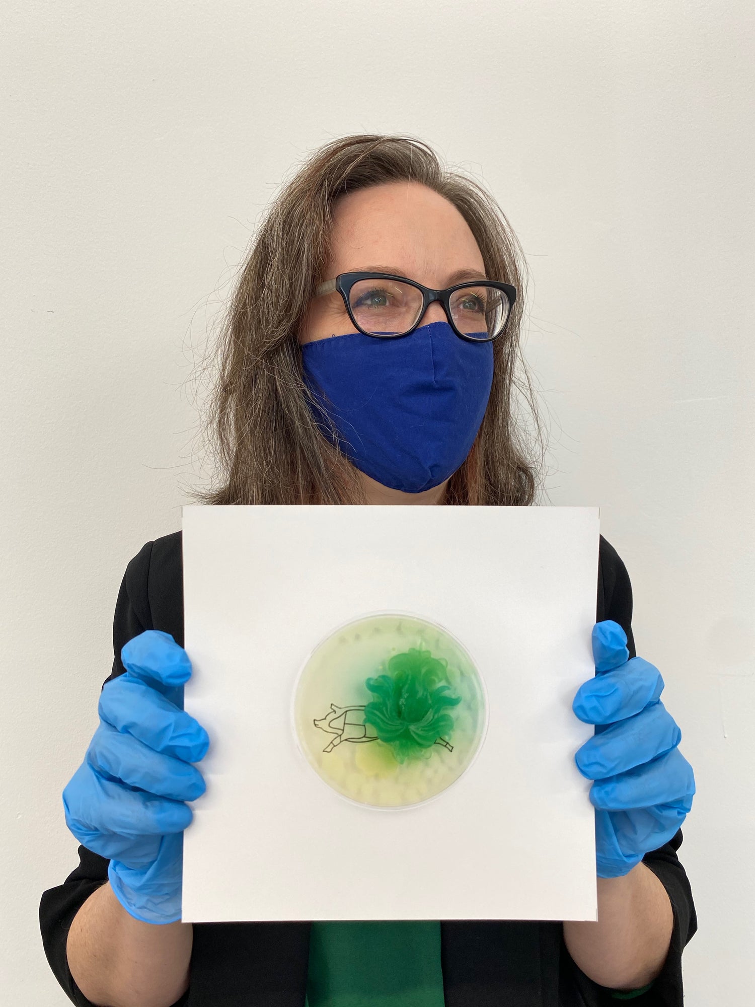 Baroque Biology (Paper Theatre) is a series of LB Agar petri dishes containing imaginary biological vignettes where non-human organisms teach humans complex biotechnological processes. Reminiscent of William Hogarth’s serial engravings combined with fairy tales from a biotech future, each allegory focuses on a non-human organism who tries to communicate with humans in a helpful manner about the biological processes they employ for survival, for reproduction, and/or aesthetic pleasure. Sometimes the human characters are open to receiving the communicated information, and sometimes they are hostile, or ignorant to the messages they are receiving across species. This work is inspired by Lynn Margalius and Dorion Sagan who argue that humans learned genetic engineering from microorganisms, and Bruno Latour who argues that Pasteur collaborated with microorganisms in the discovery of penicillin. These perspectives upset the more common biotech narrative of human ingenuity and discovery as the central force in advancing biotechnological research.Each vignette is staged within the context of a paper theatre collage. Petri dishes growing GMO bacteria also contain paper cut outs, gold leaf, and 3D sculptural agar forms. The dished are incubated and photographed after the bacteria have time to interact with the print components.