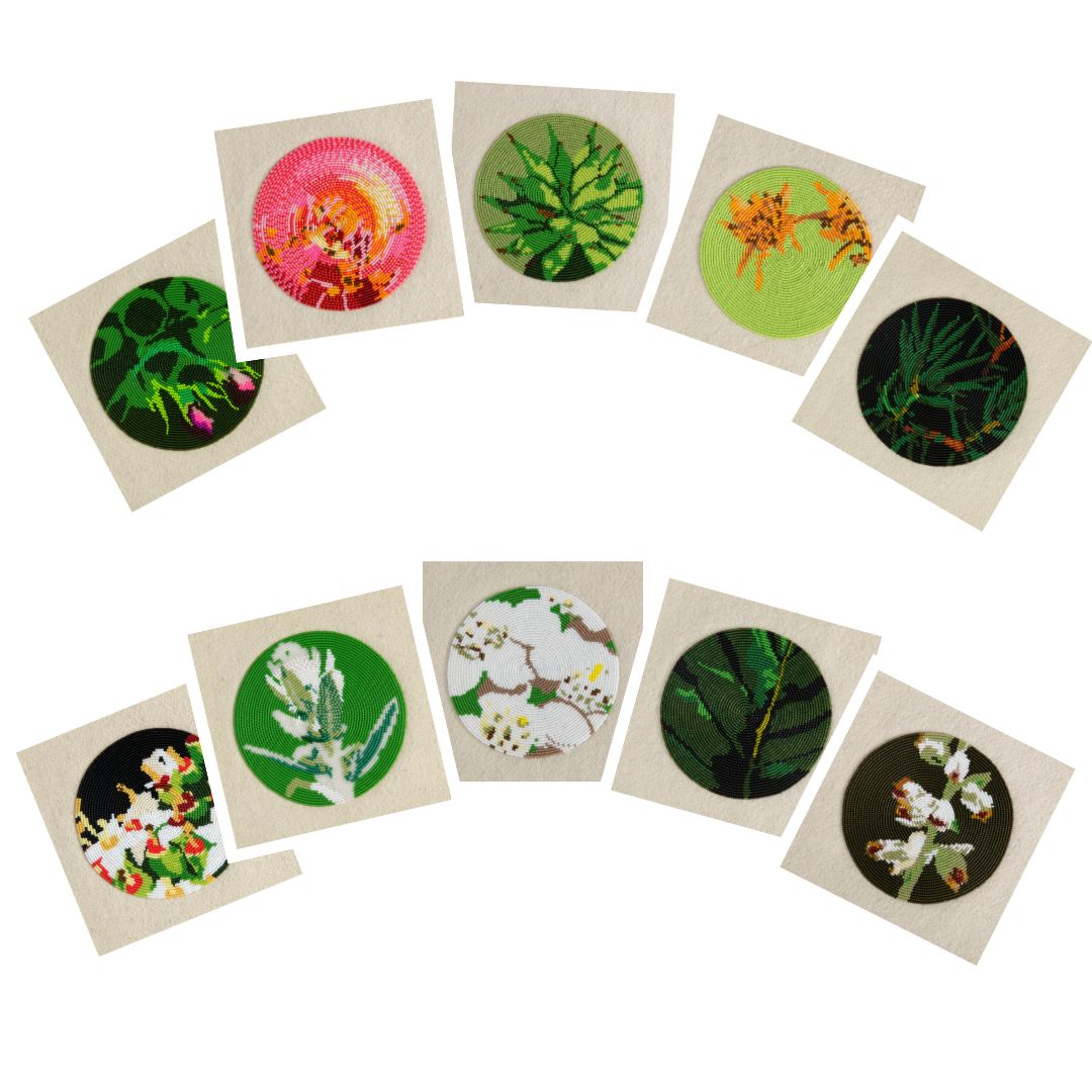 This series of 10 mini art prints is based on Carrie Allison's beadwork series "First Family," which features beaded depictions of medicinal plants from what is now known as north west Alberta, Canada. These prints are photo reproductions of the beaded pieces that are made with size 15 miyuki and toho beads on stroud (a trade cloth, commonly used by Metis people). These mini prints show the intricate detail of the beading in almost actual size, and a time intensive practice that the artist utilizes to draw connections to the plants depicted.