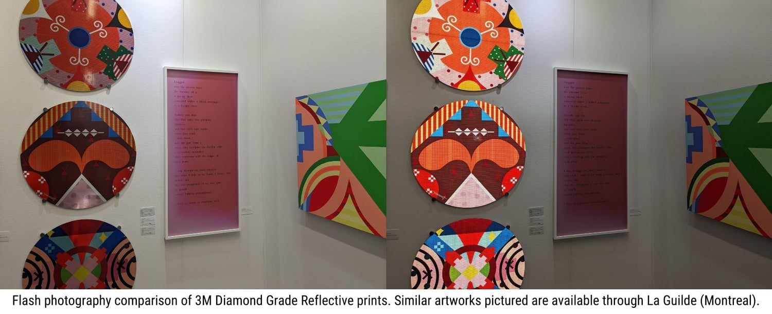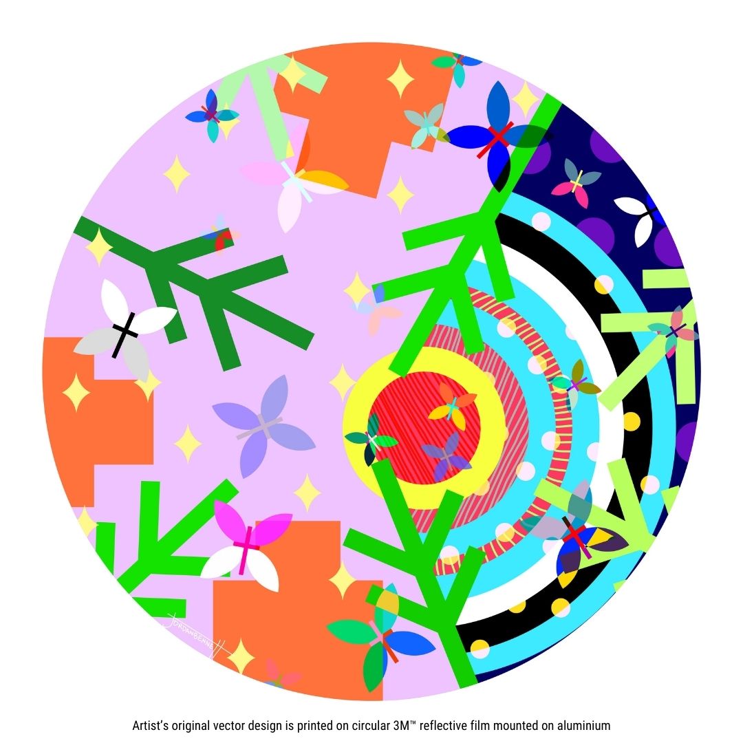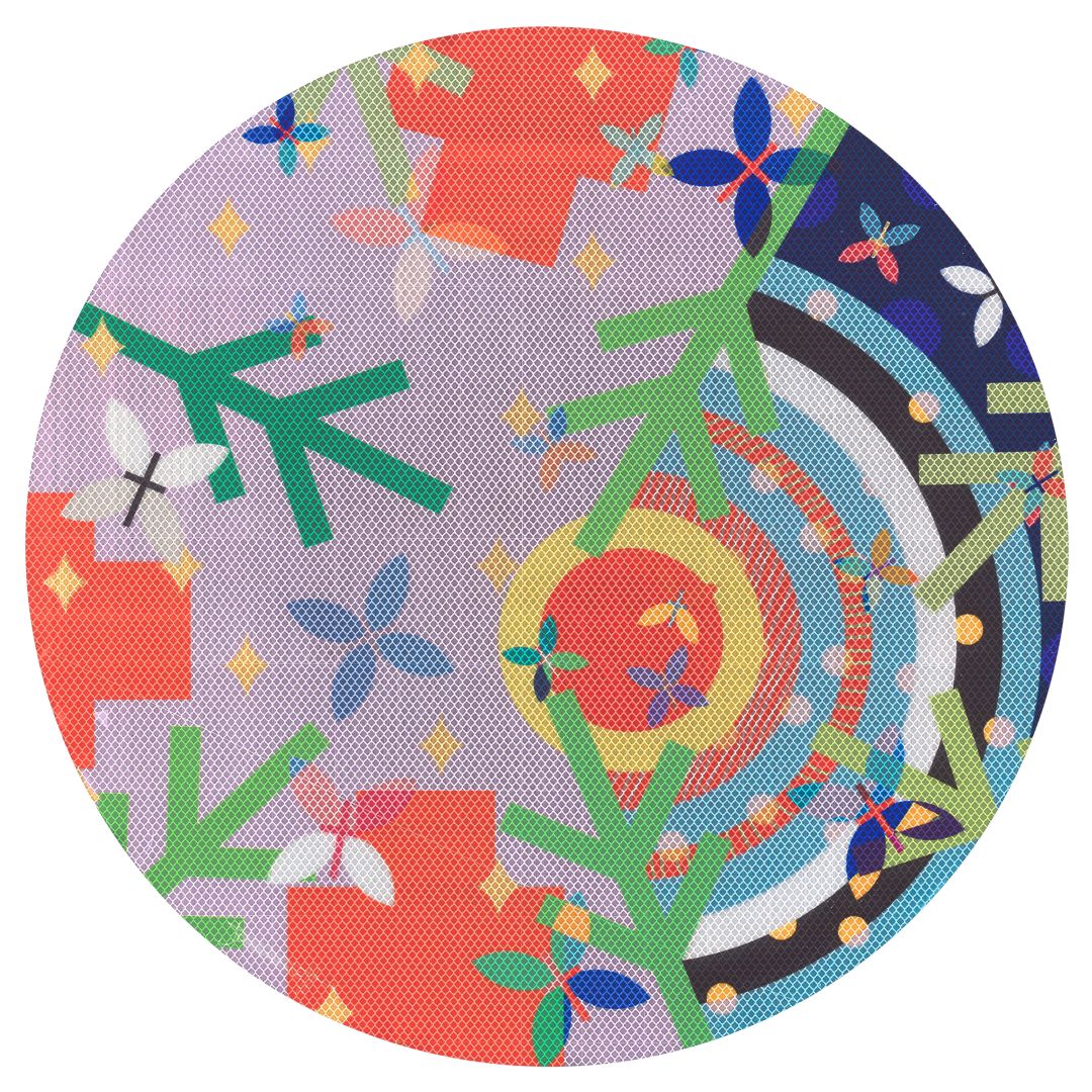 Jordan Bennett uses spray paint, acrylic paint, and reflective road signs to activate the shapes, colours, and composition of ancestral porcupine quillwork, and bring Mi’kmaq visual language into public space. In these editions of 5, the artist’s vector design is printed on circular 3M™ reflective film mounted on aluminium, echoing the materiality and durability of highway road signs. Exact colours may vary based on lighting.