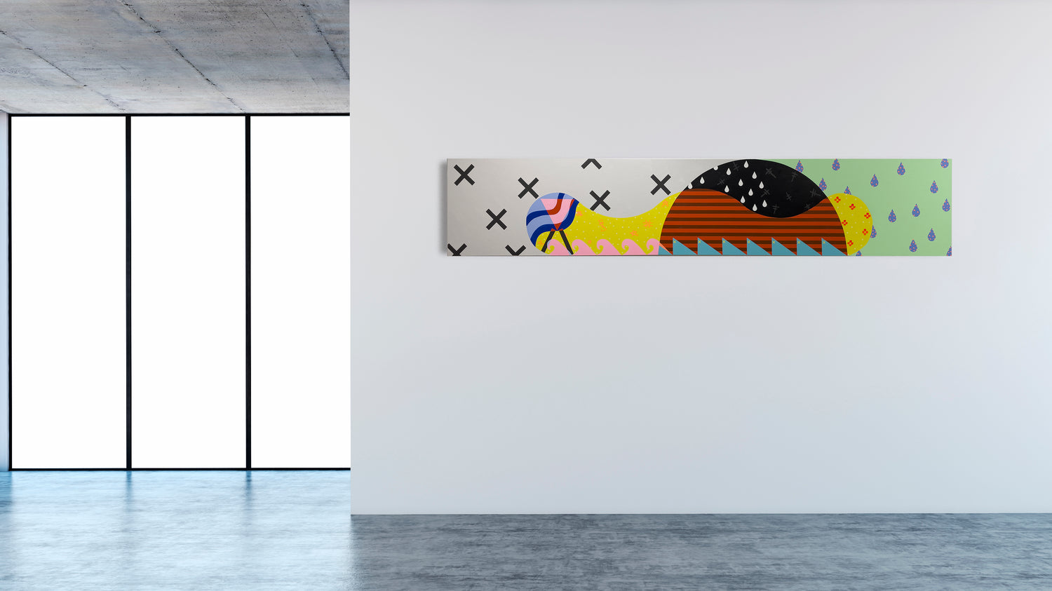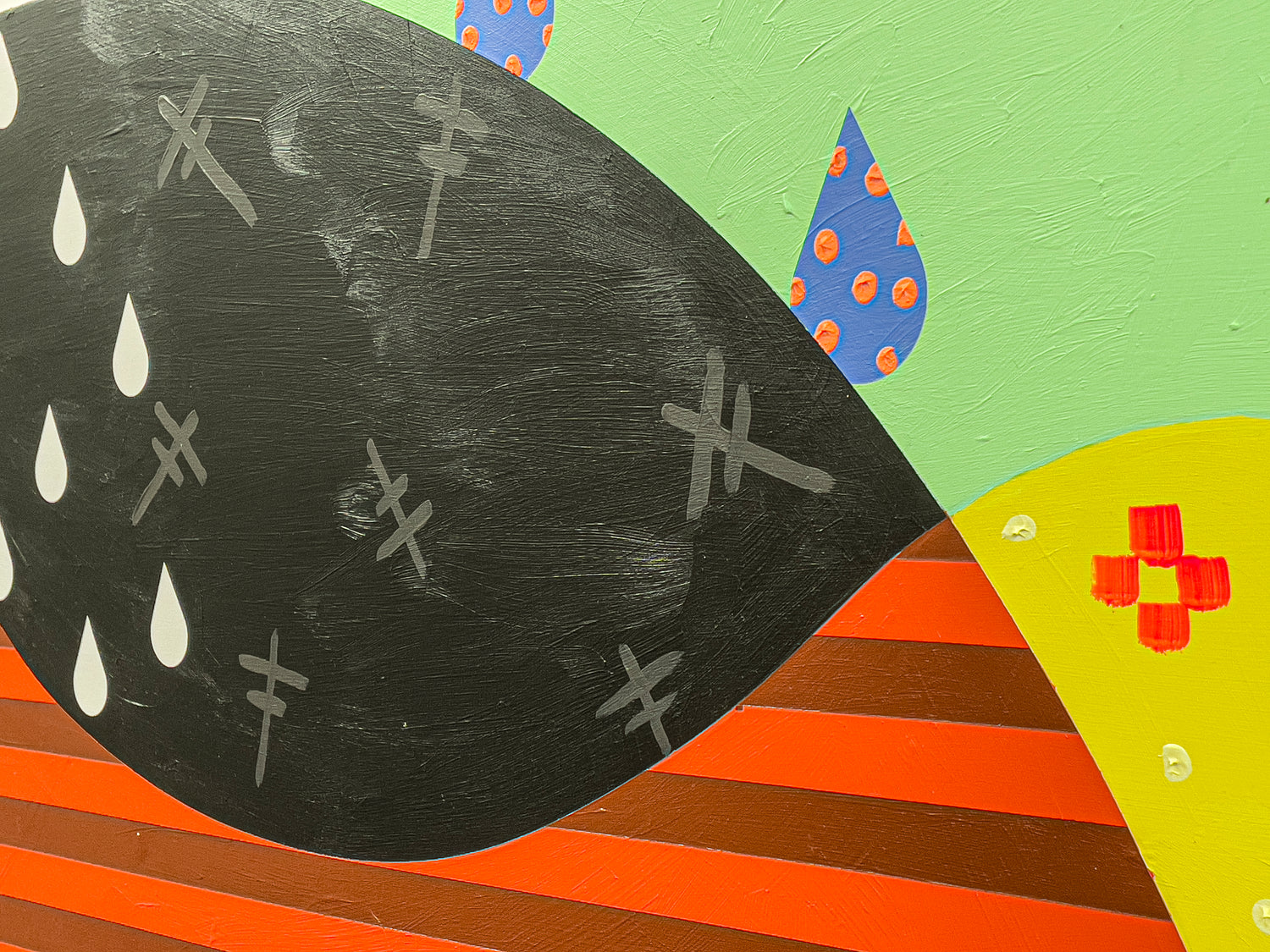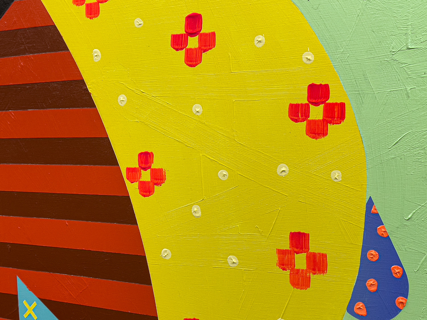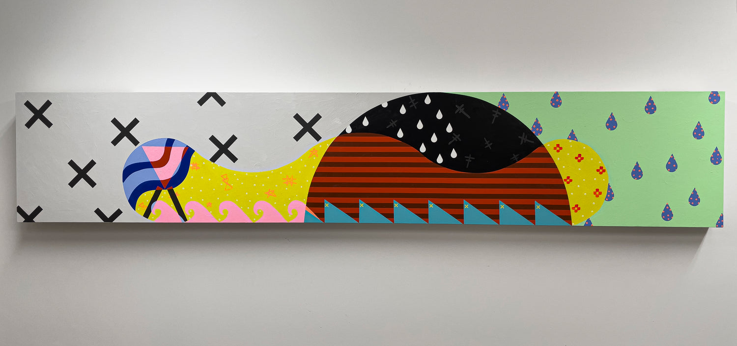 Jordan Bennett’s new series marks an experimental departure, where he explores new painting techniques that expand beyond solid blocks of flat colour and sharp lines reminiscent of his ongoing body of work. He explores softer lines, stenciled forms, and new textures, and reflects the ways that ancestor artists have used vivid colours to express various states of time, place and season.