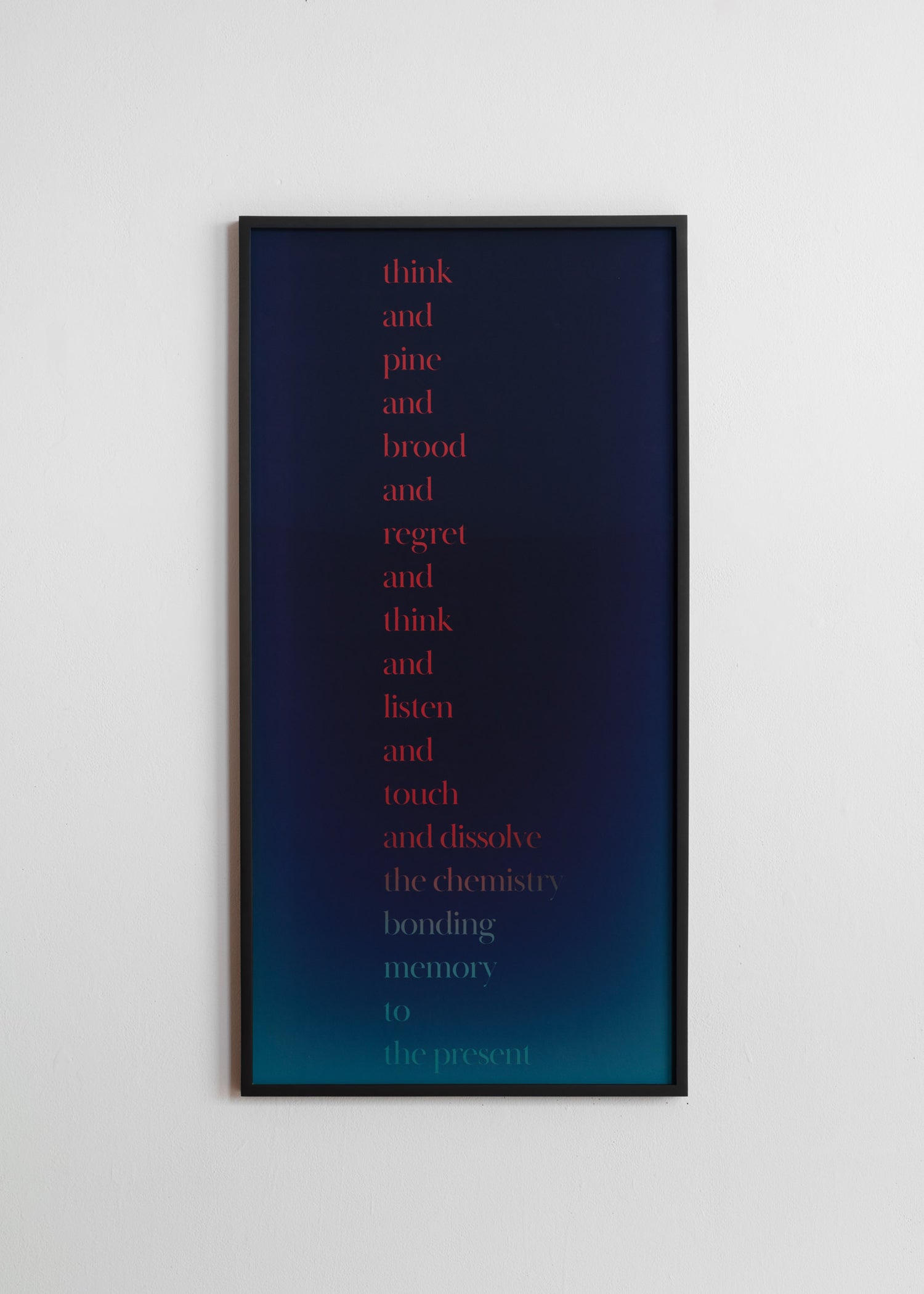 From a series of works titled Domestic Entropy (2021/22) seeks to portray the act of remembering as a destructive act that changes our perceptions of our past. Each text-based digital print in the suite titled Domestic Entropy (2021/22) features typography against colour gradients that hint at the chromatic instability of pigments and paper by creating a facsimile of sun damage. I intentionally nestle my allusion to decay within a chemically stable inkjet print medium to invoke the medium's materiality. The repetitive iterations of writing, changing text, and poetic reflections all reference the self-dismantling process of recalling a past event.