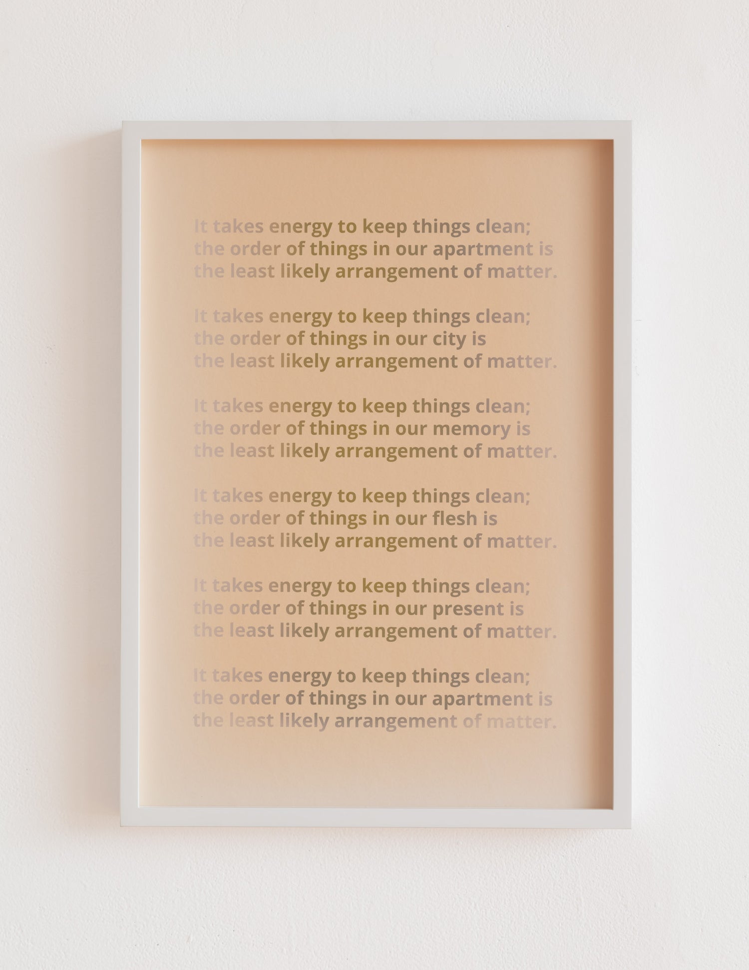 From a series of works titled Domestic Entropy (2021/22). Each text-based digital print in the suite titled Domestic Entropy (2021/22) features typography against colour gradients that hint at the chromatic instability of pigments and paper by creating a facsimile of sun damage. I intentionally nestle my allusion to decay within a chemically stable inkjet print medium to invoke the medium's materiality. The repetitive iterations of writing, changing text, and poetic reflections all reference the self-dismantling process of recalling a past event.