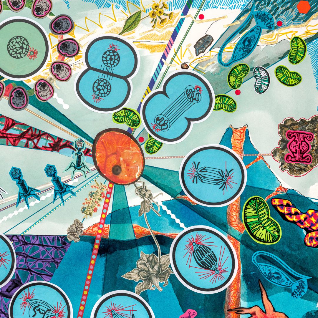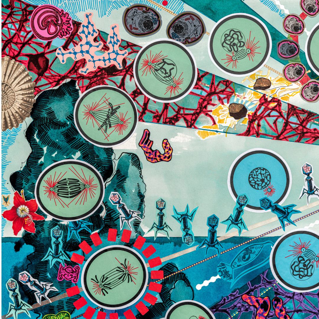 Dreams of Biogenesis imagines the birth of life on our planet as a reverie of molecules, cells, micro and multicellular organisms assembling and evolving under unique environmental conditions. Inspired by the research of SETI Institute Drake Award recipients Dr. David Deamer and Dr. John Baross, this work holds multiple visions, hypotheses and daydreams of the origins of life on our planet within a single frame. Dreams of Biogenesis results in an original collage on paper, an editioned digital print reproduction, and a stop motion animation featuring moving collage elements that illustrate the cavalcade of life at a microscopic scale.