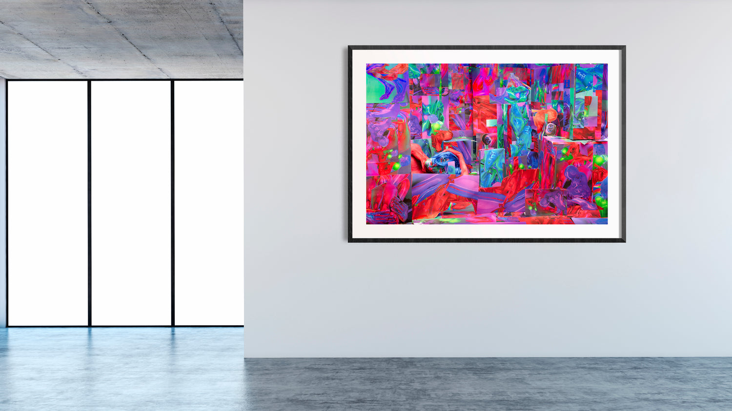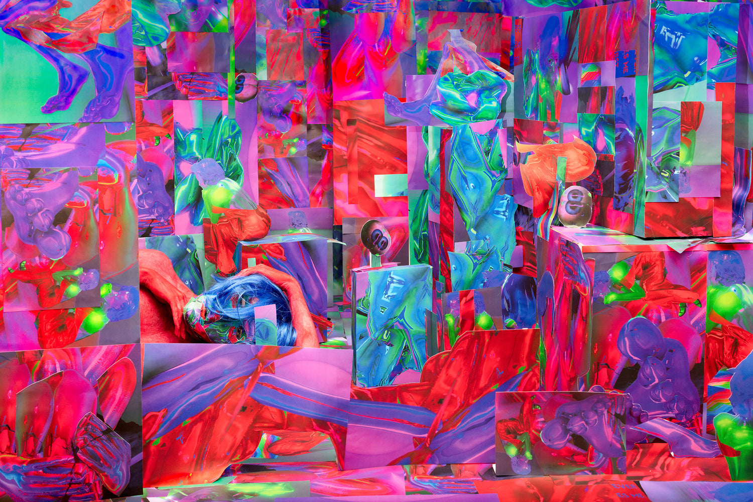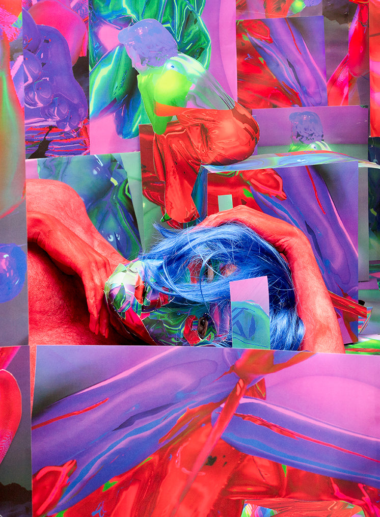 From the triptych “A space and place all for us”, this work raises questions of embodiment, posthumanism and what it means to exist in digital and physical spaces. the installations constructed in this series are first created digitally using 3-D modeling programs like blender, as well as unity, a computer game engine. images of these video game environments are then extracted into print form, which i use to construct complex, large-scale installations for me to photograph, encompassing the camera’s frame. in bringing these digital aesthetics into a physical space, these photographs exist as dense visual environments that blur the line between the digital and the physical, the real and the fake. by photographing myself inside these constructed spaces, i want to explore what it means for the body to interact within virtual, otherworldly spaces.