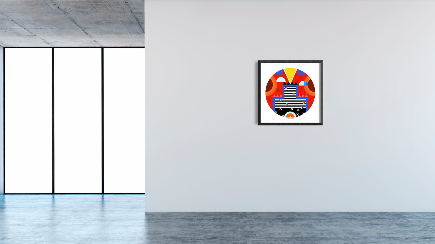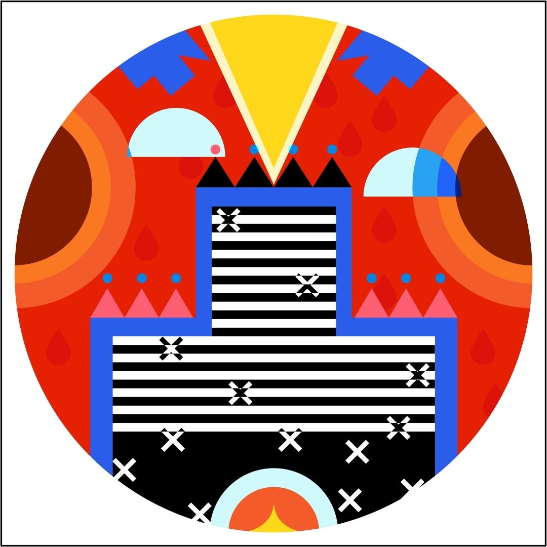 This print is part of a series of 13 prints and derived from elements that were created for the 2019 Toronto Nuit Blanche, Kings and Queens of Scarborough project titled Tepknuset. For this site-specific installation, a series of large suspended fabric prints referencing porcupine quillwork and aluminum elements depicting Mi'kmaq petroglyph depictions of stars were suspended over a busy public space while 13 circular prints, each representing a moon in the Mi'kmaq year, were mounted on the ground below. The elements of the installation spoke of place, time, changing seasons and environment as embedded in Mi'kmaq visual culture. The piece was read as a story, but a story that could be narrated from any entry point, following shape, colour and form to experience the narratives of land, home and our place in the universe. A giclée print is an archival-quality printed reproduction of an original artwork, made using a specialized ink spray process (giclée is French for "to spray") developed exclusively for fine art printing. Giclée prints are printed either on canvas or fine art paper using 100% archival inks and media. The giclée print is the closet possible reproduction of an original work of art afforded by technology and has become the new print standard for artists.