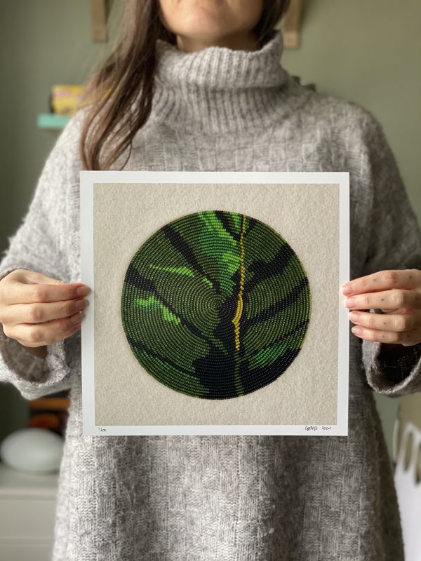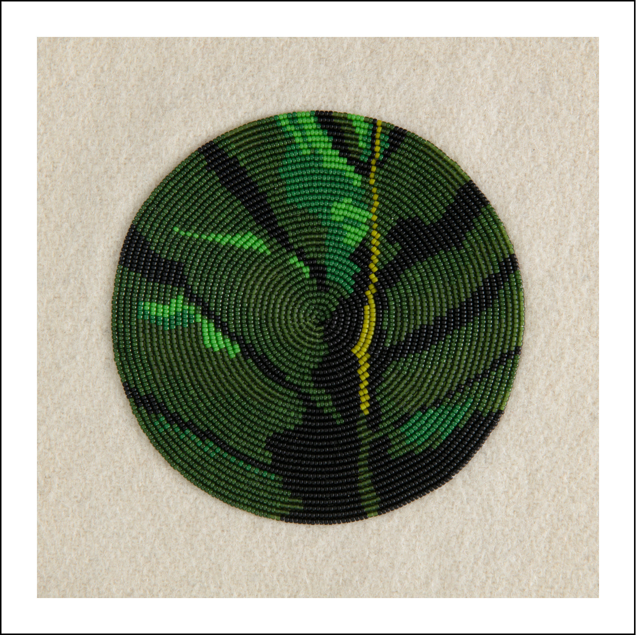First Family a series of ten circular beaded depictions of medicinal plants from what is now known as north west Alberta, Canada, where the artist's family originates. These prints are images of the beaded pieces that are made with size 15 miyuki and toho beads on stroud (a trade cloth, commonly used by Metis people). These prints show the intricate detail of the beading, a time intensive practice that the artist utilizes to draw connections to the plants depicted.
