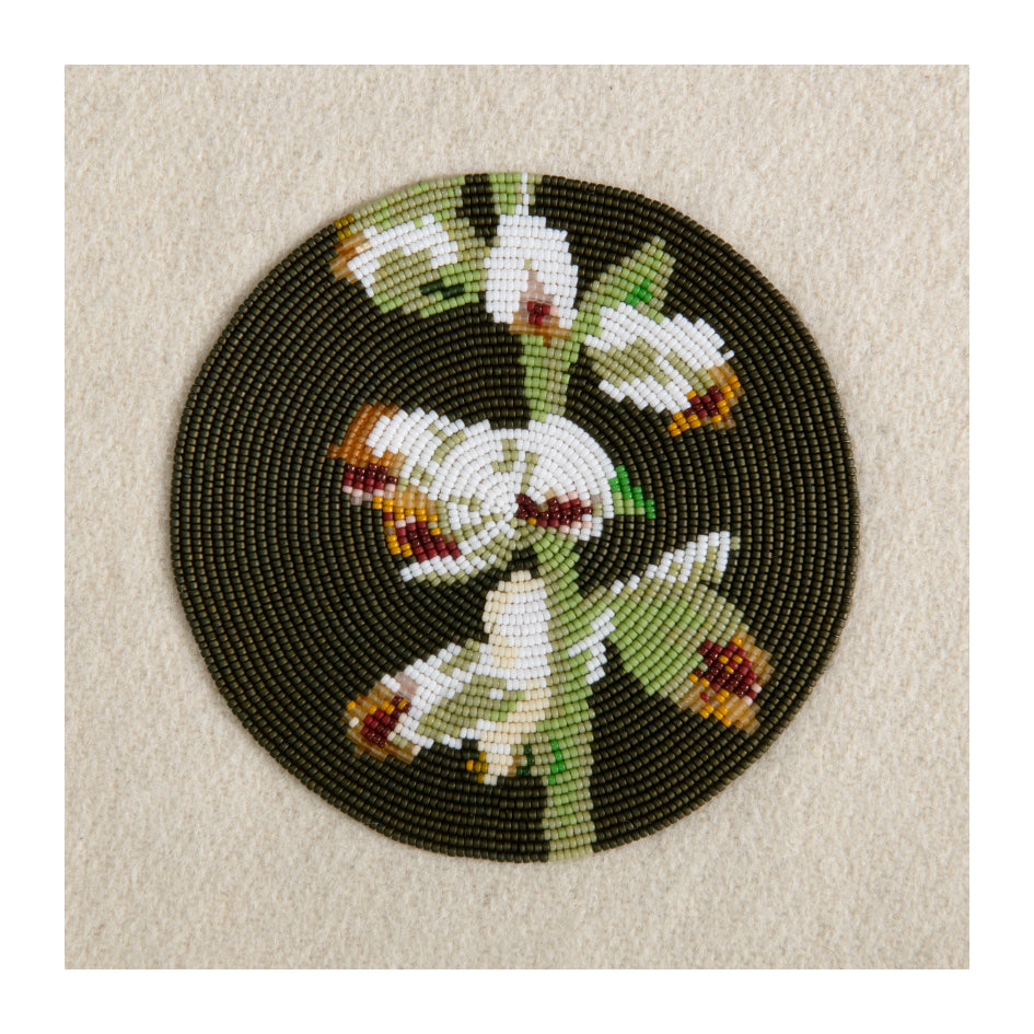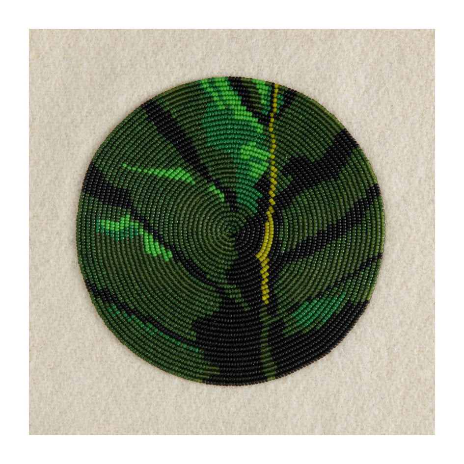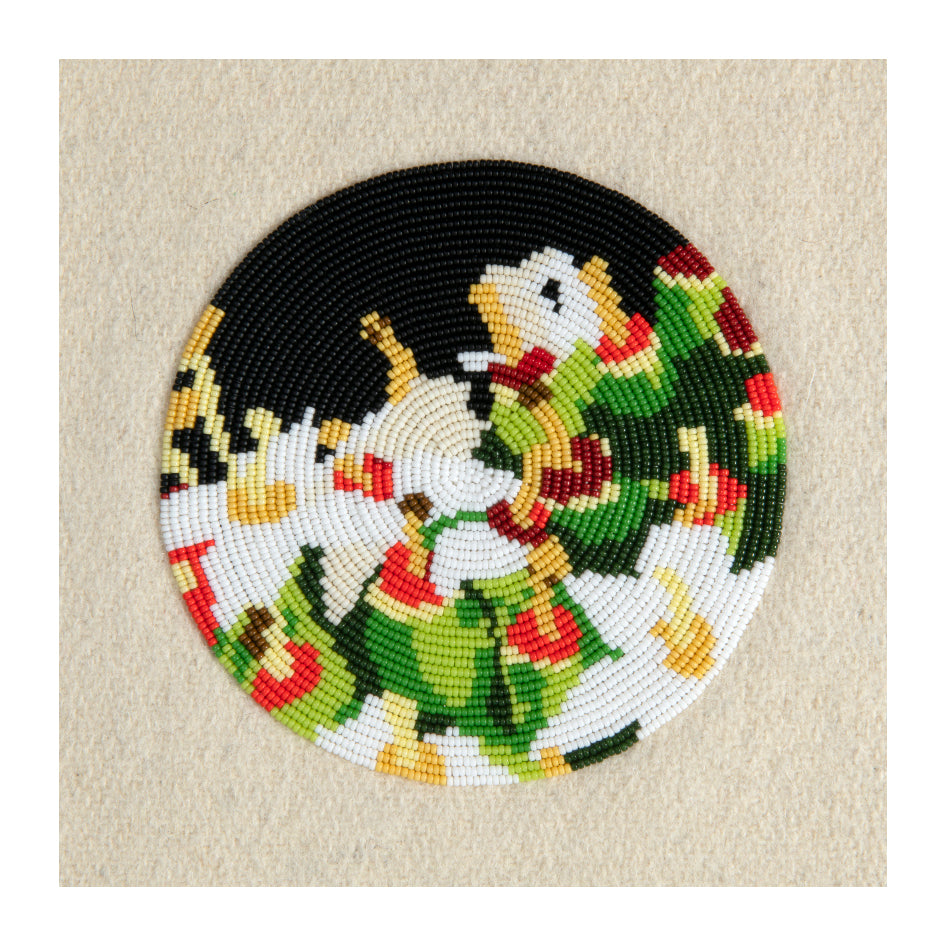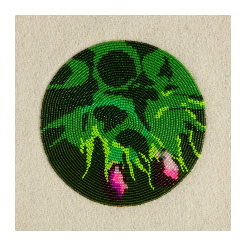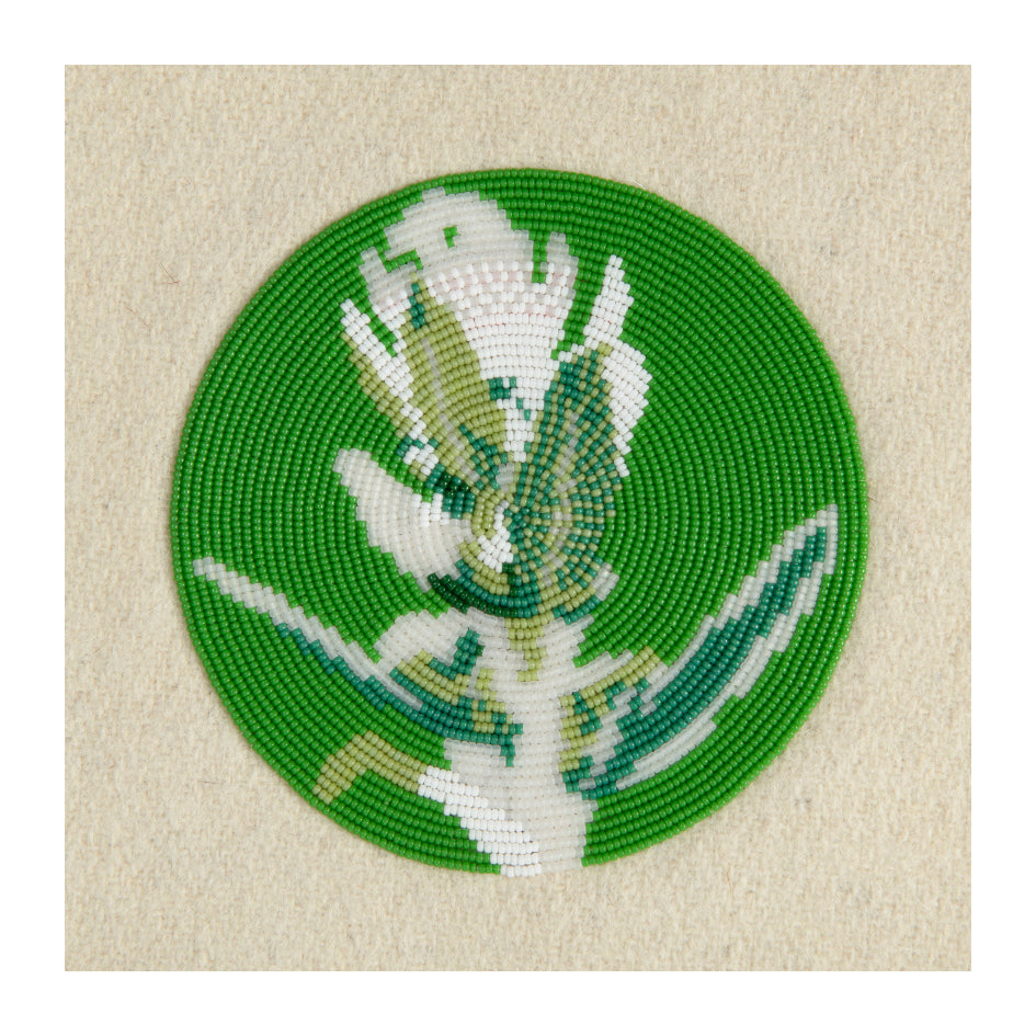 This series of 10 prints titled First Family features of ten circular beaded depictions of medicinal plants from what is now known as north west Alberta, Canada, where the artist’s family originates. These prints are images of the beaded pieces that are made with size 15 miyuki and toho beads on stroud (a trade cloth, commonly used by Metis people). These prints show the intricate detail of the beading, a time intensive practice that the artist utilizes to draw connections to the plants depicted.