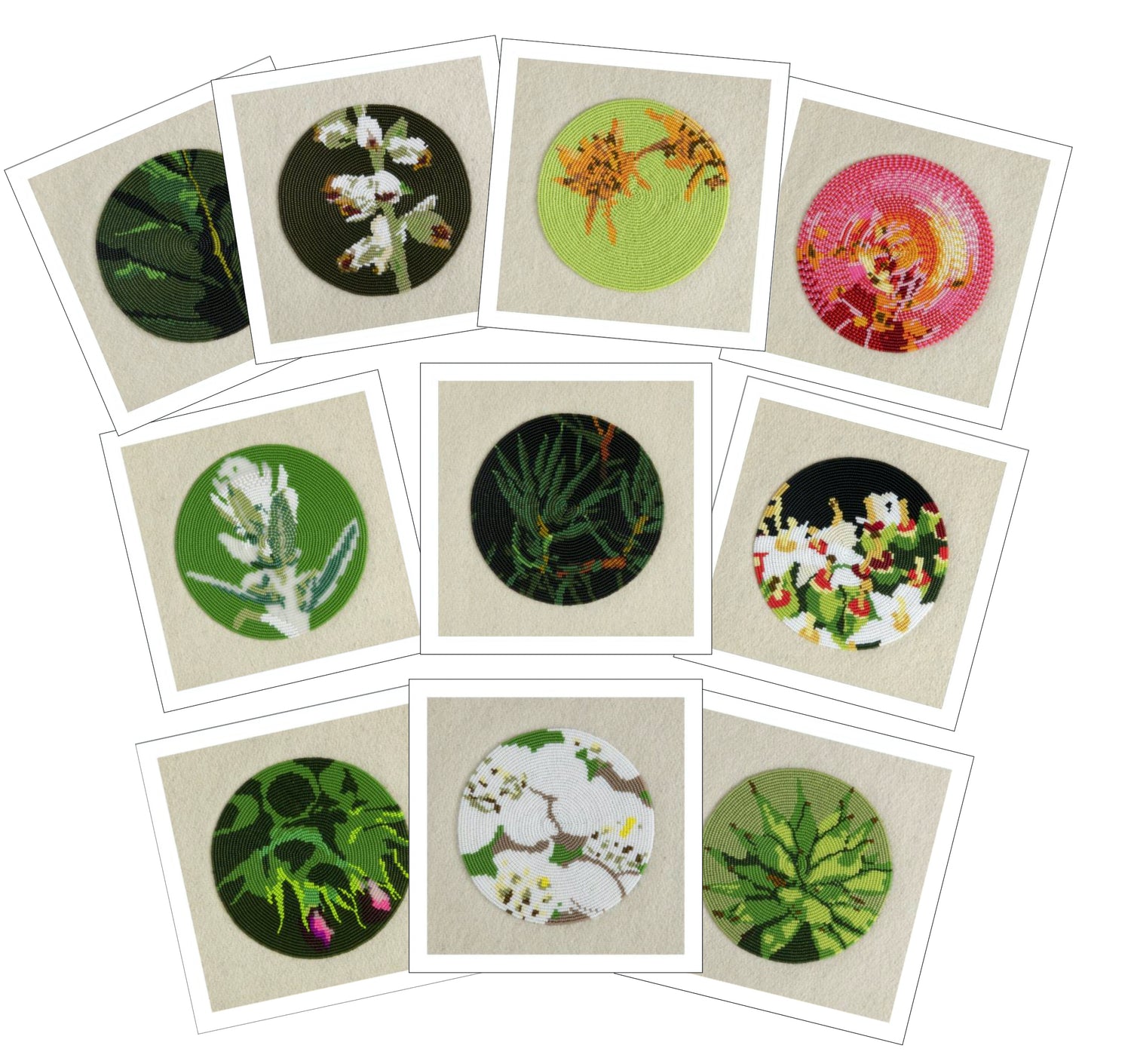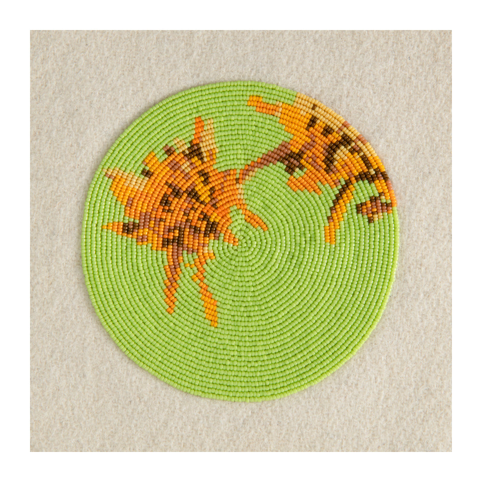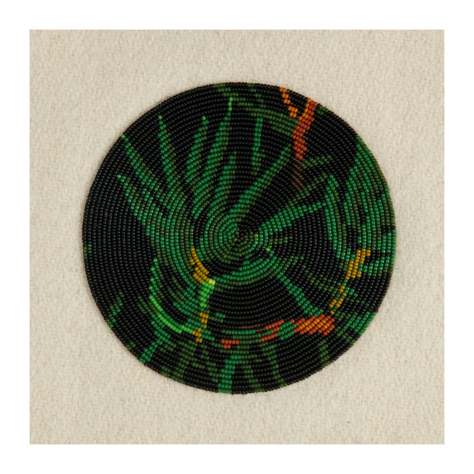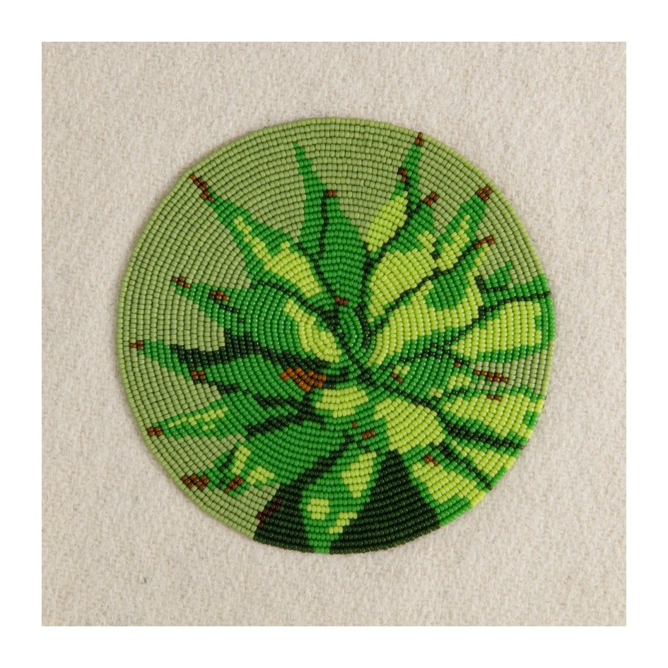 This series of 10 prints titled First Family features of ten circular beaded depictions of medicinal plants from what is now known as north west Alberta, Canada, where the artist’s family originates. These prints are images of the beaded pieces that are made with size 15 miyuki and toho beads on stroud (a trade cloth, commonly used by Metis people). These prints show the intricate detail of the beading, a time intensive practice that the artist utilizes to draw connections to the plants depicted.