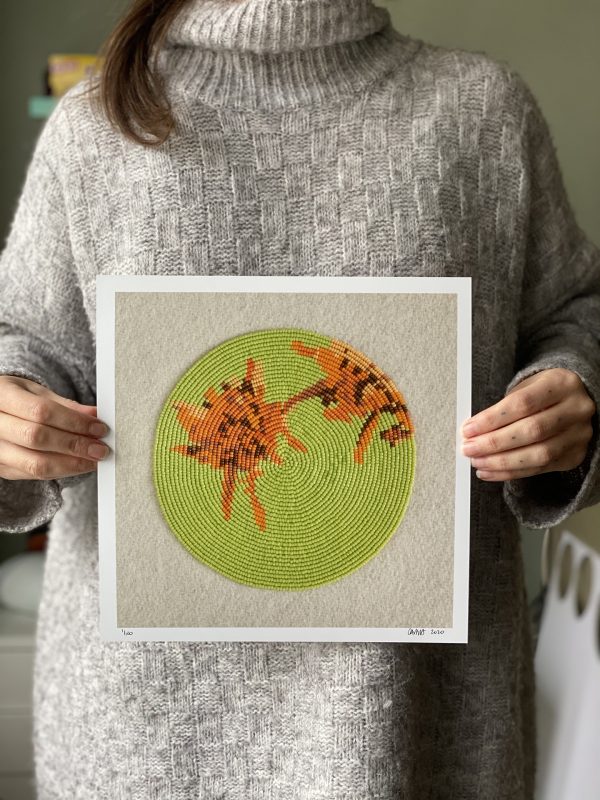 First Family a series of ten circular beaded depictions of medicinal plants from what is now known as north west Alberta, Canada, where the artist's family originates. These prints are images of the beaded pieces that are made with size 15 miyuki and toho beads on stroud (a trade cloth, commonly used by Metis people). These prints show the intricate detail of the beading, a time intensive practice that the artist utilizes to draw connections to the plants depicted.