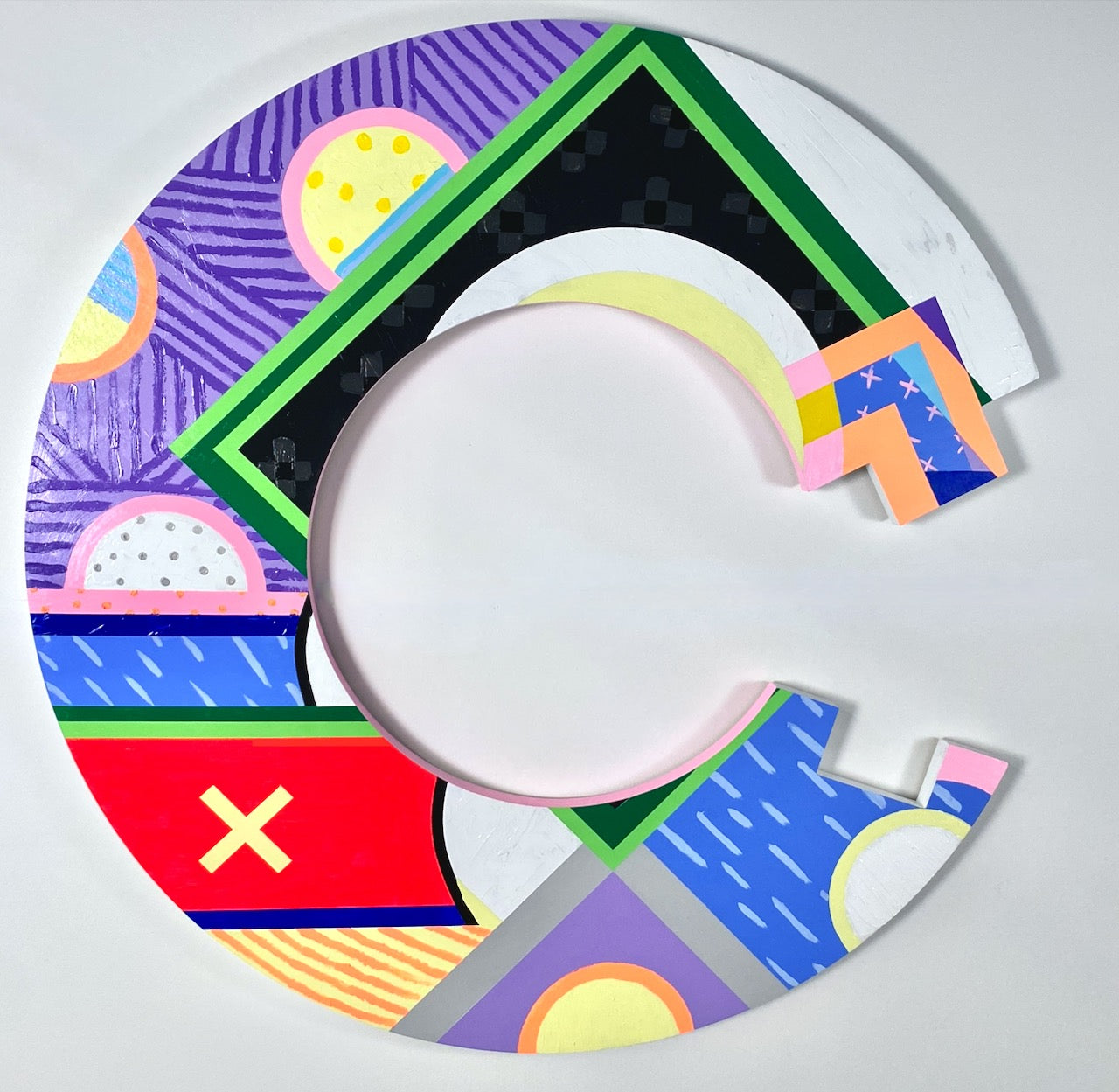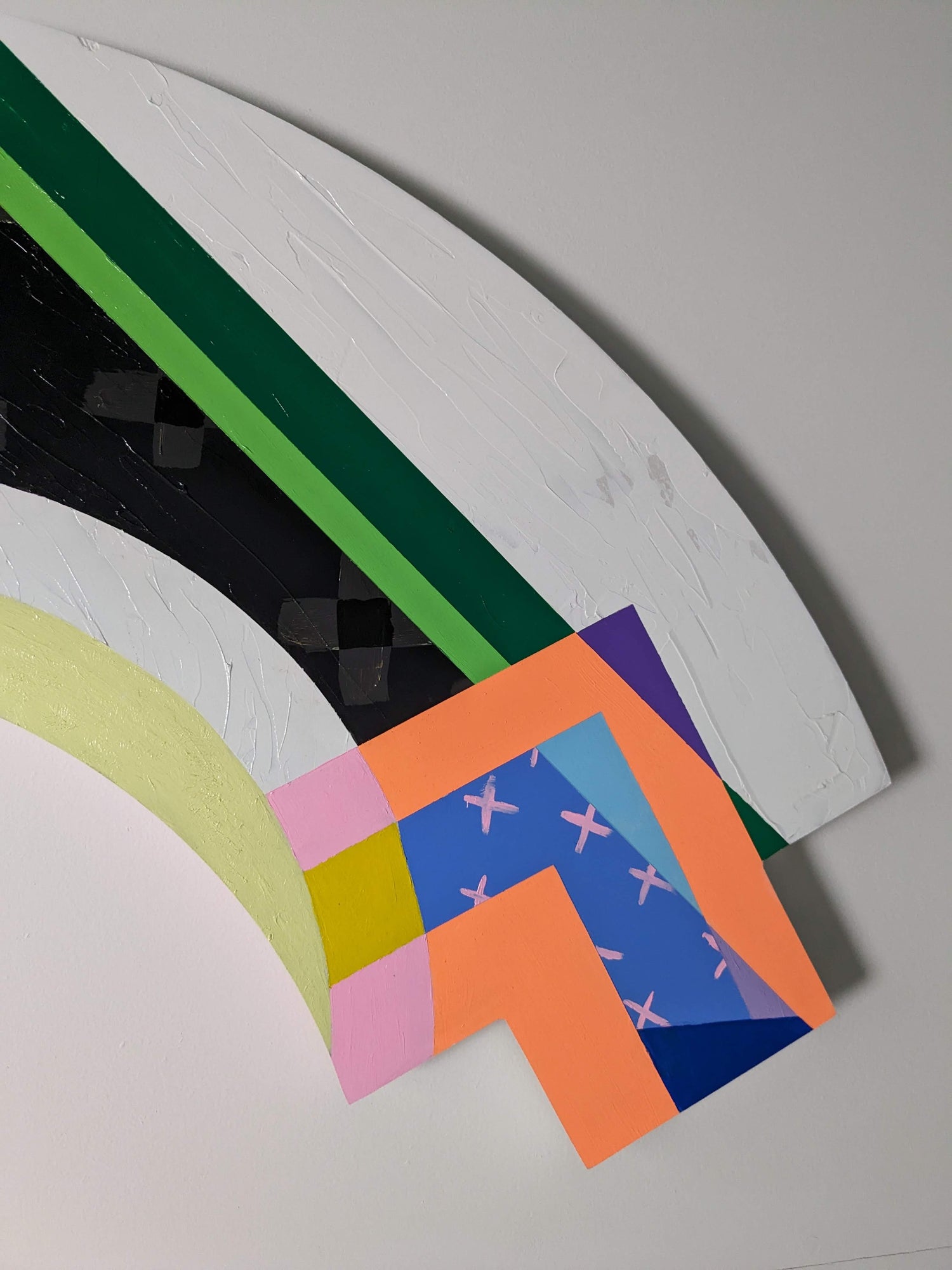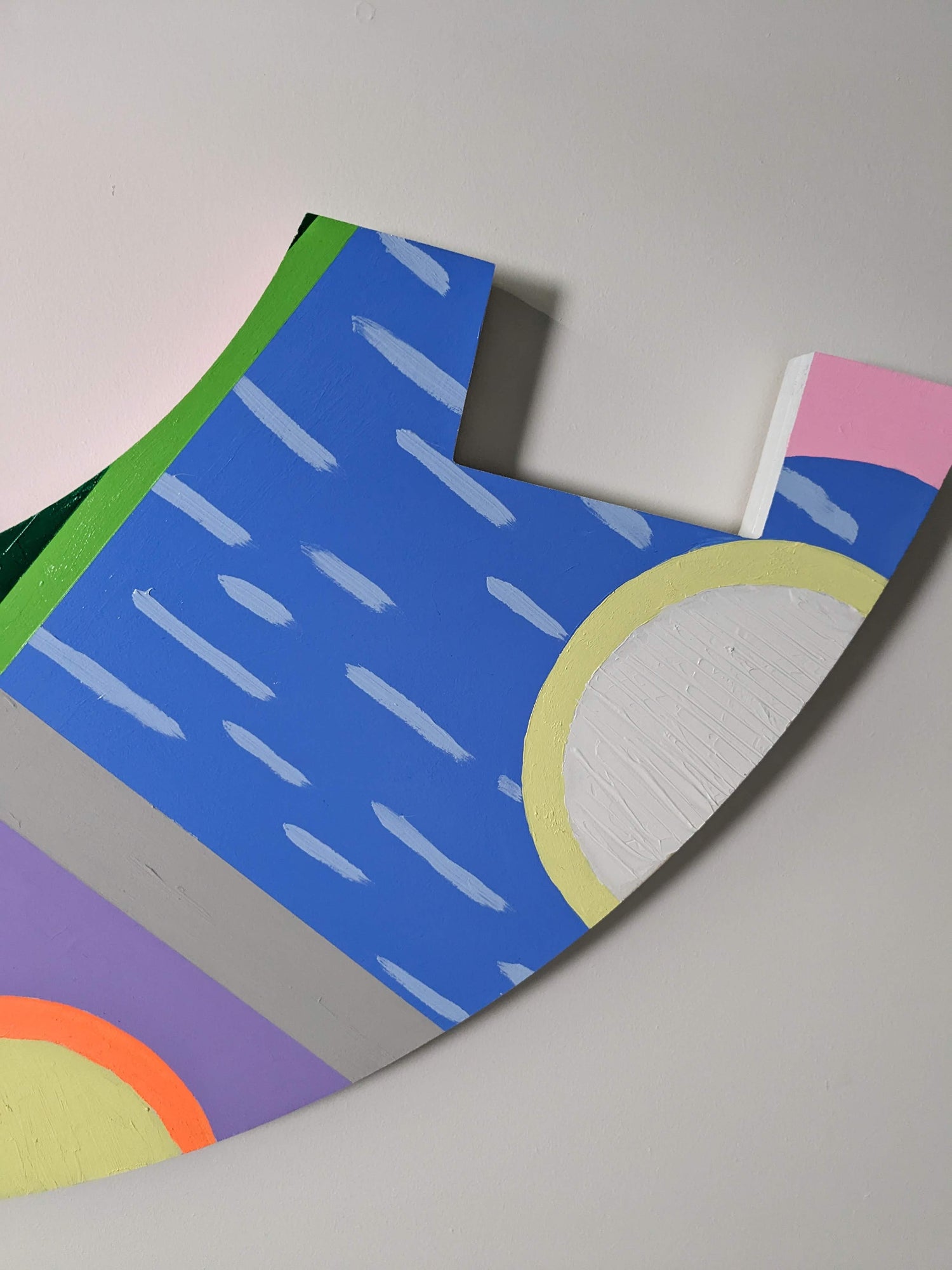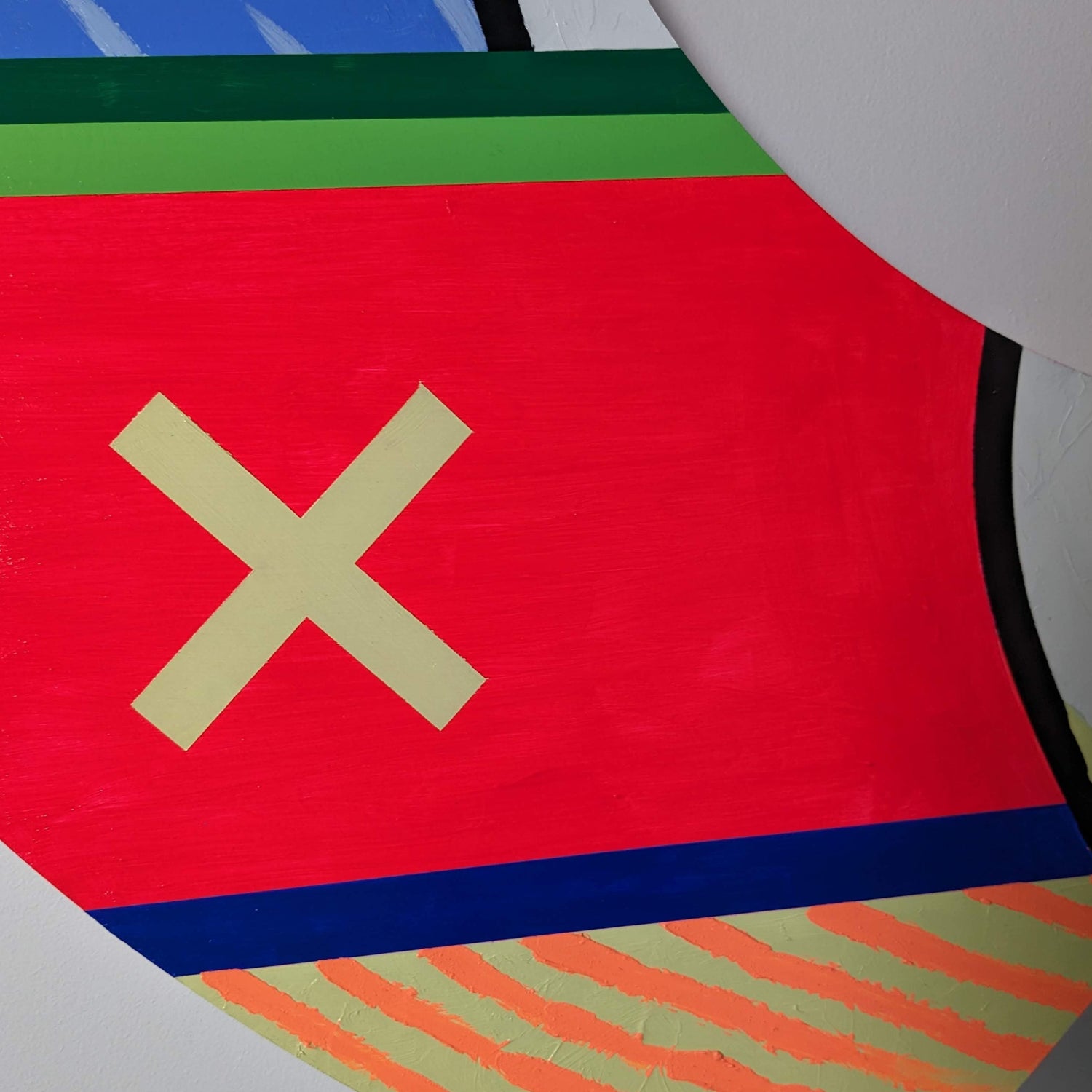 With my ongoing series of two-dimensional work which includes bright blocks of acrylic painting on cradled wooden panels, works on paper, murals, textiles and wall carvings, I am attempting to add my voice in the reawakening and remembering of certain aspects of Mi’kmaq visual culture. In my recent solo exhibition at the Art Gallery of Nova Scotia titled Ketu'elmita'jik, I created painting installations in response to and conversation with Mi’kmaq makers from past generations. In these paintings, I used vivid colour to translate the detailed composition of quillwork into large-scale geometric forms. Some ancestral artworks were embedded within my wall installations, marking the point of departure and inspiration for this contemporary reflection.