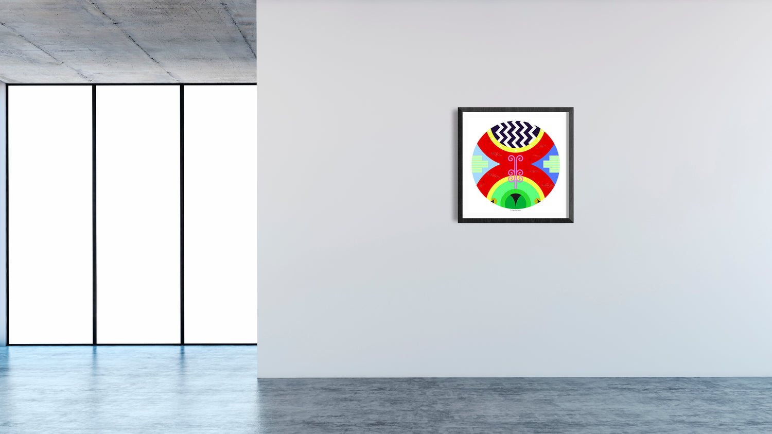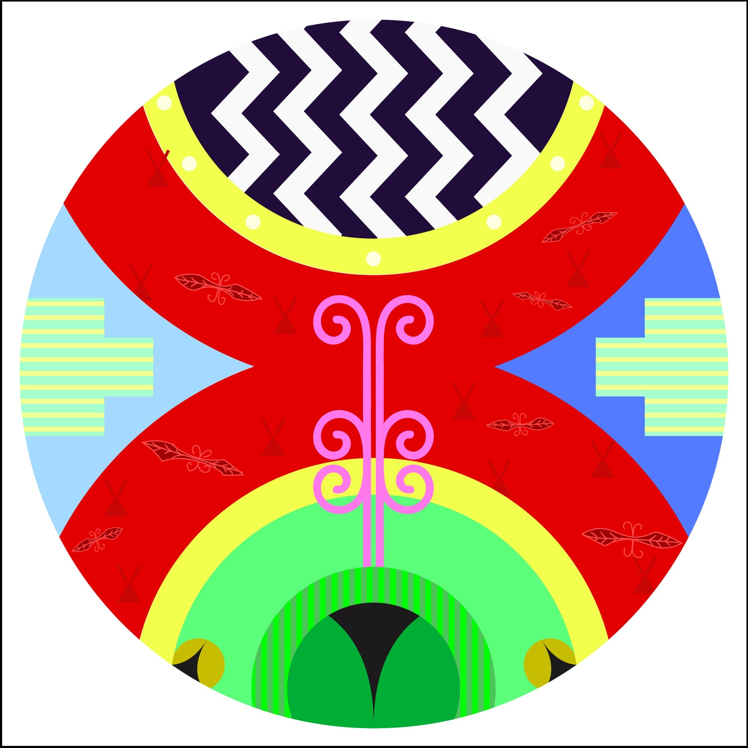This print is part of a series of 13 prints and derived from elements that were created for the 2019 Toronto Nuit Blanche, Kings and Queens of Scarborough project titled Tepknuset. For this site-specific installation, a series of large suspended fabric prints referencing porcupine quillwork and aluminum elements depicting Mi'kmaq petroglyph depictions of stars were suspended over a busy public space while 13 circular prints, each representing a moon in the Mi'kmaq year, were mounted on the ground below. The elements of the installation spoke of place, time, changing seasons and environment as embedded in Mi'kmaq visual culture. The piece was read as a story, but a story that could be narrated from any entry point, following shape, colour and form to experience the narratives of land, home and our place in the universe. A giclée print is an archival-quality printed reproduction of an original artwork, made using a specialized ink spray process (giclée is French for "to spray") developed exclusively for fine art printing. Giclée prints are printed either on canvas or fine art paper using 100% archival inks and media. The giclée print is the closet possible reproduction of an original work of art afforded by technology and has become the new print standard for artists.