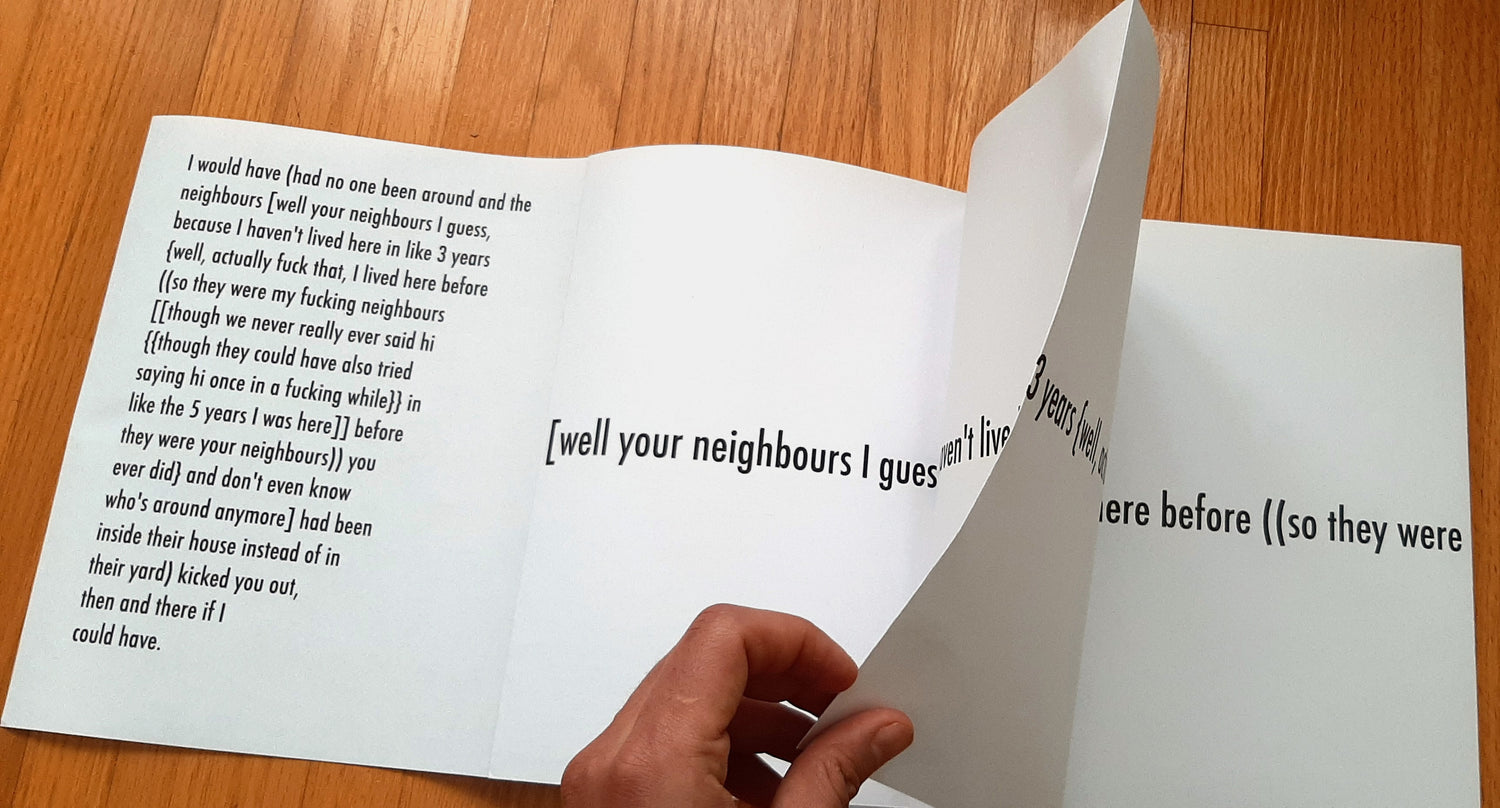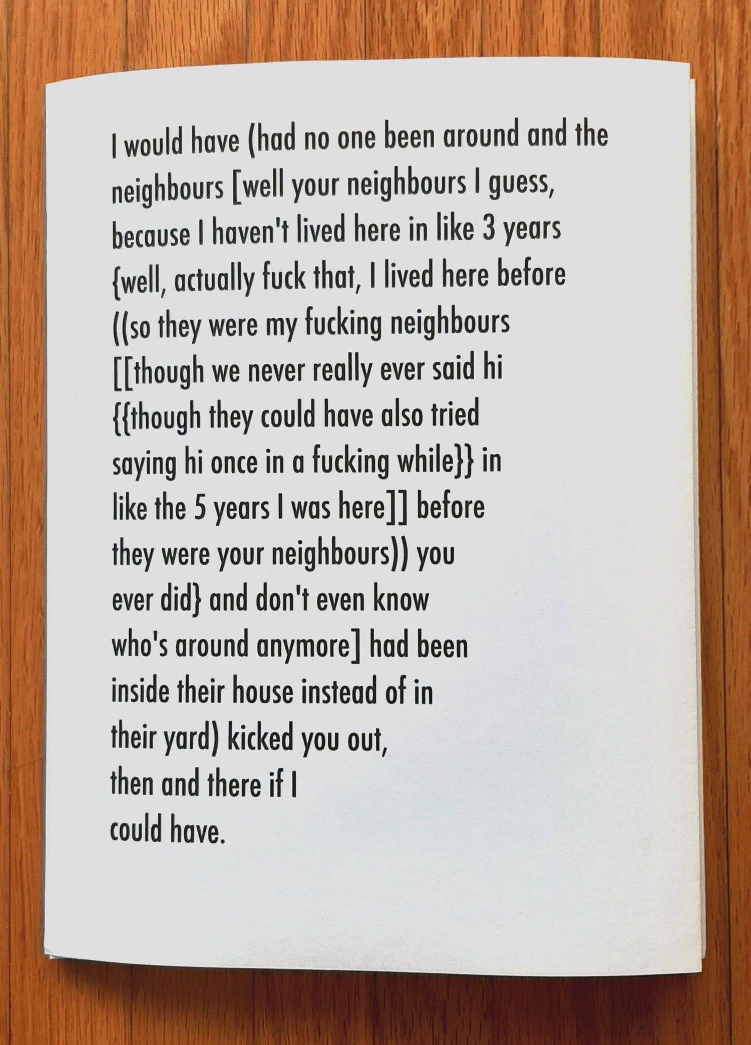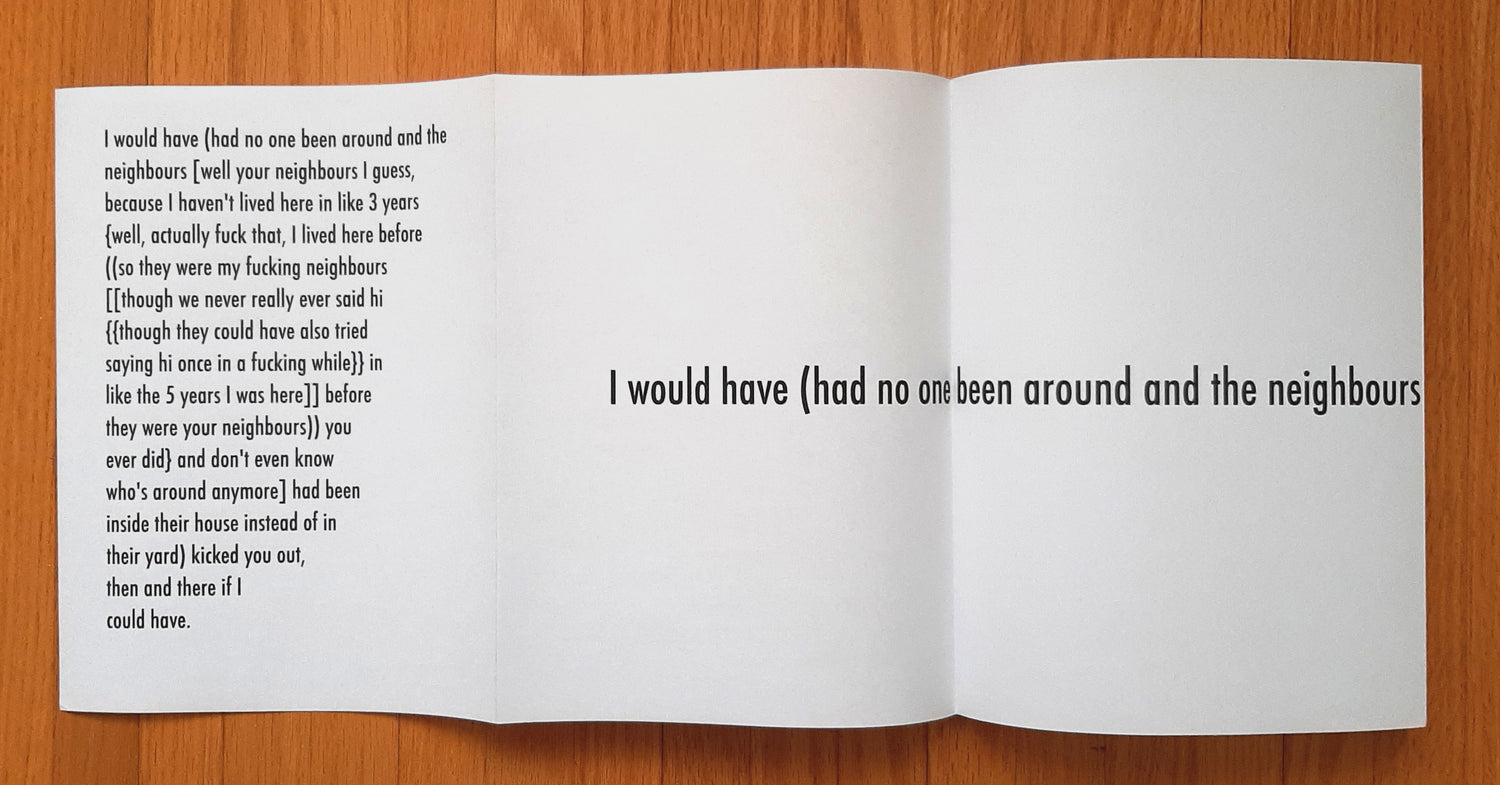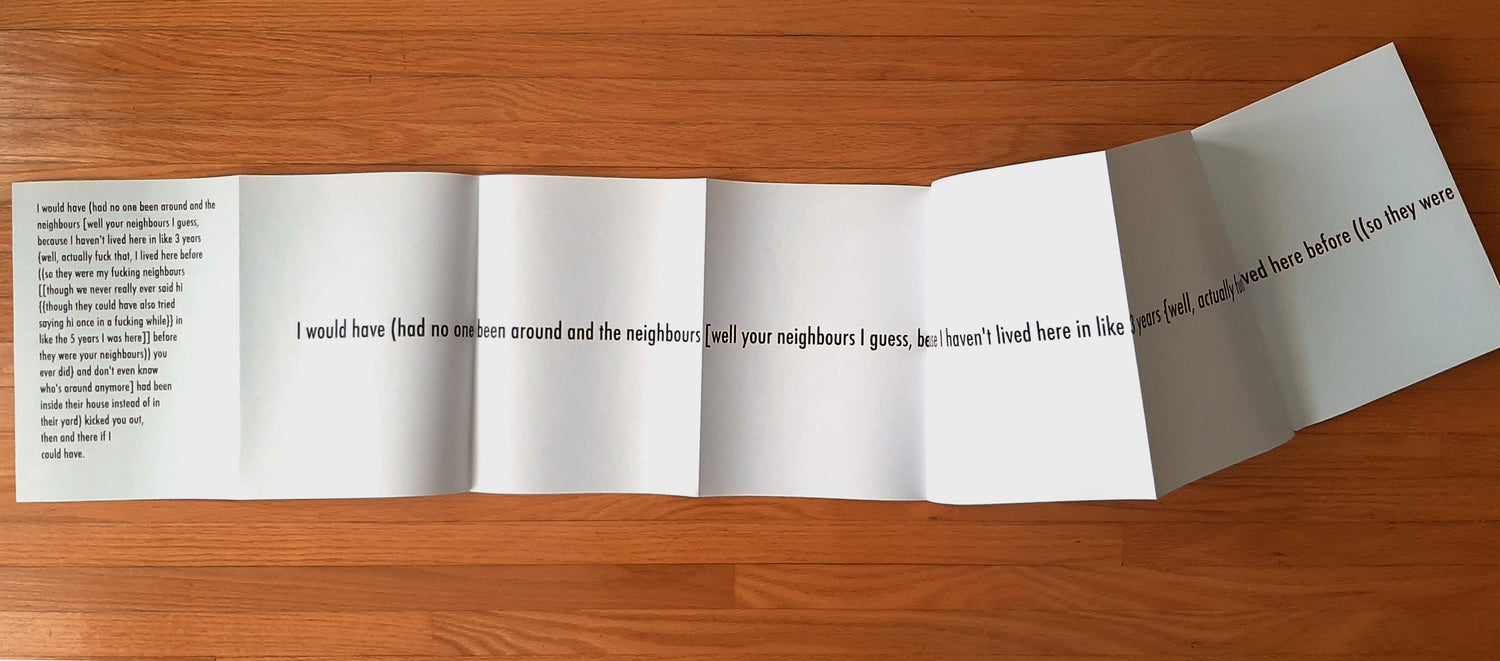 A fictional series of utterances from a landlord directed to a tenant written as nested sentences. The format seeks to reflect in writing the tangential meanderings of vernacular speech to break down English syntax beyond coherence. The work is printed on a continuous length of paper from a roll and is hand-folded into a booklet format.