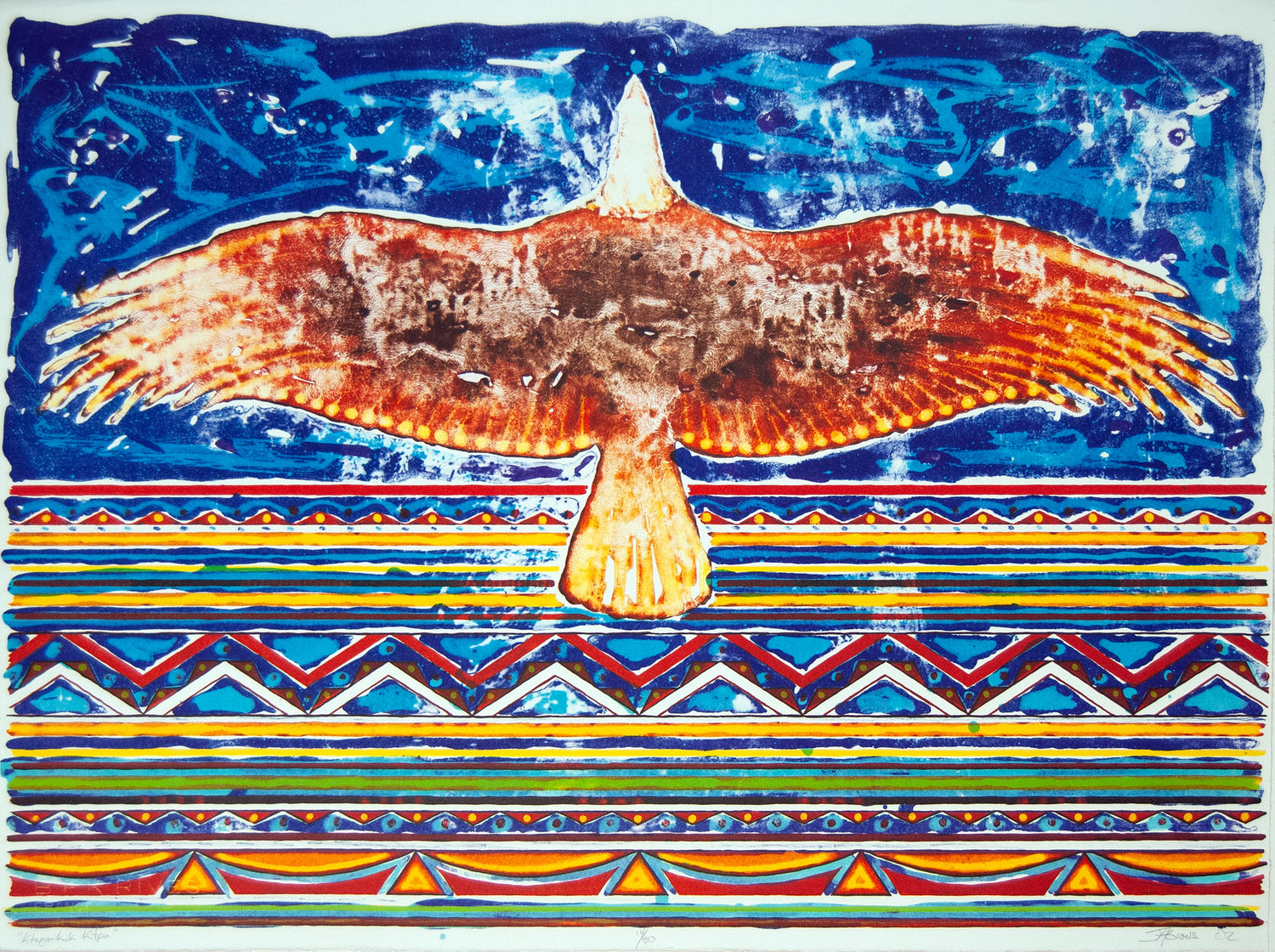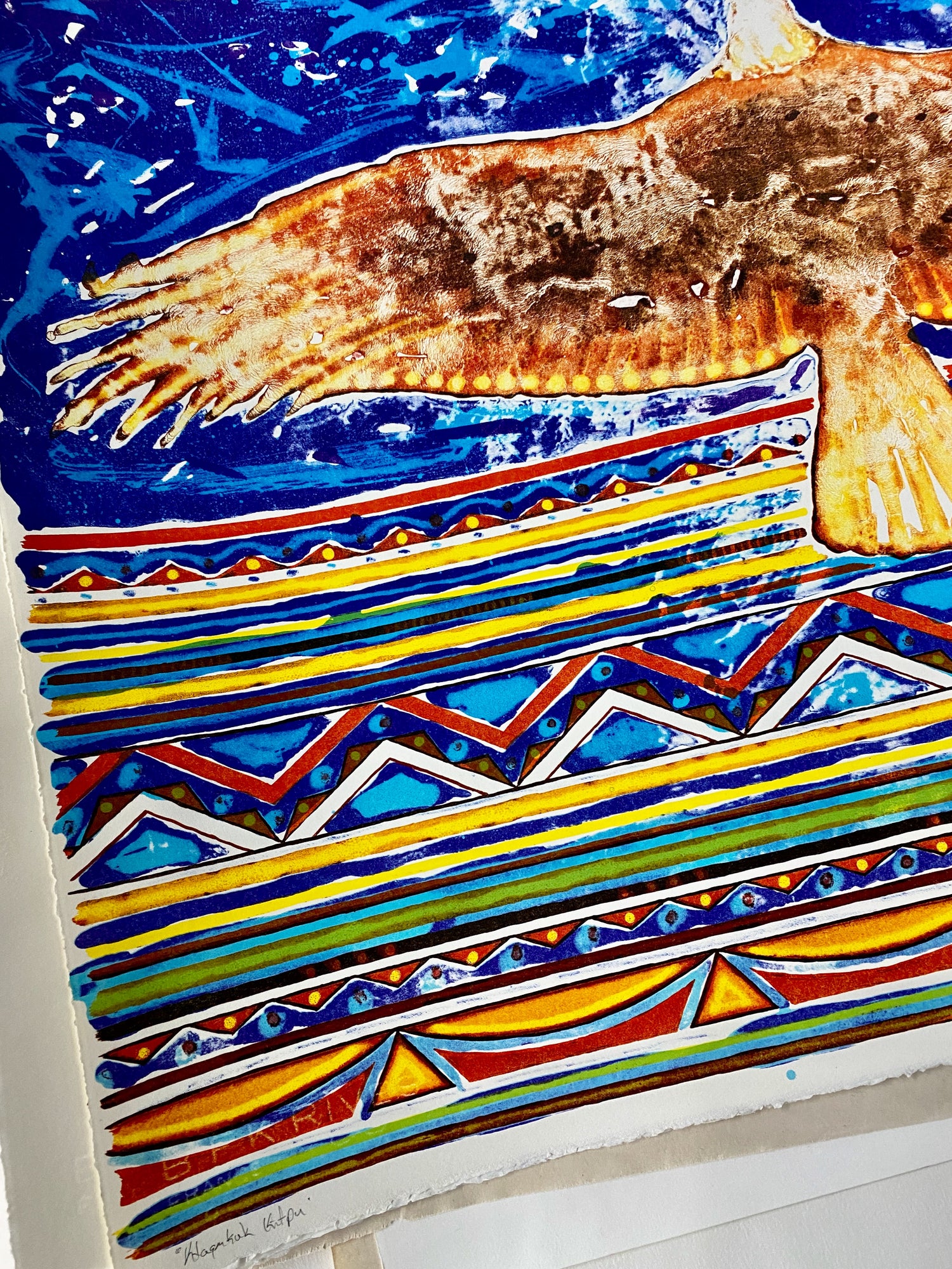 The artist works primarily as a painter and printmaker but also brings together his experience in film, design, and traditional hand poke tattooing to reach beyond Western ideologies as a means of expression and gift exchange. Jerry’s practice is deeply rooted in his Mi’kmaq heritage and his artistry comes alive in the creation of his own regalia for powwow dancing and in his commitment to sharing and learning with communities all over Mi’kma’ki.