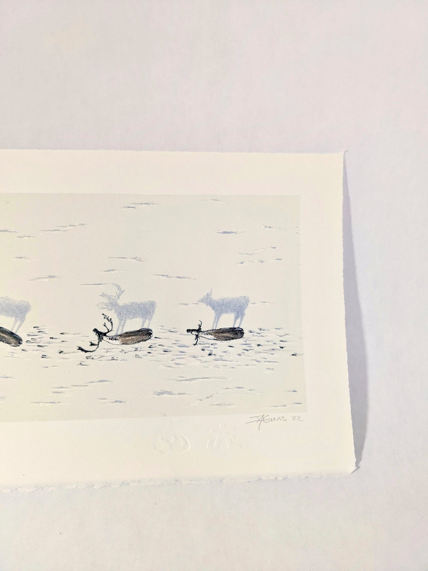 Jerry Evans works primarily as a painter and printmaker but also brings together his experience in film, design, and traditional hand poke tattooing to reach beyond Western ideologies as a means of expression and gift exchange. Jerry’s practice is deeply rooted in his Mi’kmaq heritage and his artistry comes alive in the creation of his own regalia for powwow dancing and in his commitment to sharing and learning with communities all over Mi’kma’ki.