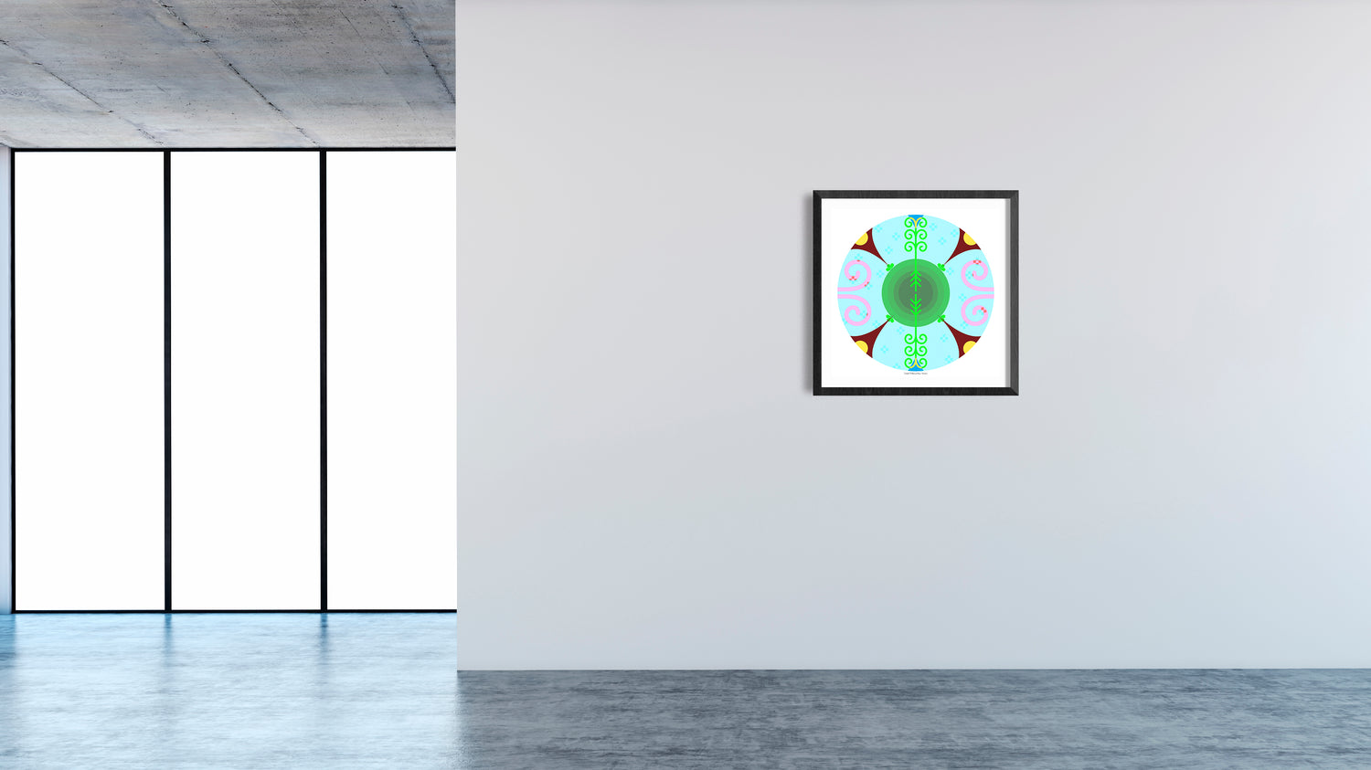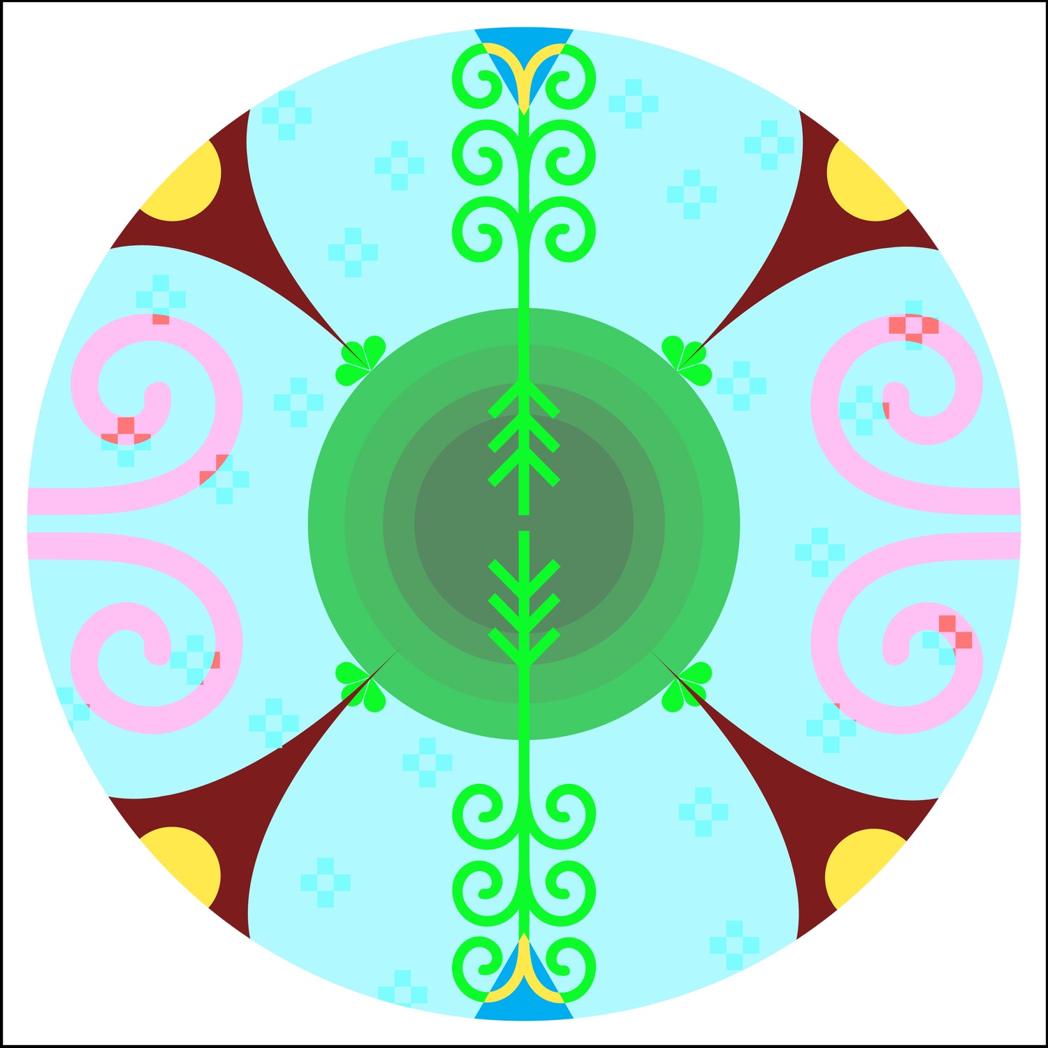 This print is part of a series of 13 prints and derived from elements that were created for the 2019 Toronto Nuit Blanche, Kings and Queens of Scarborough project titled Tepknuset. For this site-specific installation, a series of large suspended fabric prints referencing porcupine quillwork and aluminum elements depicting Mi'kmaq petroglyph depictions of stars were suspended over a busy public space while 13 circular prints, each representing a moon in the Mi'kmaq year, were mounted on the ground below. The elements of the installation spoke of place, time, changing seasons and environment as embedded in Mi'kmaq visual culture. The piece was read as a story, but a story that could be narrated from any entry point, following shape, colour and form to experience the narratives of land, home and our place in the universe. A giclée print is an archival-quality printed reproduction of an original artwork, made using a specialized ink spray process (giclée is French for "to spray") developed exclusively for fine art printing. Giclée prints are printed either on canvas or fine art paper using 100% archival inks and media. The giclée print is the closet possible reproduction of an original work of art afforded by technology and has become the new print standard for artists.