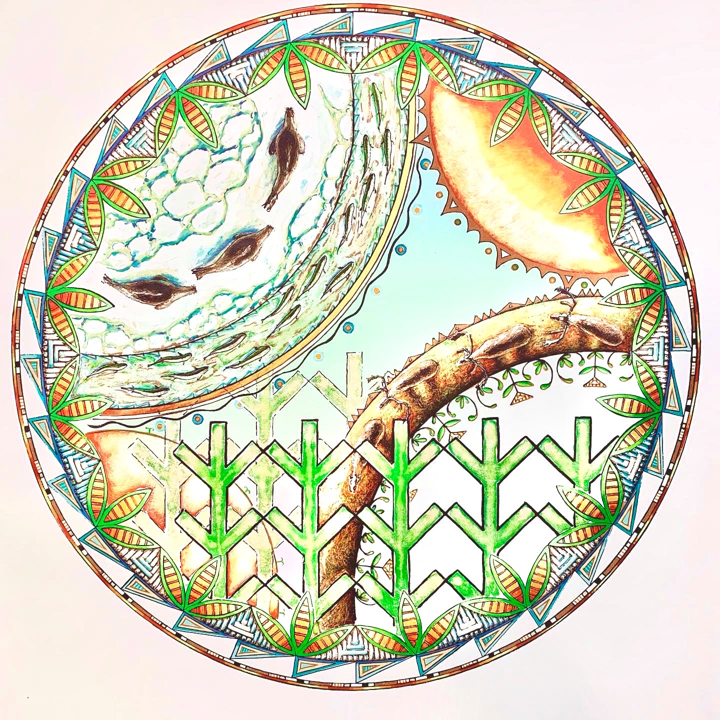 The artist works primarily as a painter and printmaker but also brings together his experience in film, design, and traditional hand poke tattooing to reach beyond Western ideologies as a means of expression and gift exchange. Jerry’s practice is deeply rooted in his Mi’kmaq heritage and his artistry comes alive in the creation of his own regalia for powwow dancing and in his commitment to sharing and learning with communities all over Mi’kma’ki.