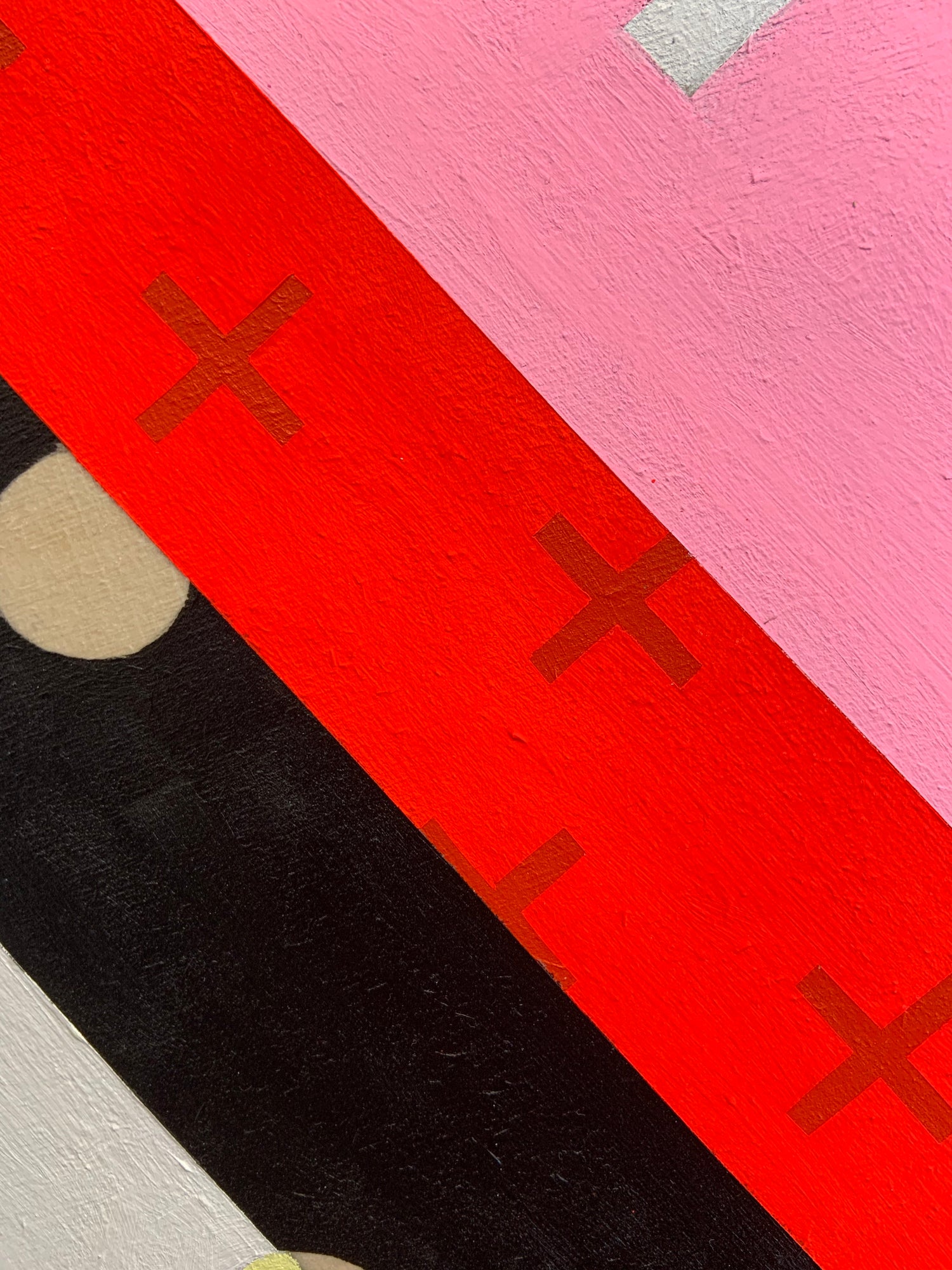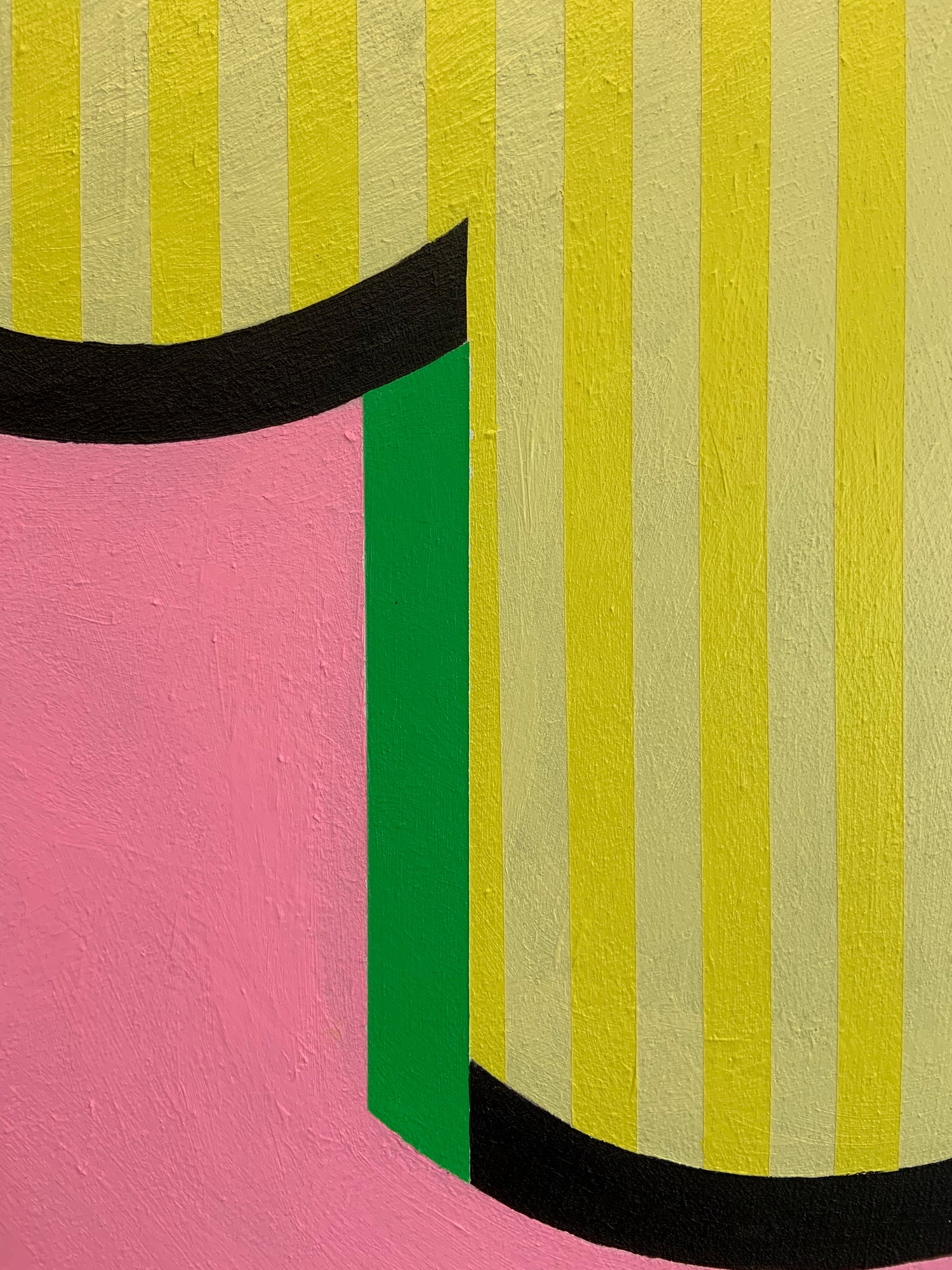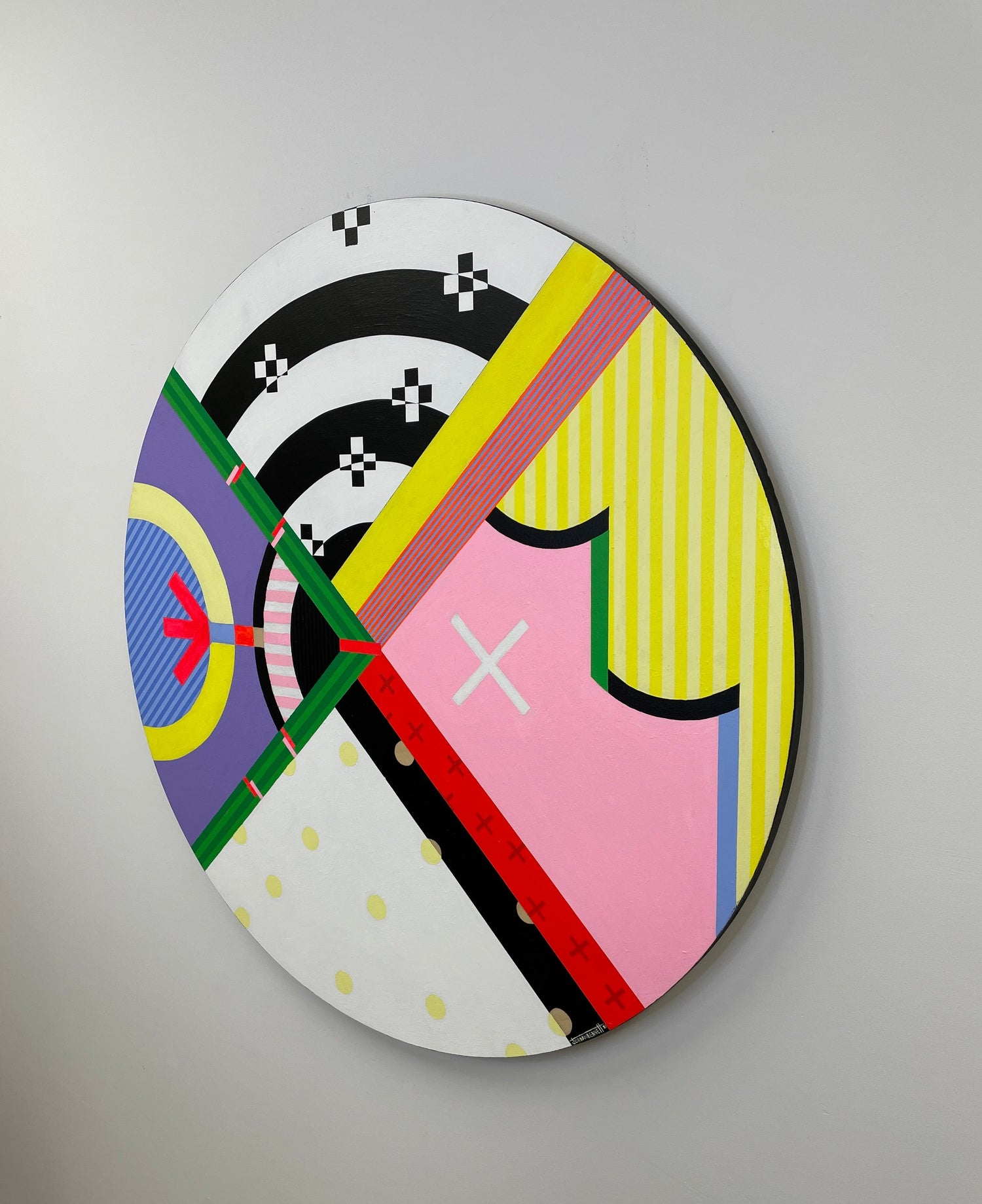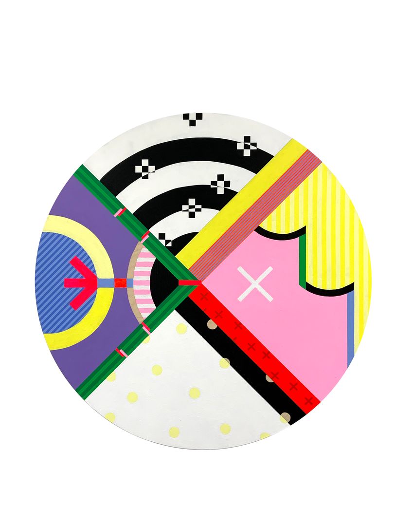 With my ongoing series of two-dimensional work which includes bright blocks of acrylic painting on cradled wooden panels, works on paper, murals, textiles and wall carvings, I am attempting to add my voice in the reawakening and remembering of certain aspects of Mi’kmaq visual culture. In my recent solo exhibition at the Art Gallery of Nova Scotia titled Ketu'elmita'jik, I created painting installations in response to and conversation with Mi’kmaq makers from past generations. In these paintings, I used vivid colour to translate the detailed composition of quillwork into large-scale geometric forms. Some ancestral artworks were embedded within my wall installations, marking the point of departure and inspiration for this contemporary reflection.