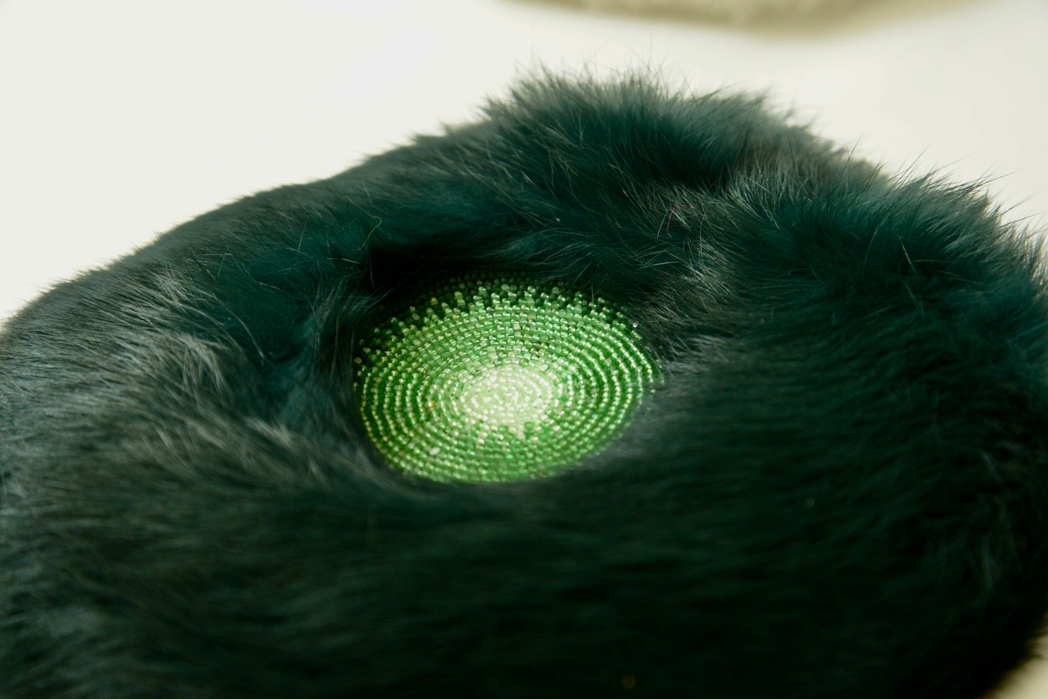 Hand signed by the artist. Rabbit fur, charlotte beads, and wood frame