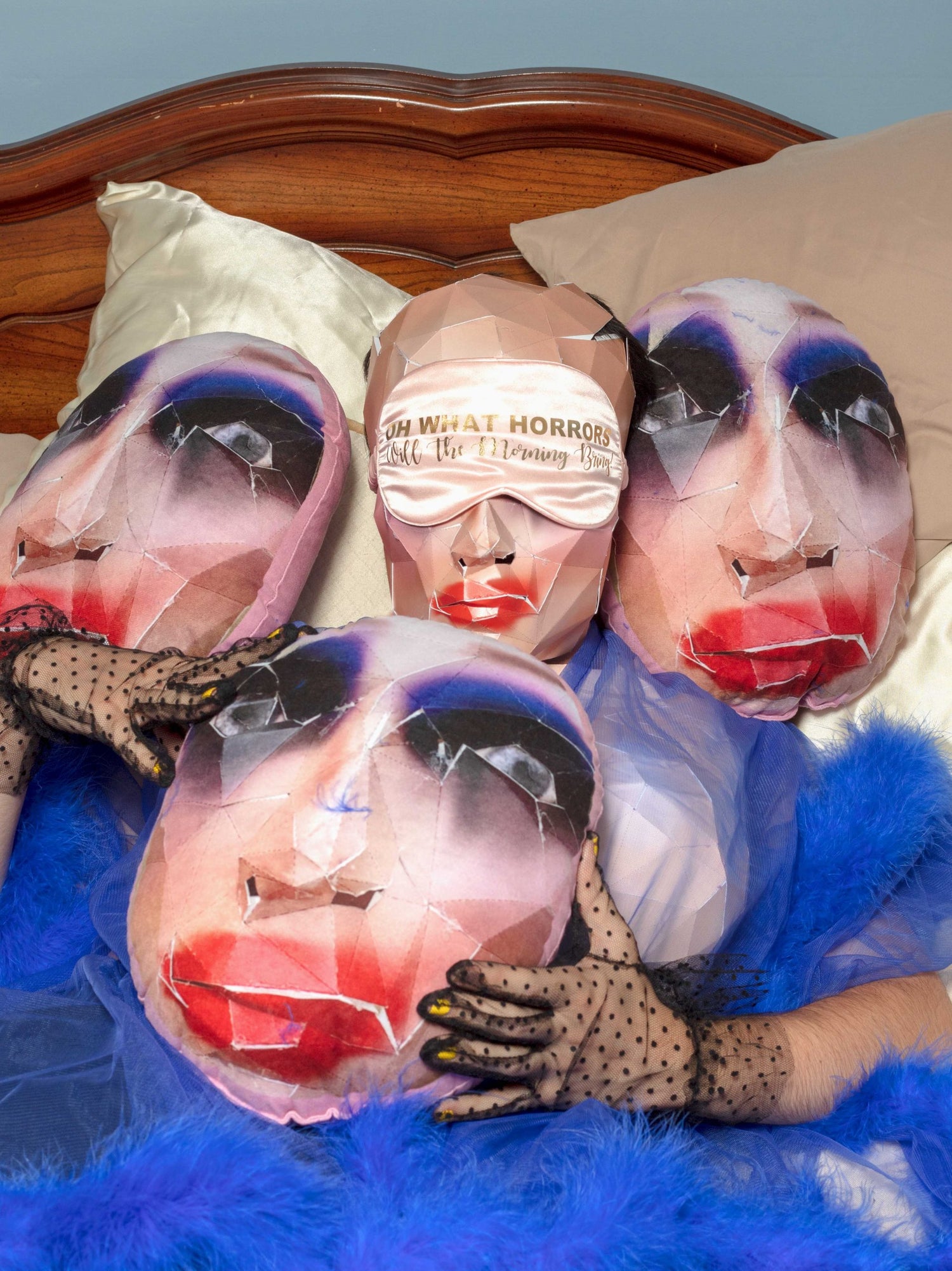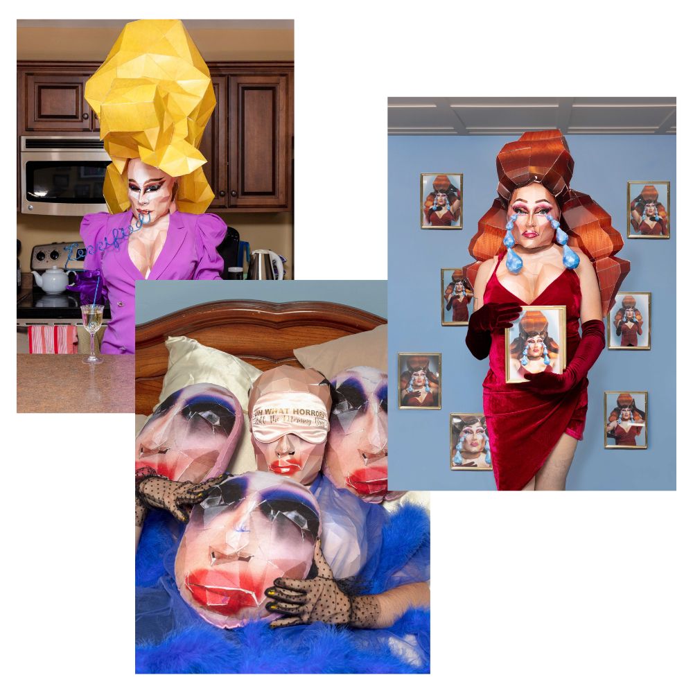 Gallagher’s interest in recent years has been combining elements of drag and video games, examining the fantastical embodiment integral to each art form. They have developed a process of digitally modelling drag-influences masks, costumes, headpieces, and breastplates which they then convert into paper templates to construct physically. Throughout their recent photography, video and virtual reality work, they have heavily incorporated these paper models as a means of integrating digital aesthetics into a physical space.
