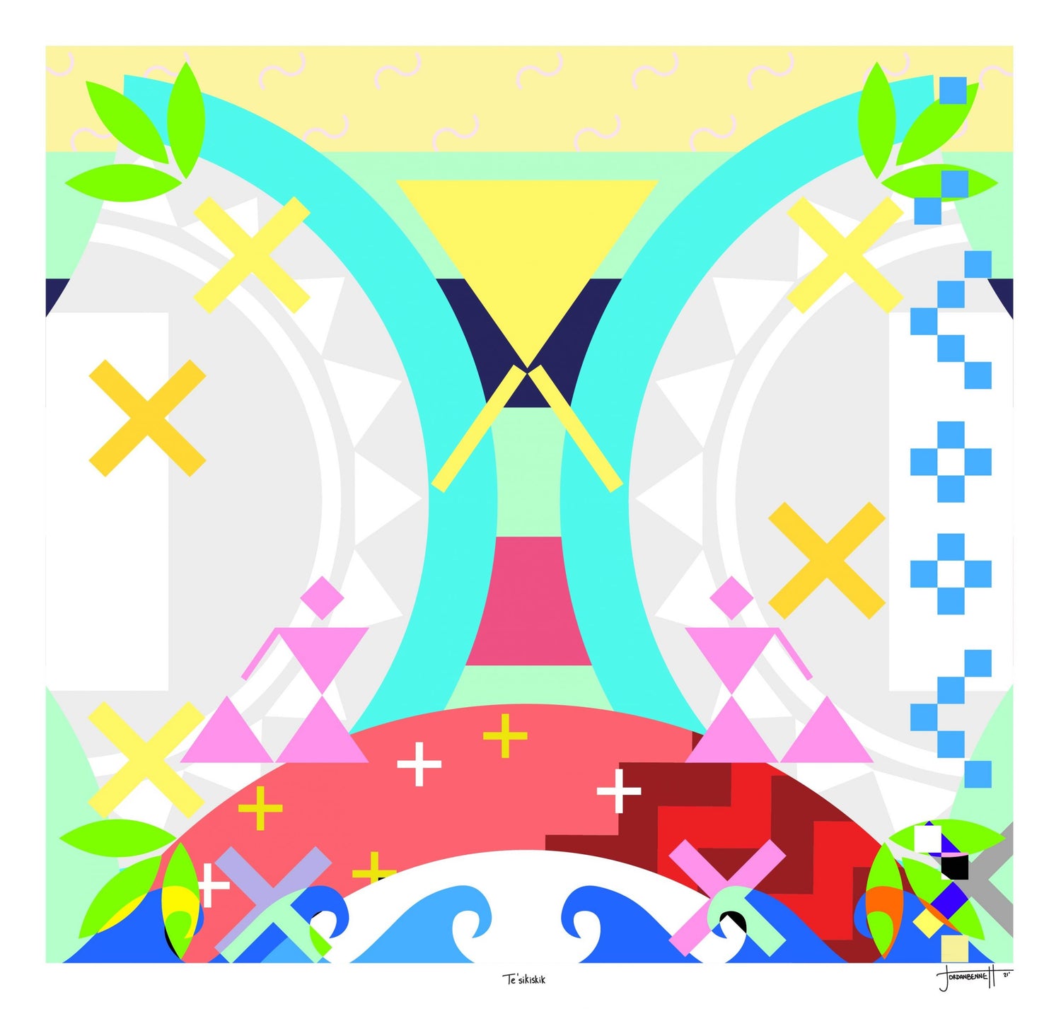 This print Te'sikiskik (Every Day) has a counterpart titled Te'sitpa'q (Every Night), both by artist Jordan Bennett and are based on an original commission by Nocturne Art at Night in 2019. The installation was titled Ne'ata'q (Sun is Coming Out) and installed on Barrington Street in Halifax, for DHBC's from Gritty to Pretty Program. These works are printed on William Turner rag paper. A giclée print is an archival-quality printed reproduction of an original artwork, made using a specialized ink spray process (giclée is French for "to spray") developed exclusively for fine art printing. Giclée prints are printed either on canvas or fine art paper using 100% archival inks and media. The giclée print is the closet possible reproduction of an original work of art afforded by technology and has become the new print standard for artists.