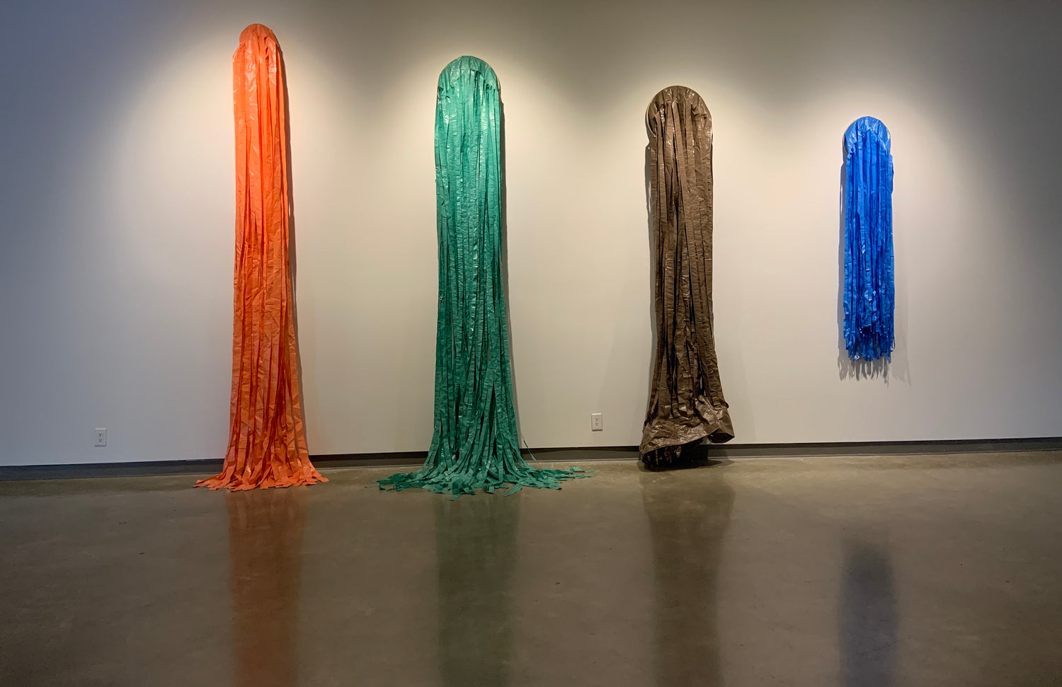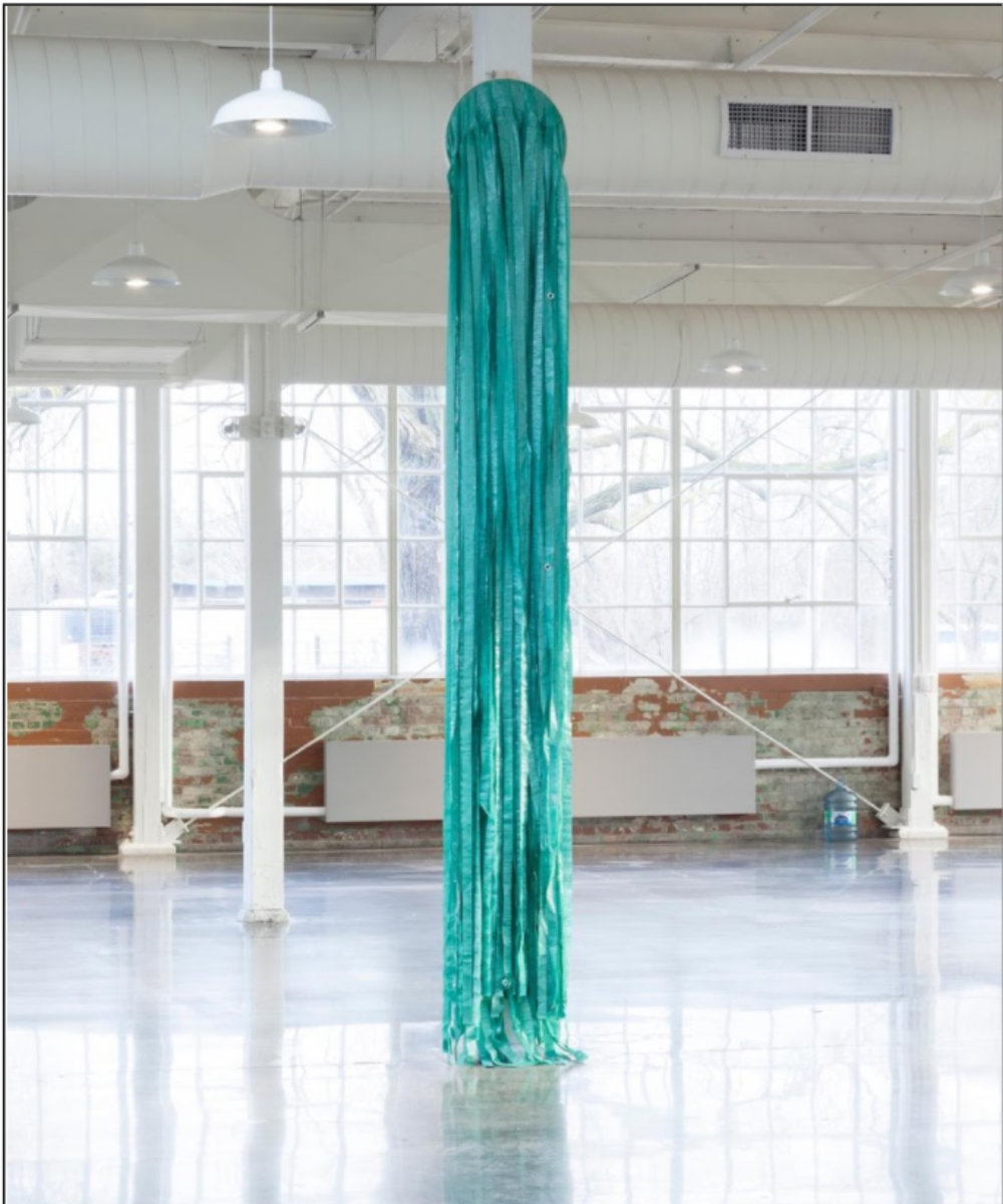 Amy Malbeuf creates a reflection on historical Métis material culture, and references historical and contemporary modes of exchange in this work. She uses this rounded shape across many artworks, and it reflects the artist's interpretation of a Métis fire bag.