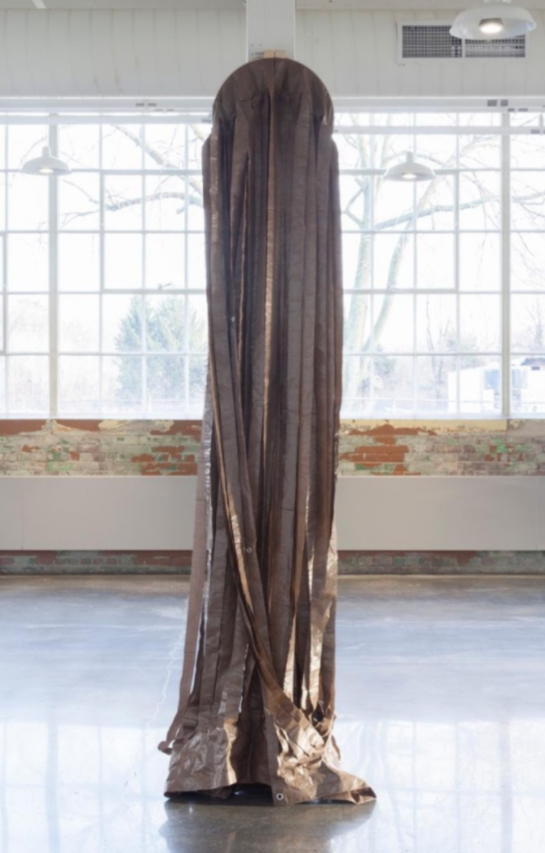 Amy Malbeuf creates a reflection on historical Métis material culture, and references historical and contemporary modes of exchange in this work. She uses this rounded shape across many artworks, and it reflects the artist's interpretation of a Métis fire bag.