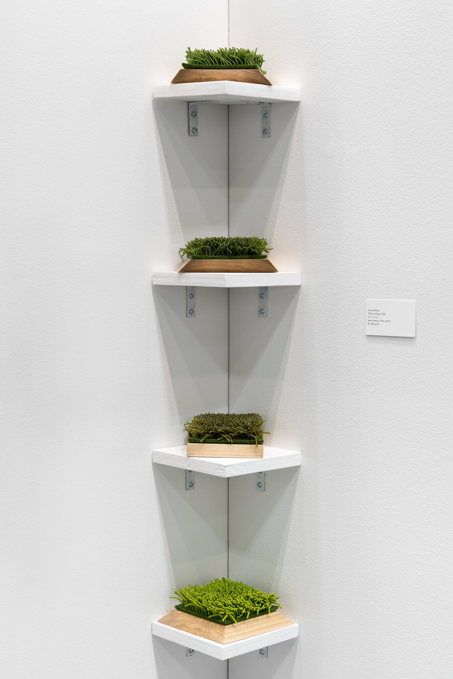 For the past few years Carrie Allison has begun a new body of work focusing on grass, and other monocultures such as wheat, barley, and oats, that have been used as colonial space taking tools. These crops are, historically and presently, strategically placed to guide movement, elevate status, signal respectable use of land, and point to morality, purity and cleanliness. The experience of making these extremely laborious sculptures has inspired the artist to think deeply about how land is used in North America and how it’s tied to moral responsibilities and settler colonial laws and by-laws.they built fields of grass on sawdust (maple), (cedar), (white oak) are sculptures that depict how colonial policy promotes the destruction of trees (old growth forests on the west coast, old growth pines being decimated in the east, most recently the green belt in Ontario, OKA) for individual and corporate profit.