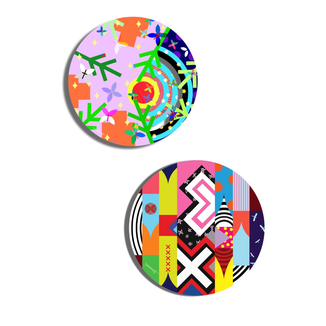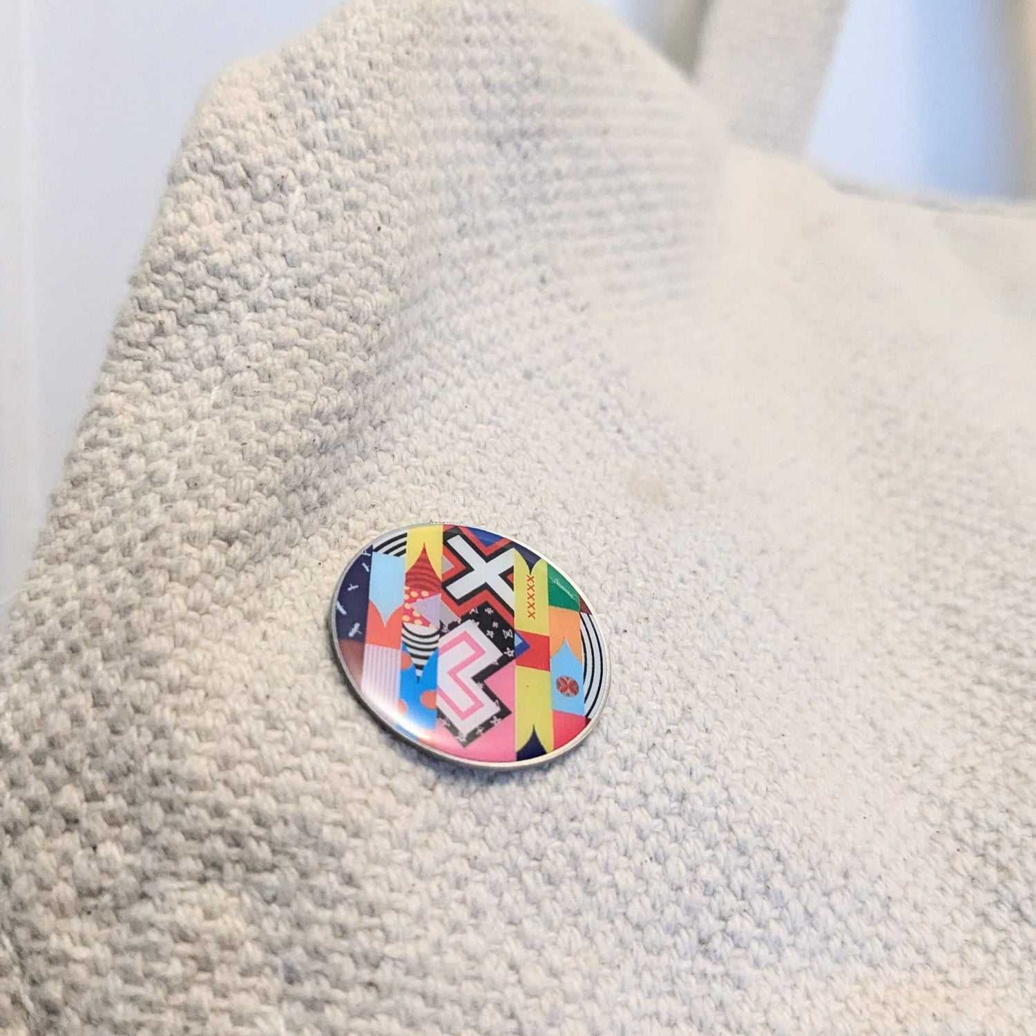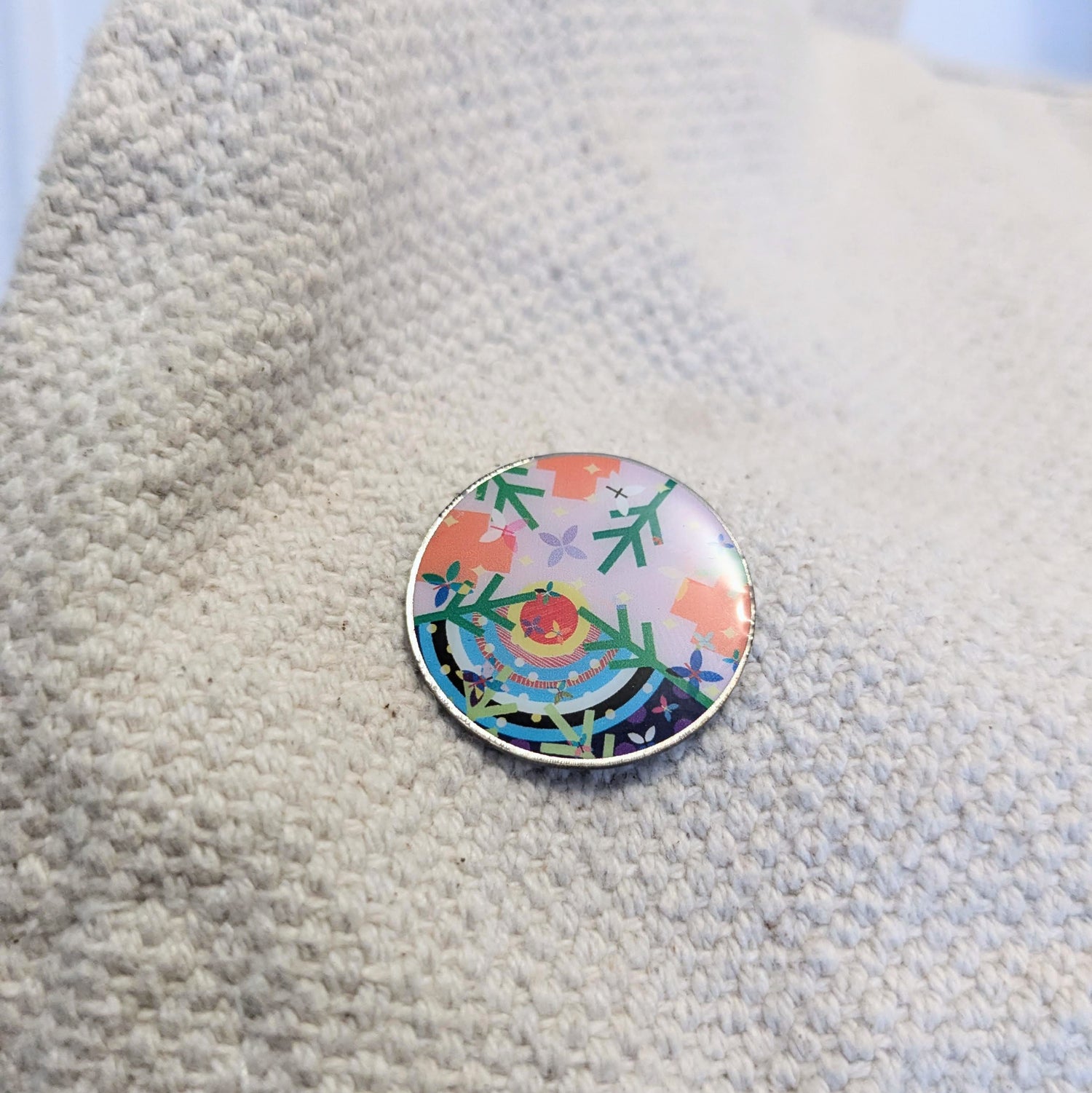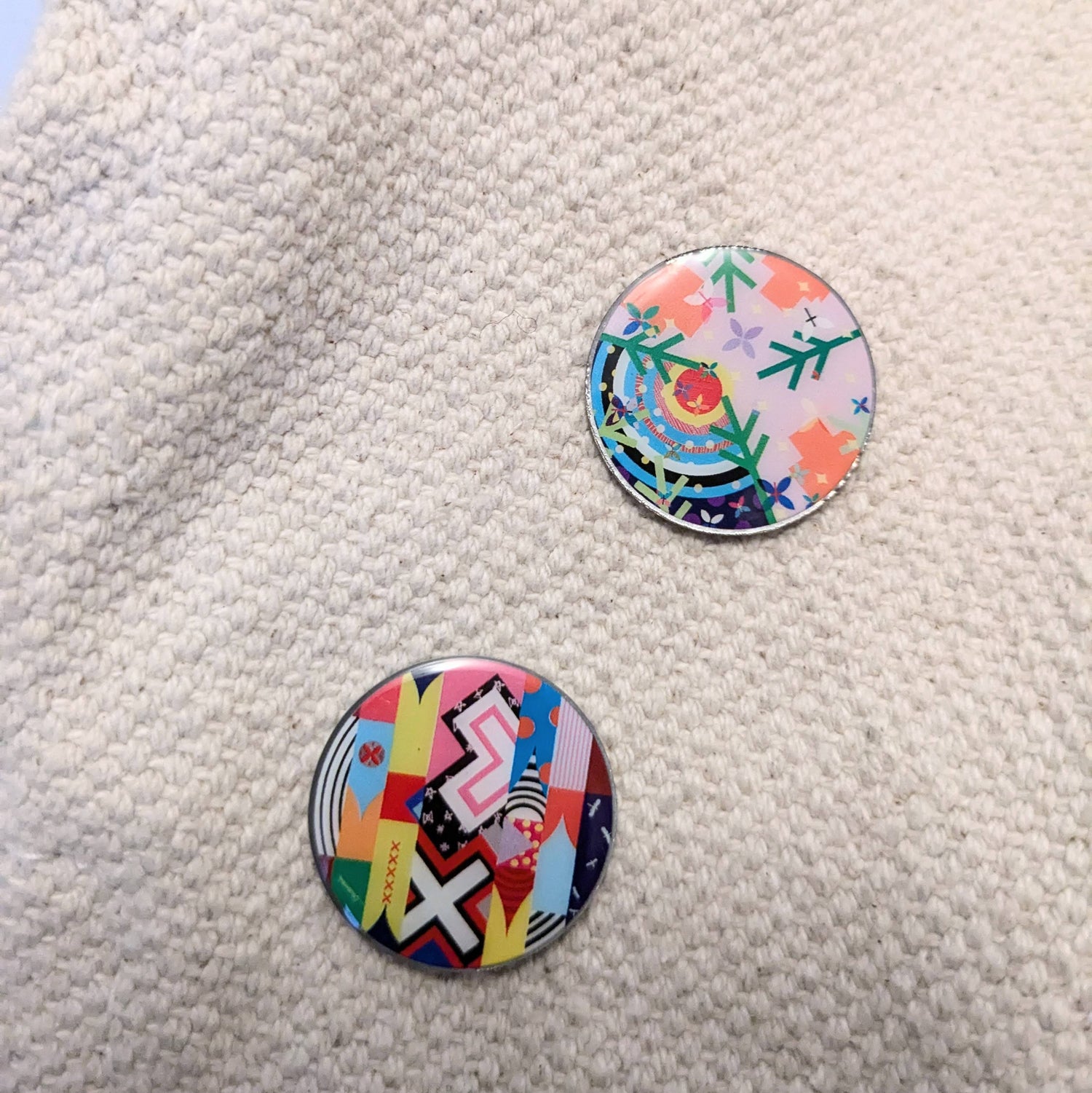 Jordan Bennett uses spray paint, acrylic paint, and reflective road signs to activate the shapes, colours, and composition of ancestral porcupine quillwork. This unique stainless steel offset printed enamel pin brings the vibrancy of Mi’kmaq visual language as a wearable artwork.