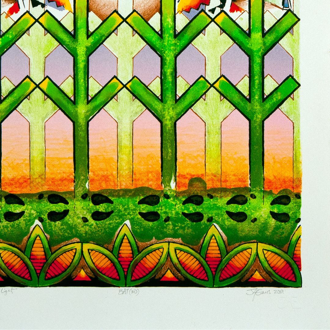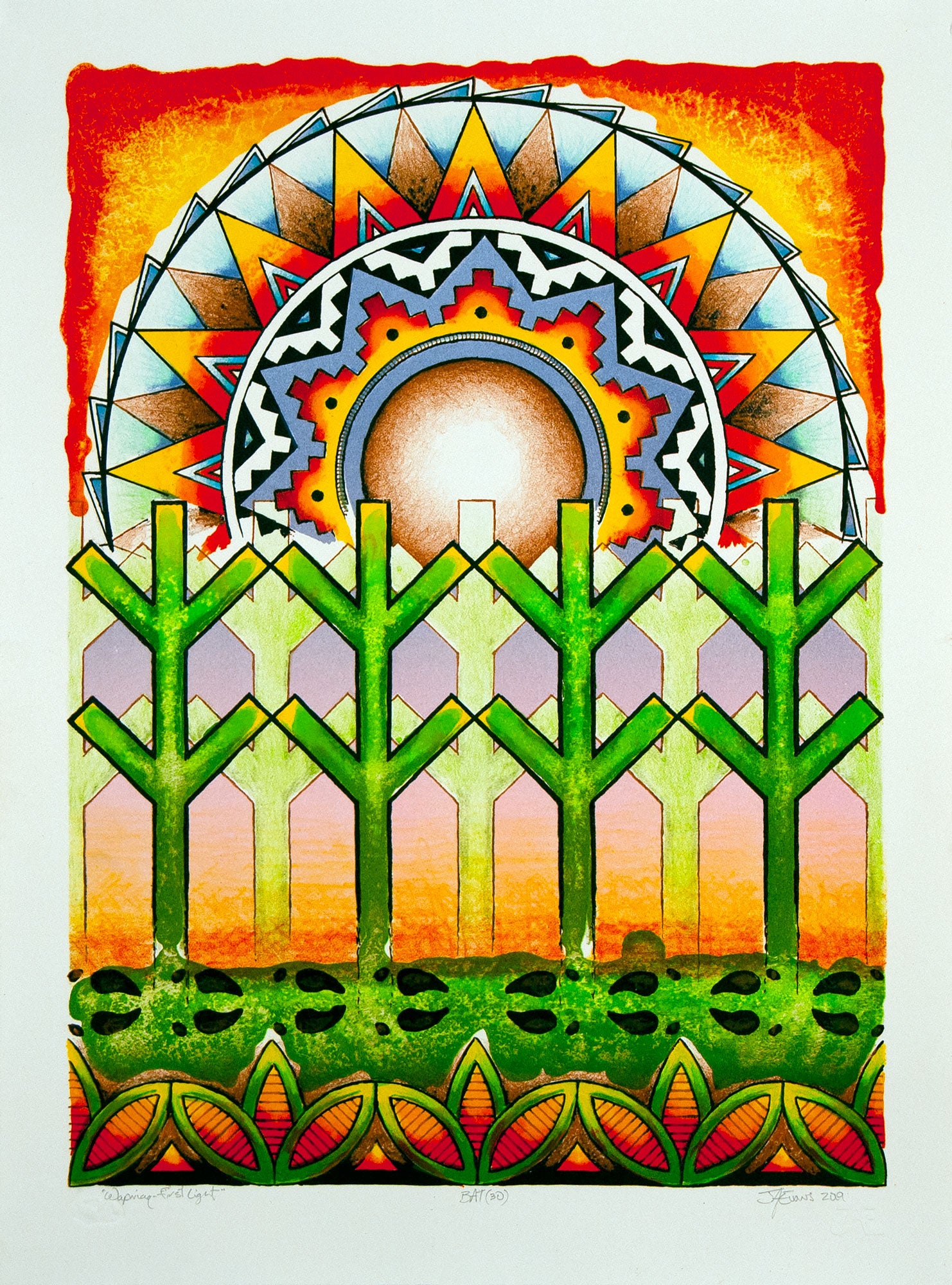 The artist works primarily as a painter and printmaker but also brings together his experience in film, design, and traditional hand poke tattooing to reach beyond Western ideologies as a means of expression and gift exchange. Jerry’s practice is deeply rooted in his Mi’kmaq heritage and his artistry comes alive in the creation of his own regalia for powwow dancing and in his commitment to sharing and learning with communities all over Mi’kma’ki.